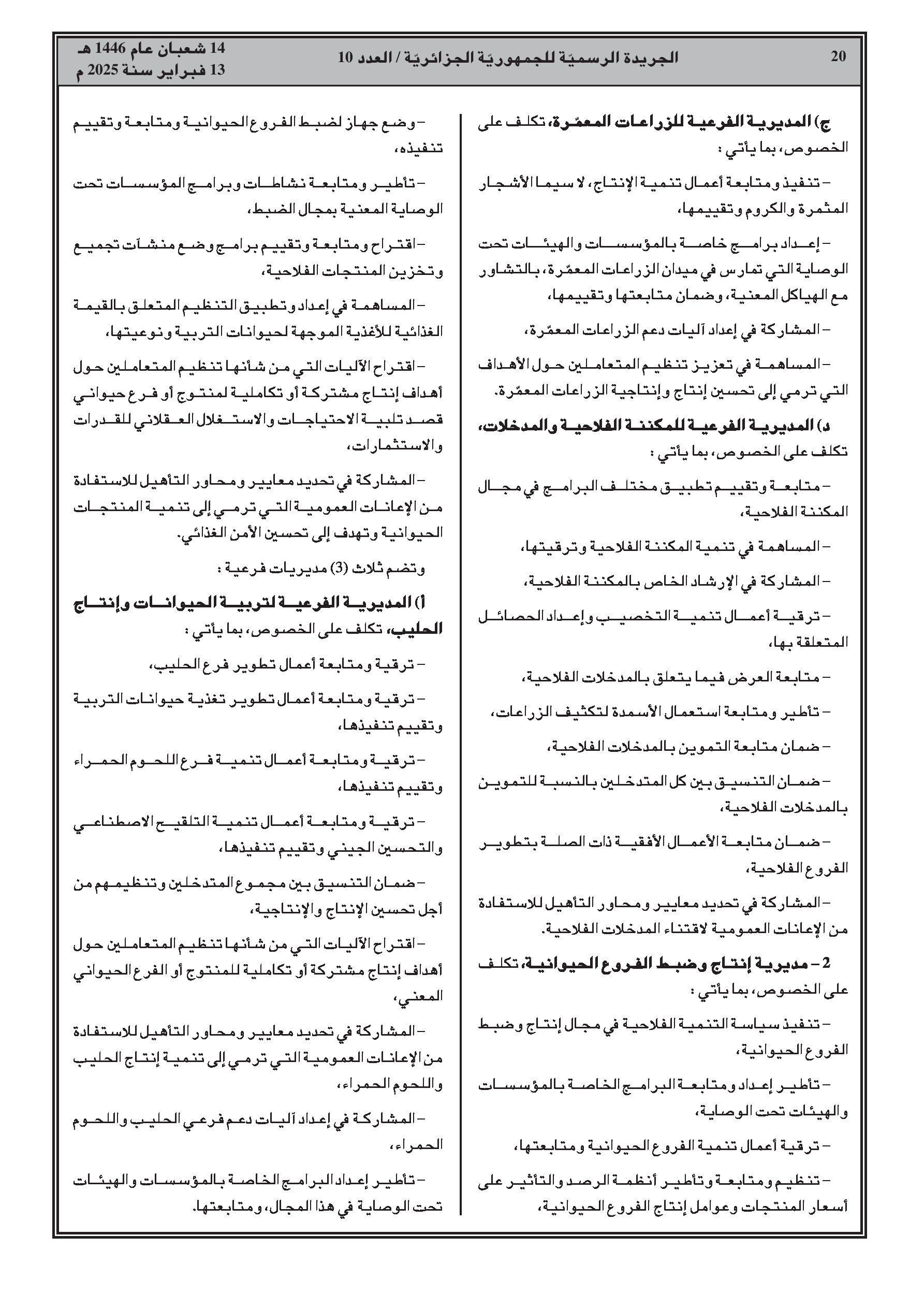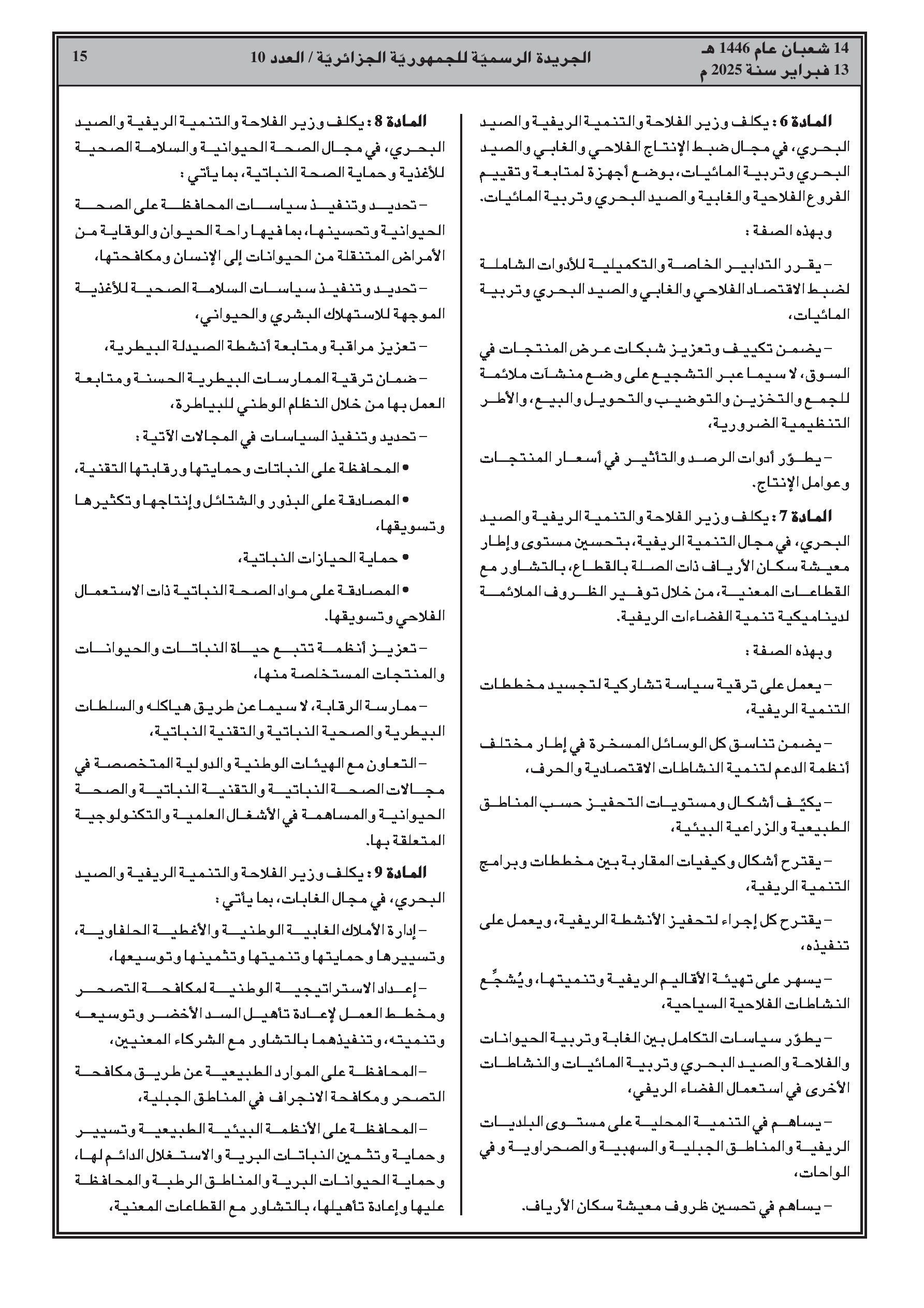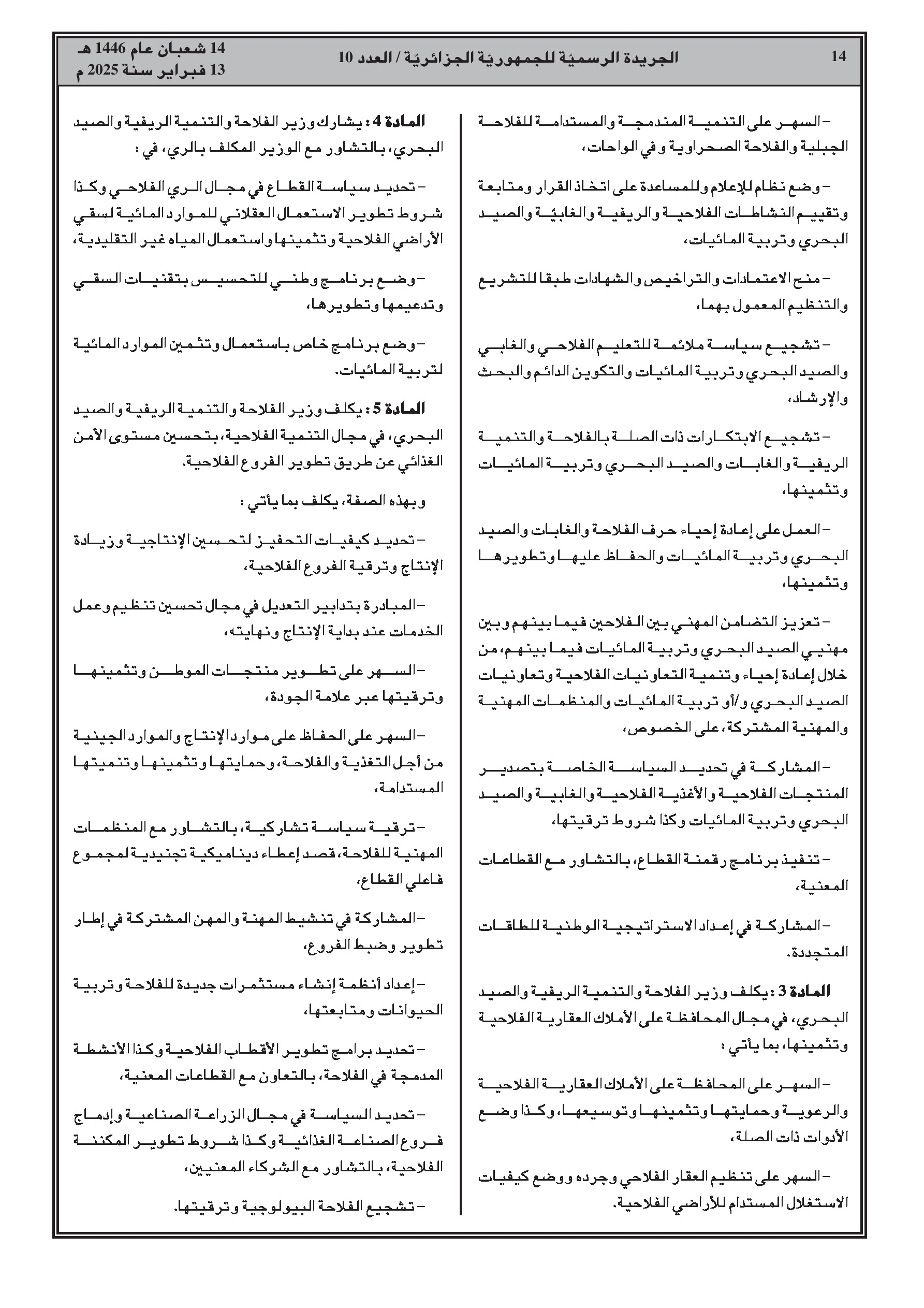 يفصل مسؤوليات الوزير في السياسة الوطنية في مجالات الفلاحة، التنمية الريفية، الغابات، الصيد البحري، وتربية المائيات، بما في ذلك الأمن الغذائي، إدارة الموارد، وتنمية القطاع. يلغي المرسومين 20-82 (الصيد البحري) و 20-128 (الفلاحة).
