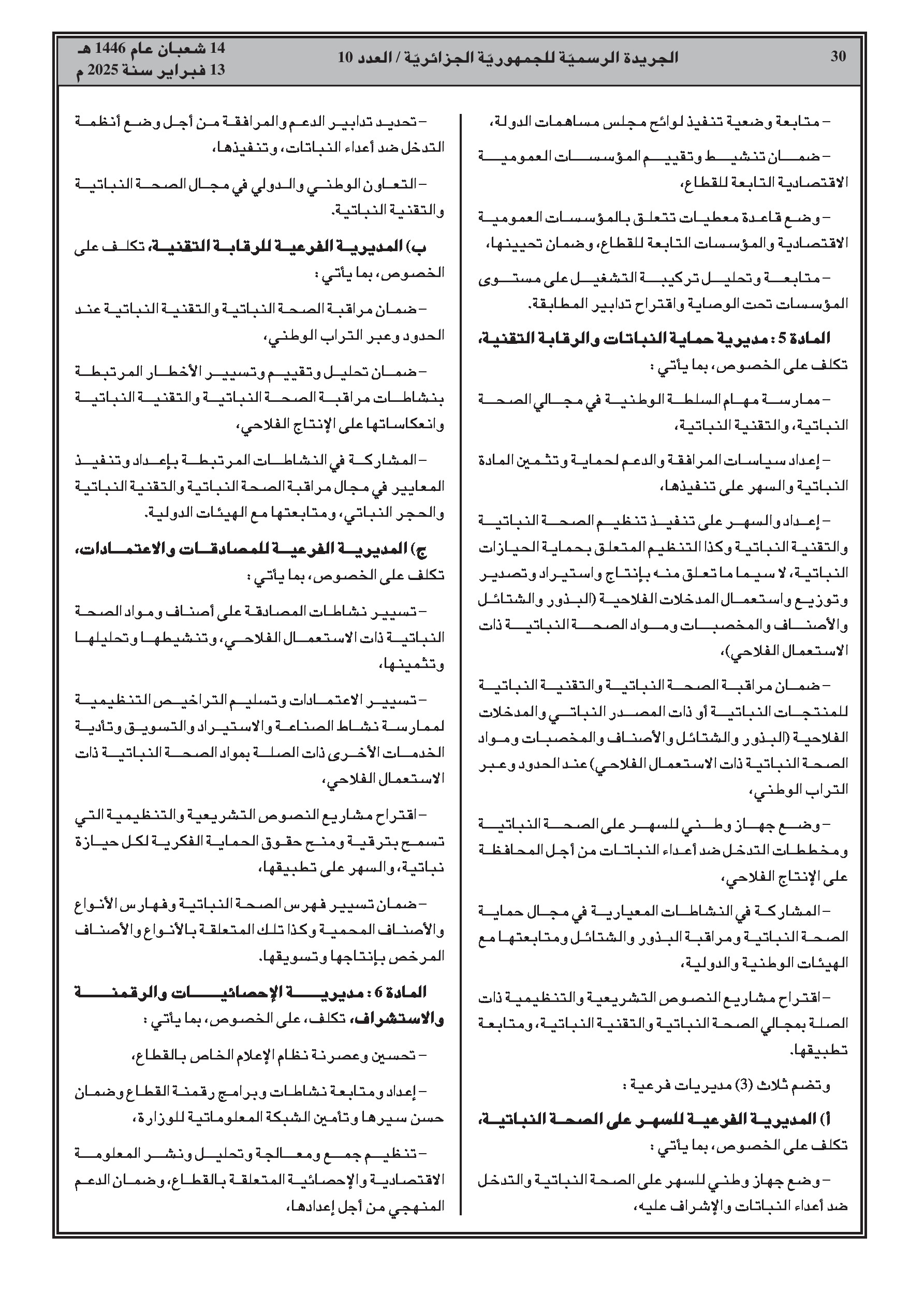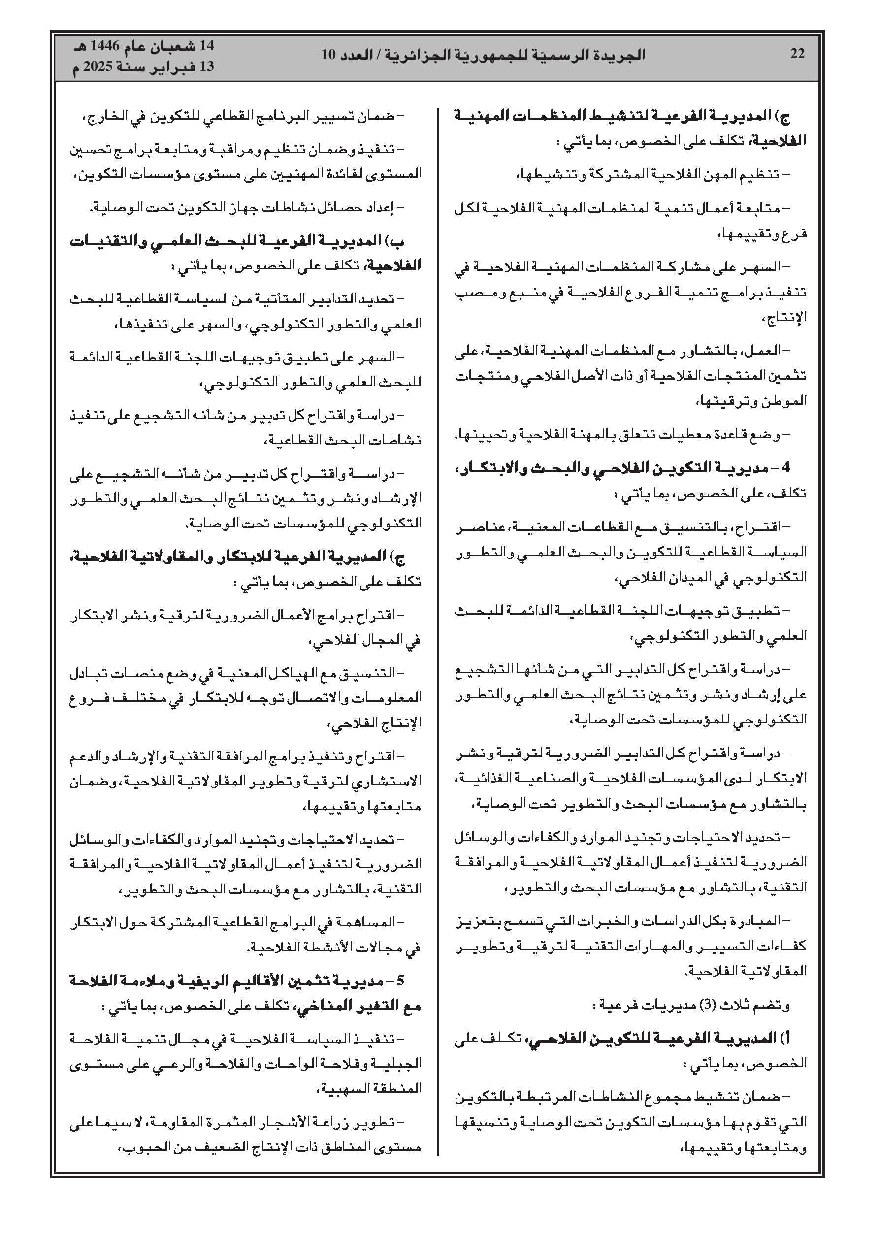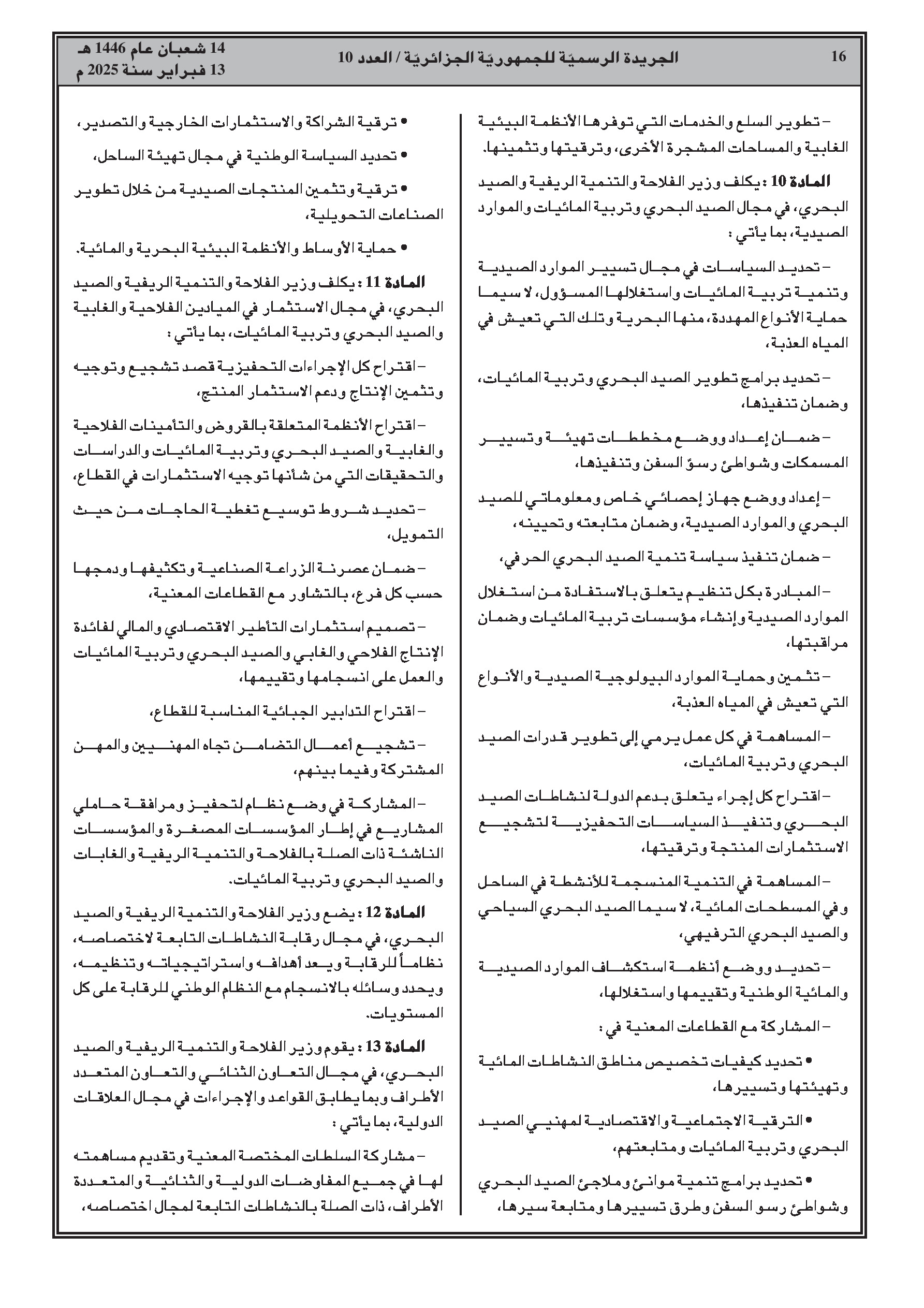 يفصل مسؤوليات الوزير في السياسة الوطنية في مجالات الفلاحة، التنمية الريفية، الغابات، الصيد البحري، وتربية المائيات، بما في ذلك الأمن الغذائي، إدارة الموارد، وتنمية القطاع. يلغي المرسومين 20-82 (الصيد البحري) و 20-128 (الفلاحة).