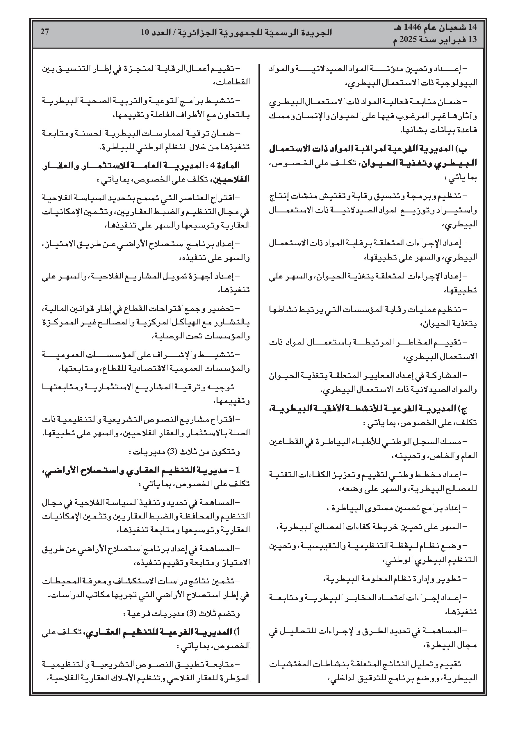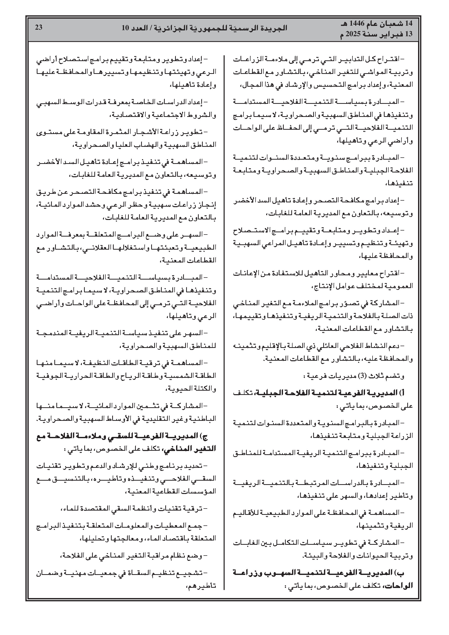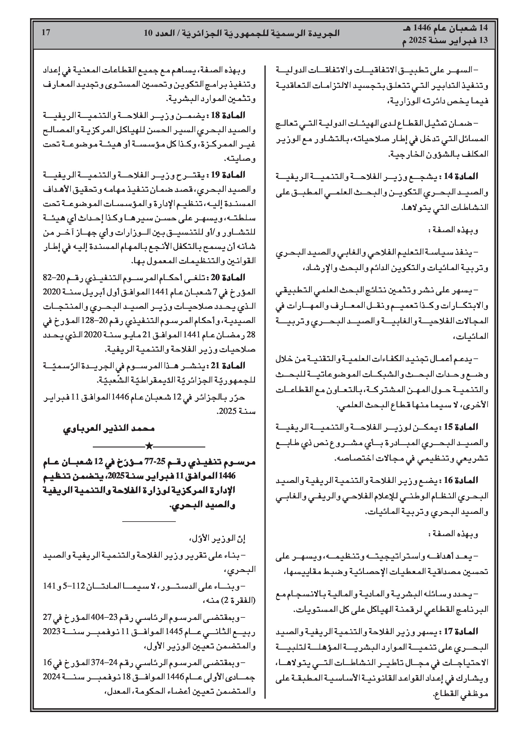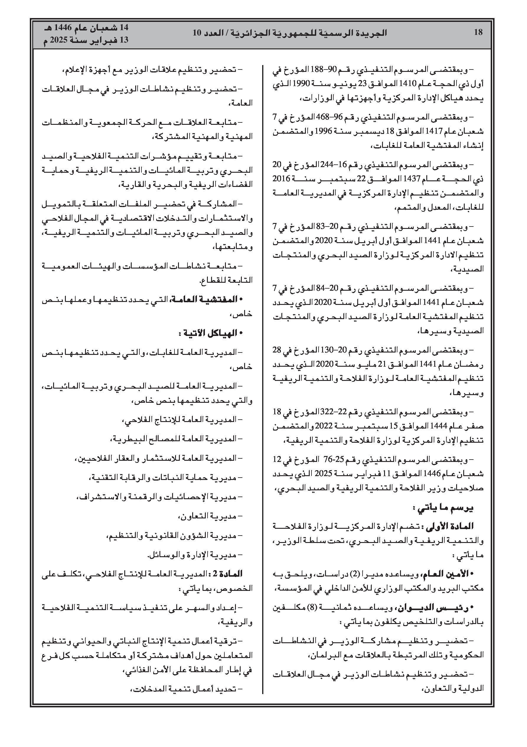 المرسوم التنفيذي رقم 25-76 يحدد صلاحيات وزير الفلاحة والتنمية الريفية والصيد البحري، وتشمل الفلاحة، التنمية الريفية، الغابات، الصيد البحري، وتربية المائيات.