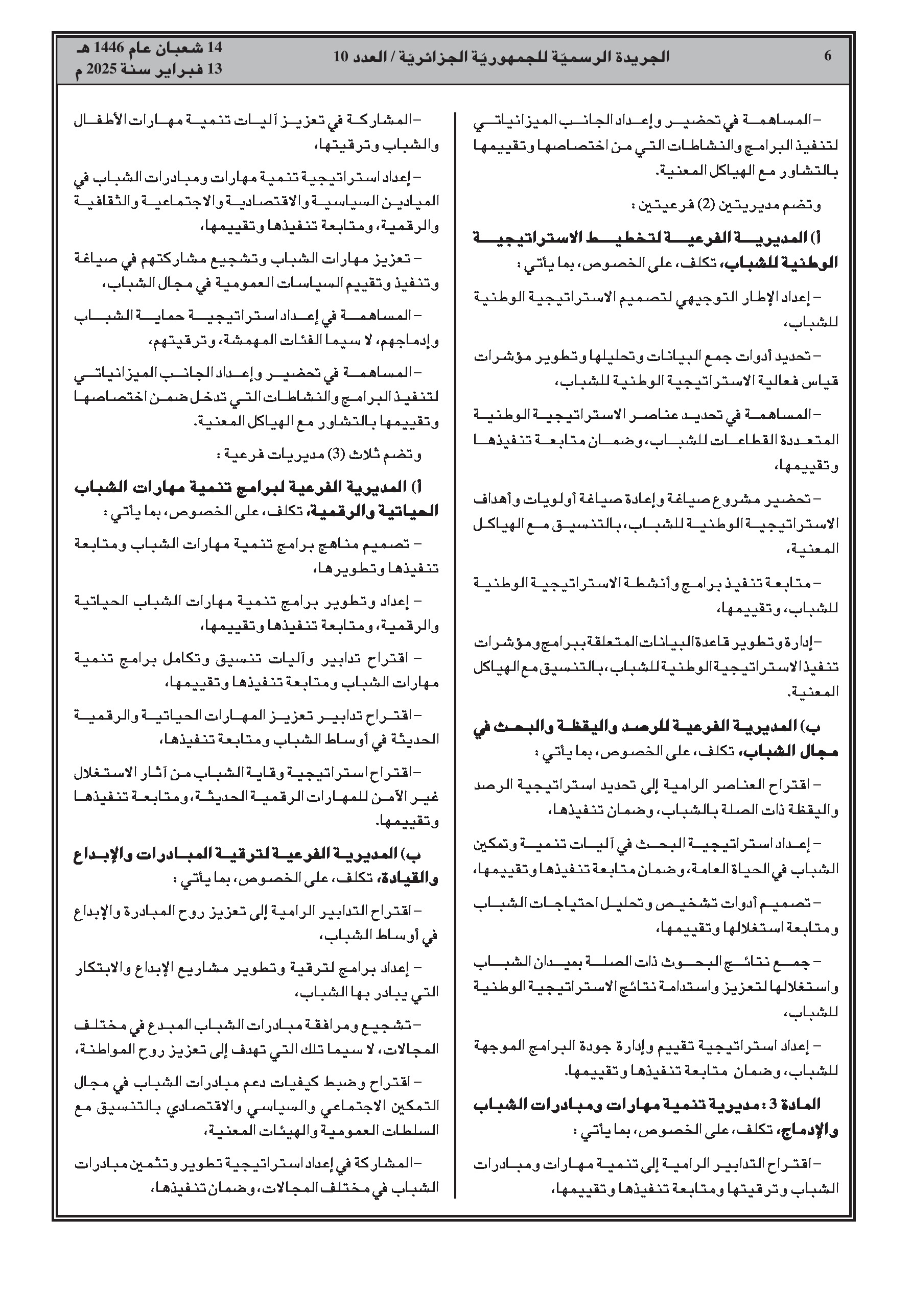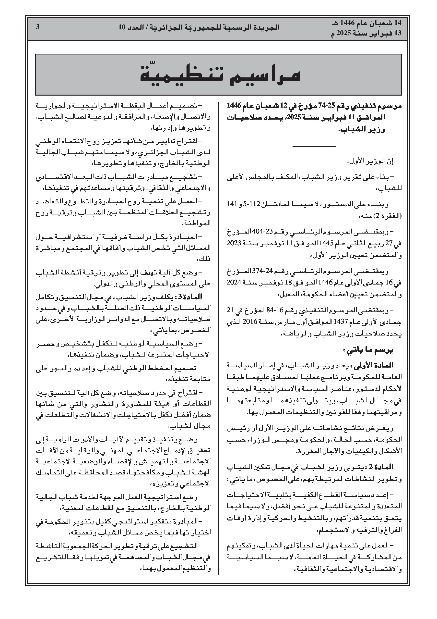 المرسوم التنفيذي رقم 25-74 يحدد صلاحيات ومسؤوليات وزير الشباب، مع التركيز على تمكين الشباب وتنمية الأنشطة.