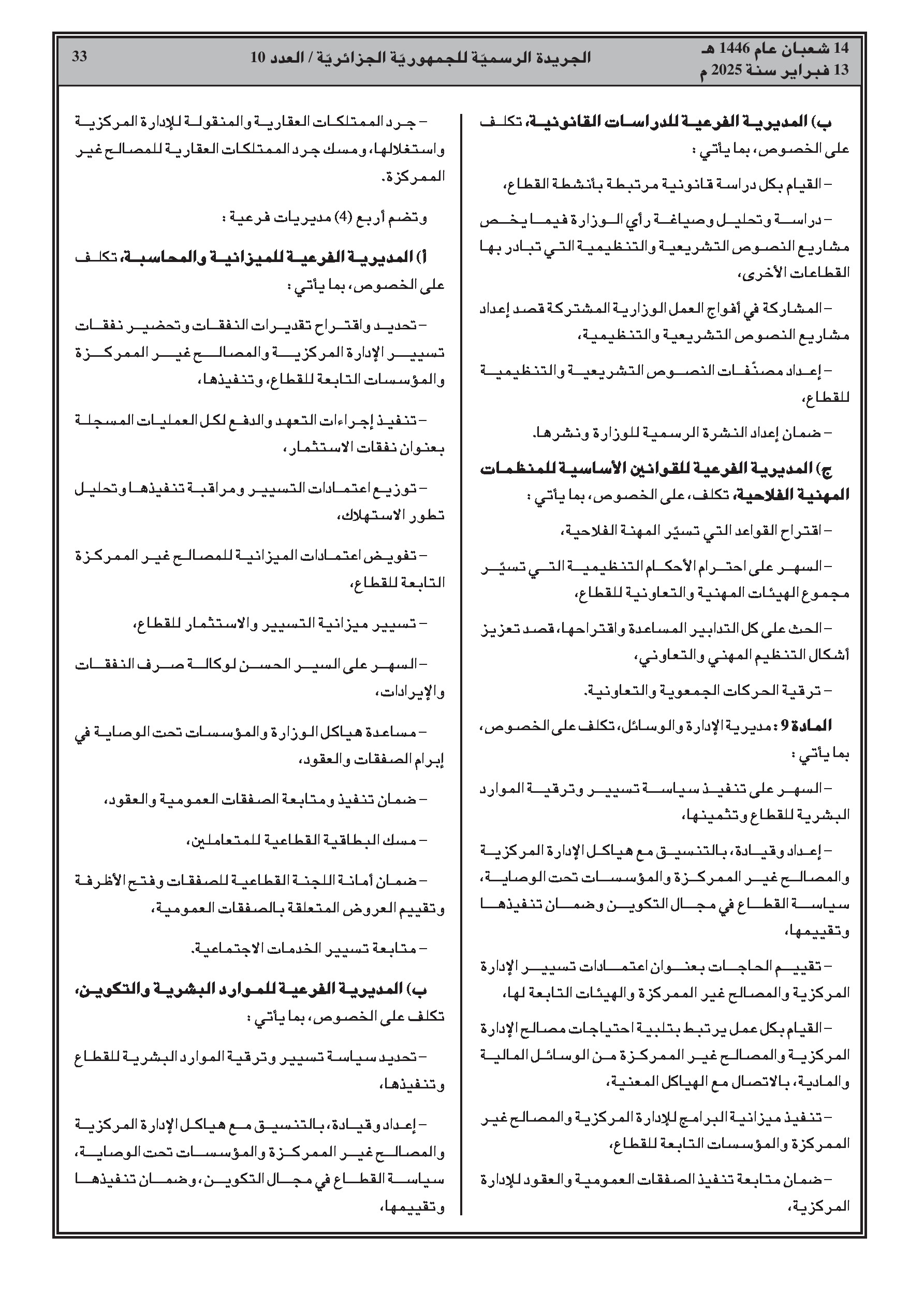 ينظم الإدارة المركزية، وتشمل الأمين العام، رئيس الديوان، المفتشية العامة، والمديريات العامة للغابات، الصيد البحري وتربية المائيات، الإنتاج الفلاحي، المصالح البيطرية، الاستثمار والعقار الفلاحي، حماية النباتات، الإحصاء والرقمنة، التعاون، الشؤون القانونية، والإدارة والوسائل. يلغي المراسيم 20-83، 20-84 (إدارة الصيد البحري)، و 22-322 (إدارة الفلاحة).