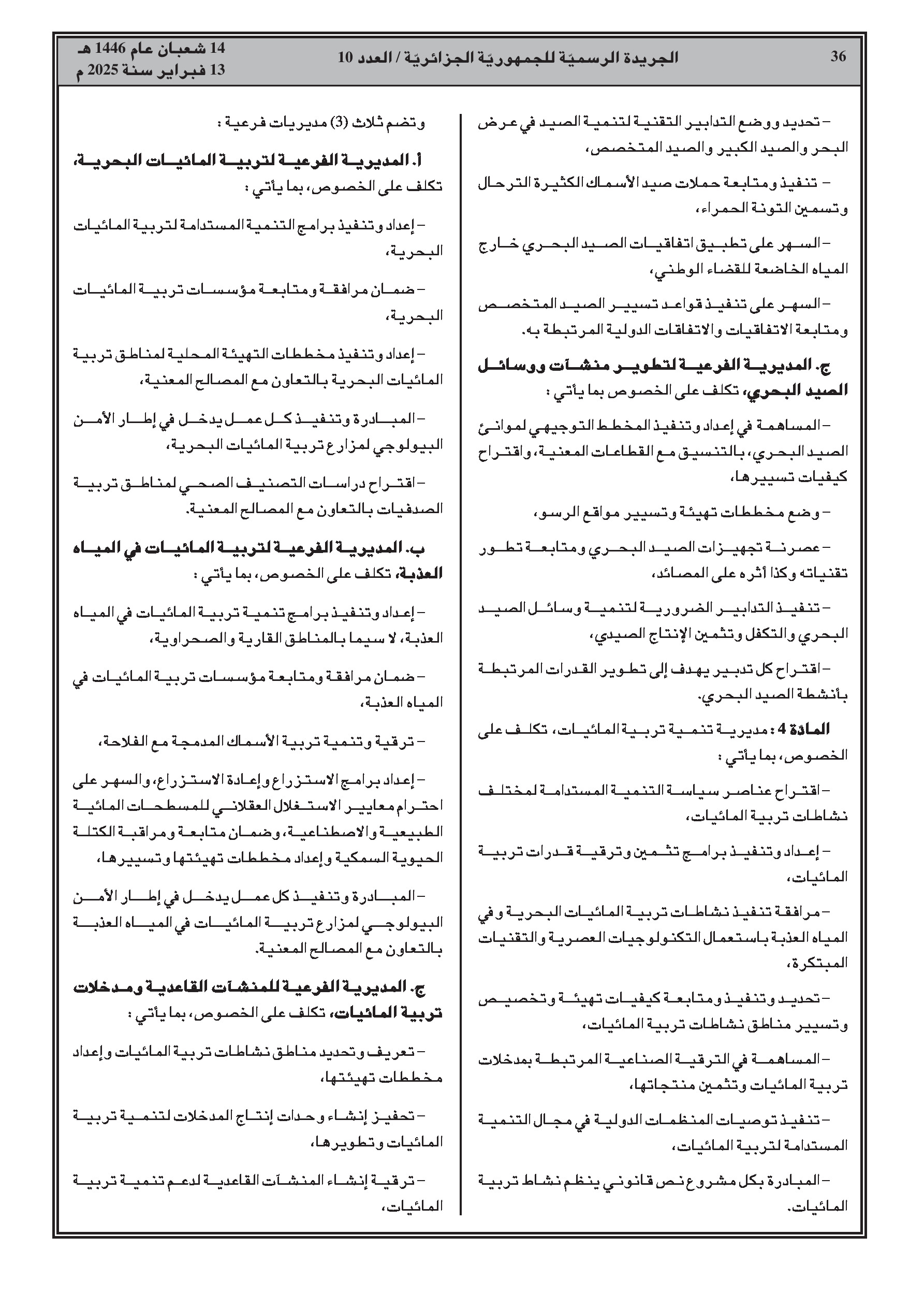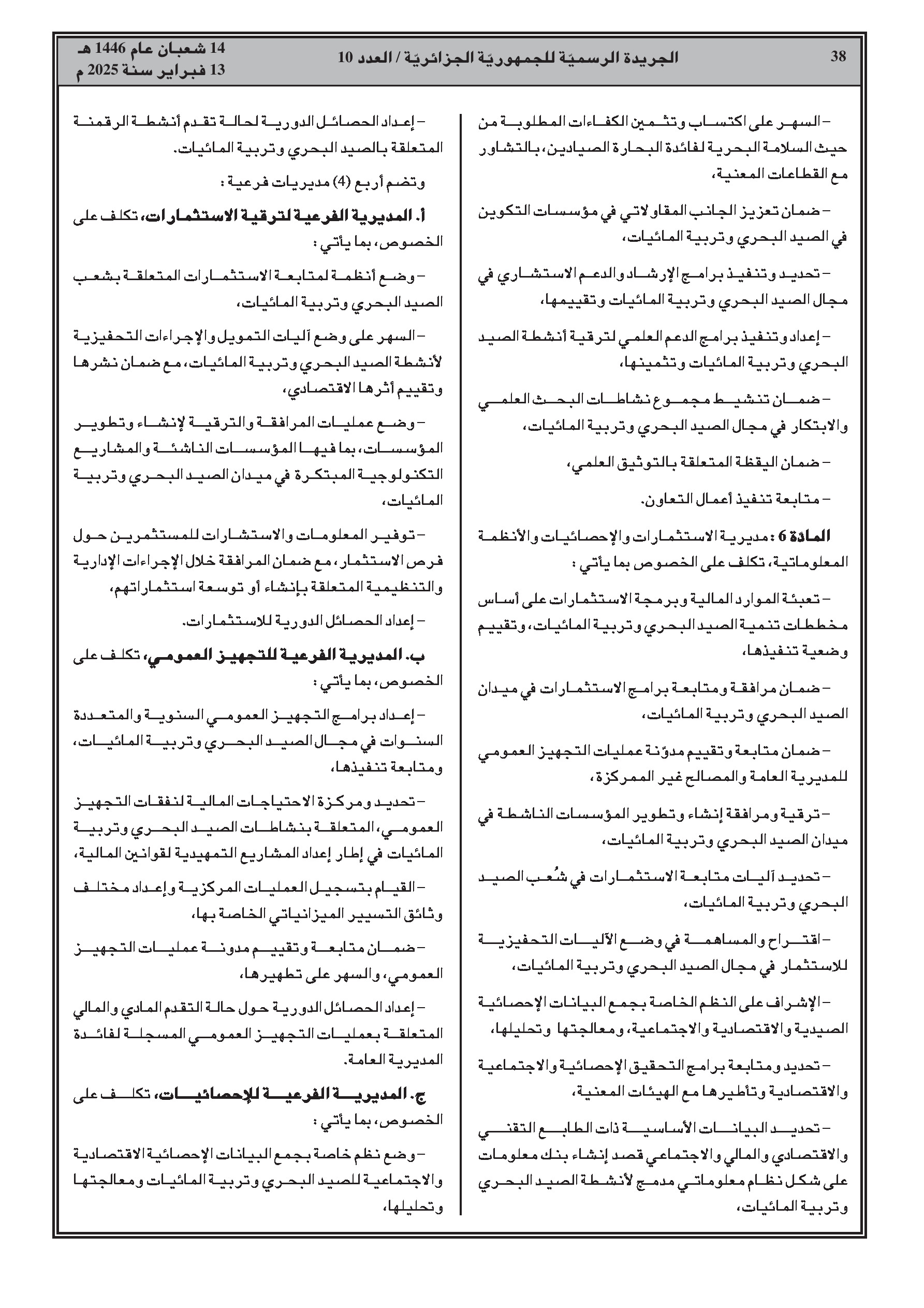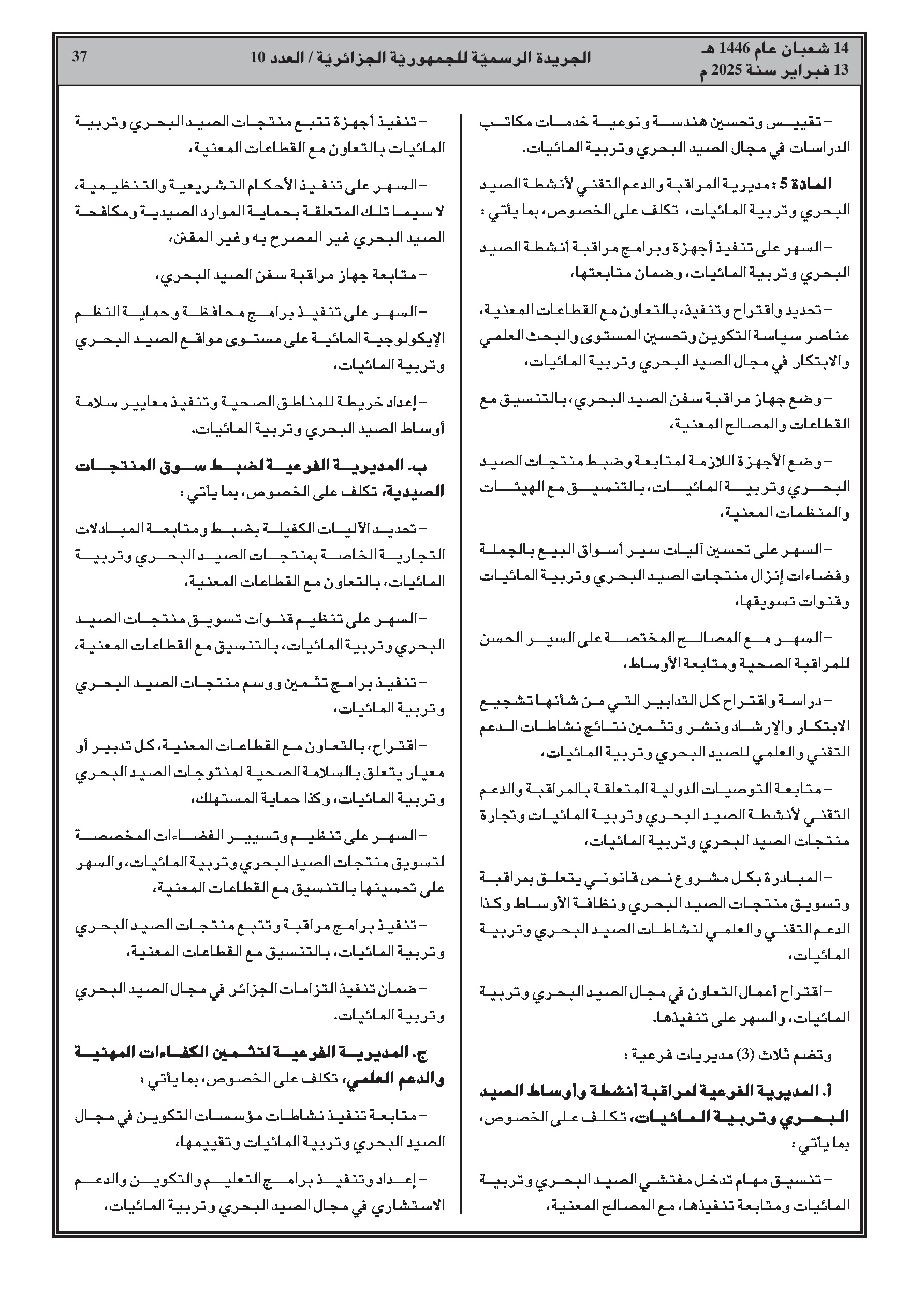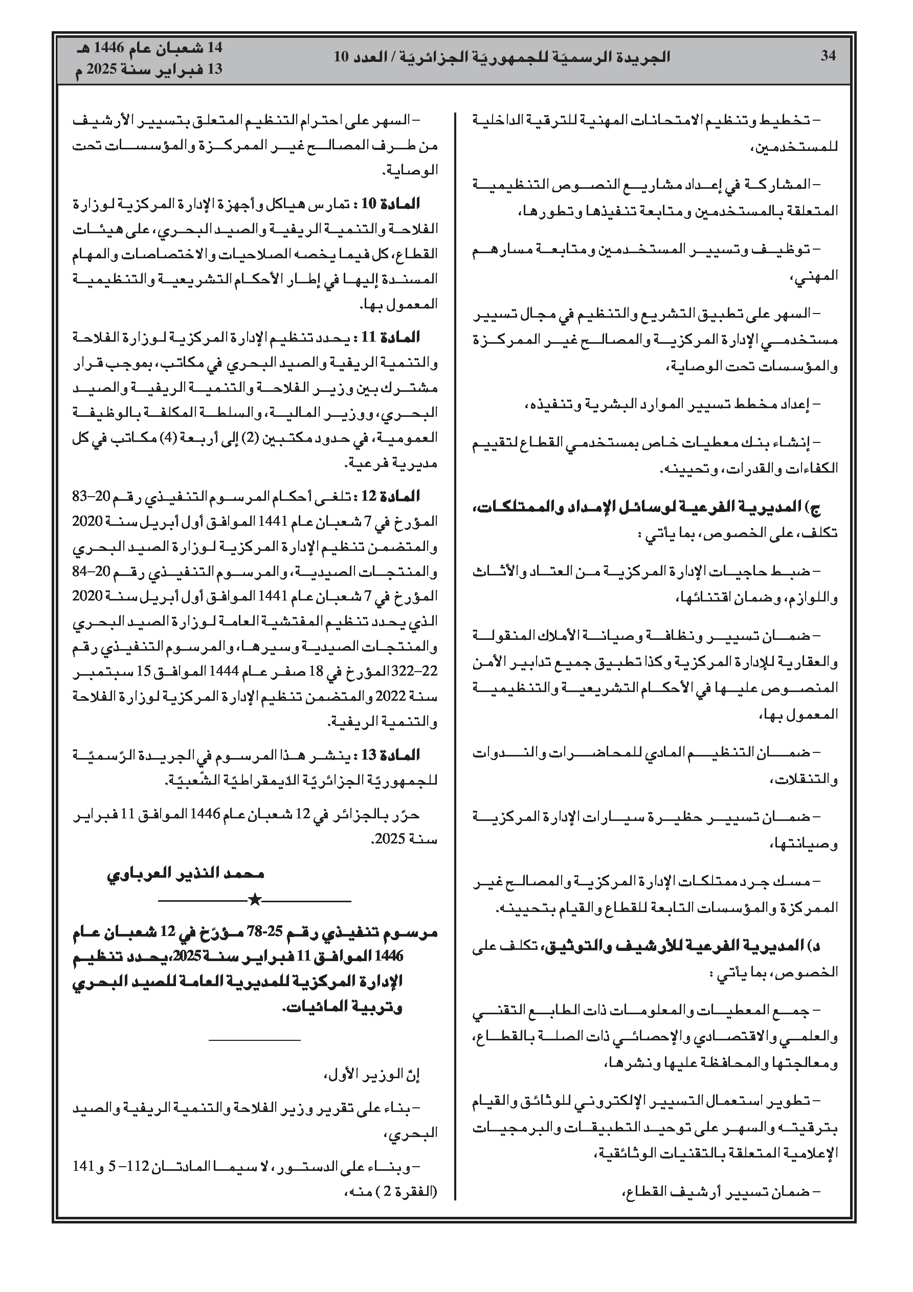 المرسوم التنفيذي رقم 25-78 يحدد تنظيم الإدارة المركزية للمديرية العامة للصيد البحري وتربية المائيات.