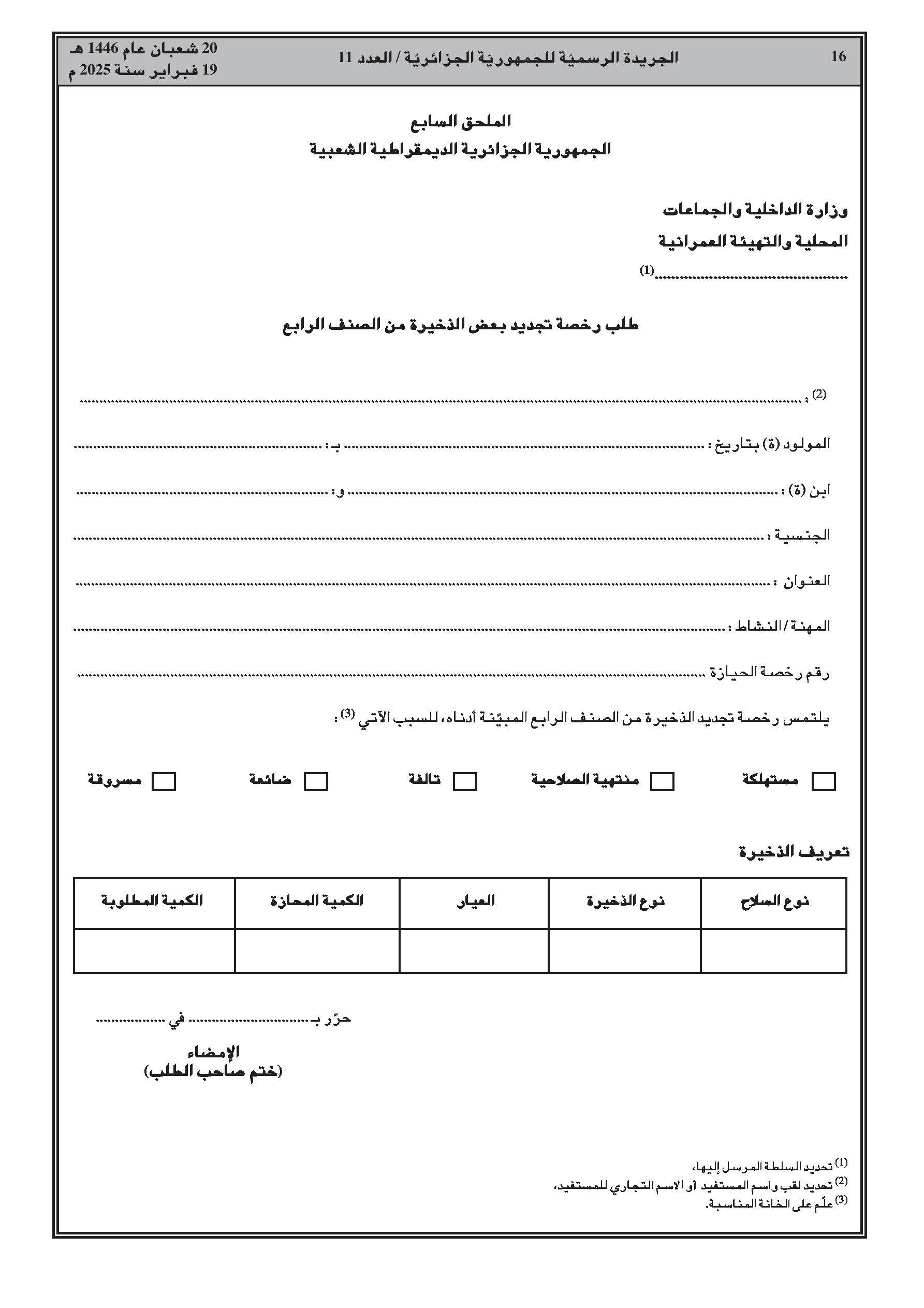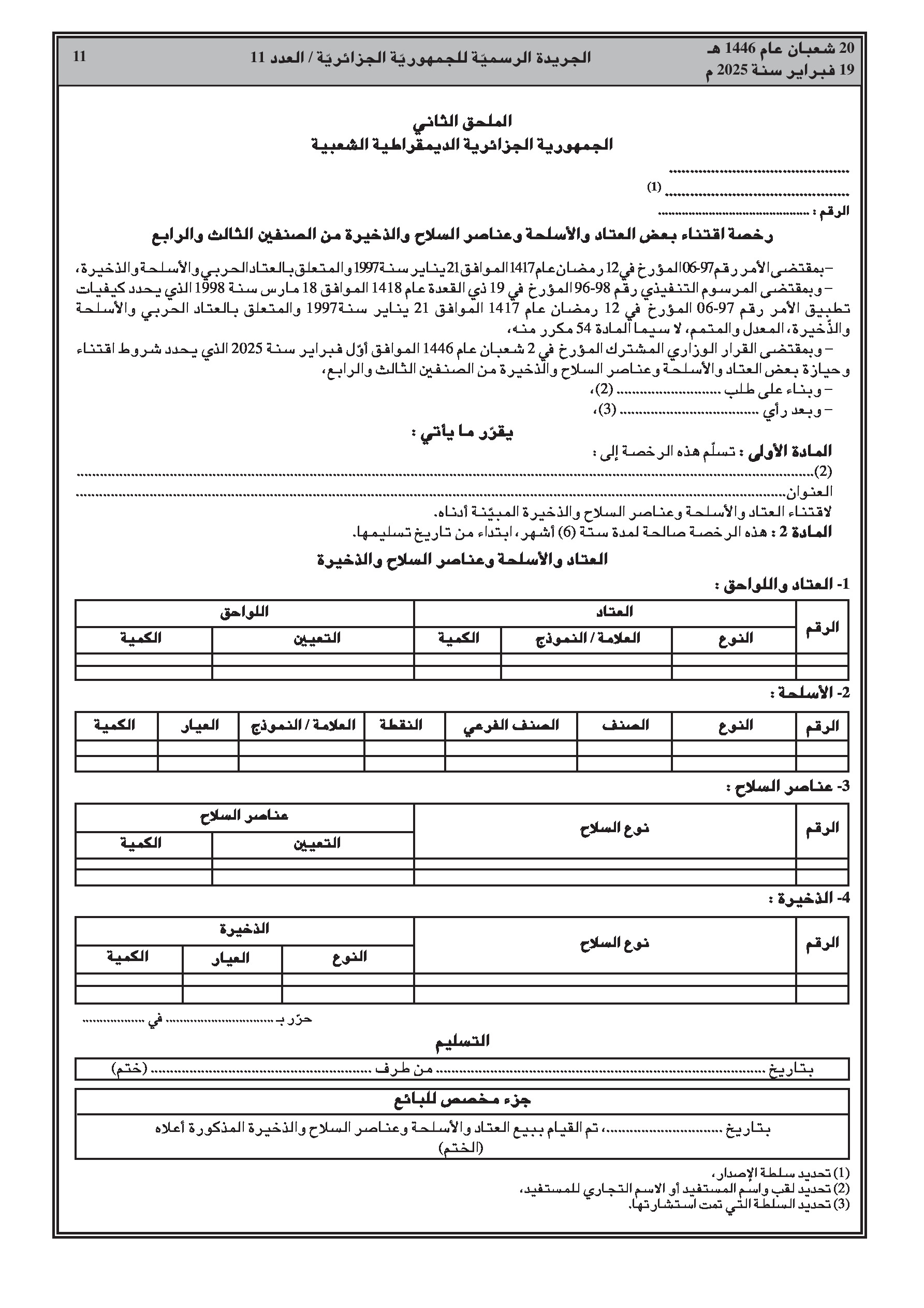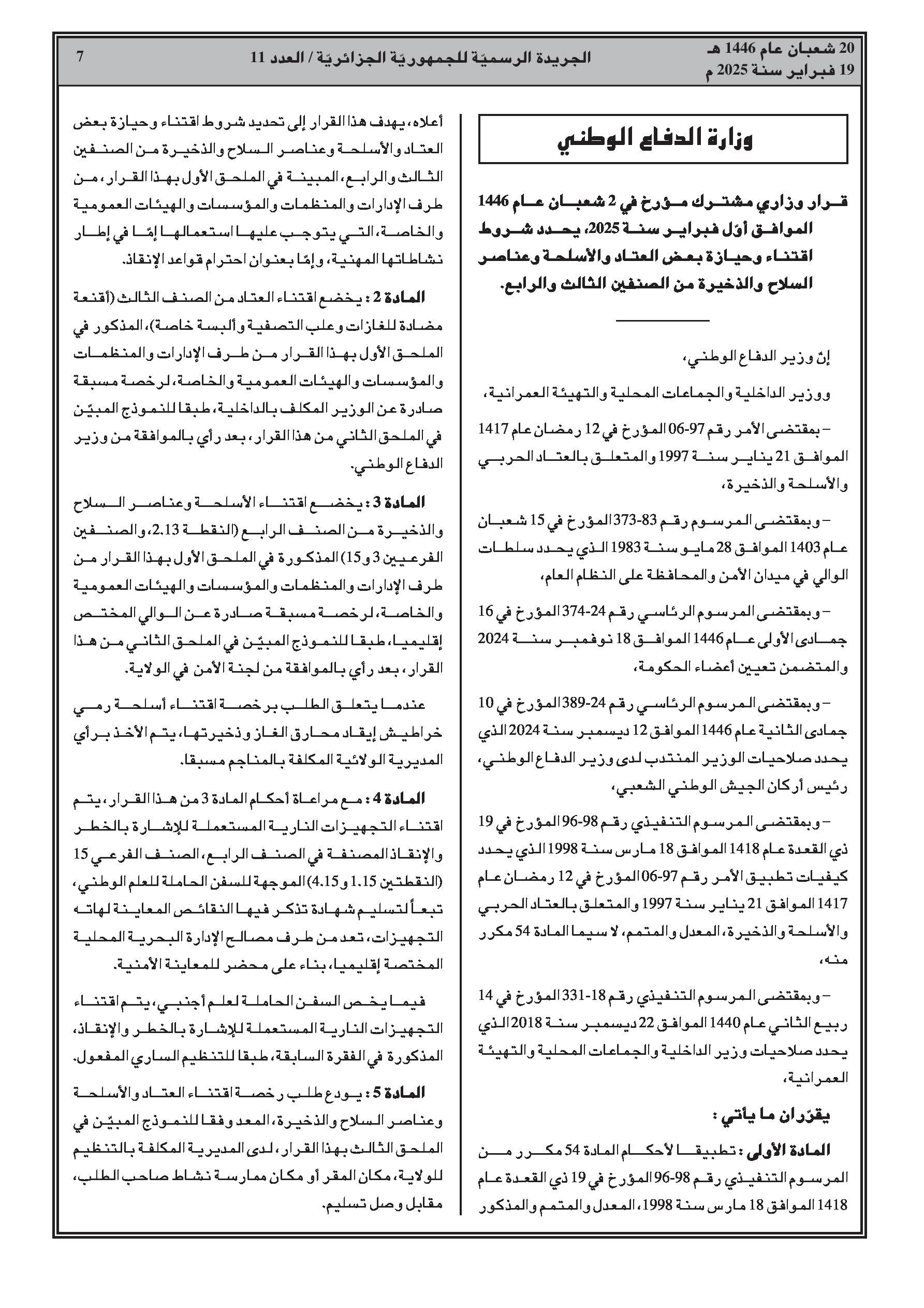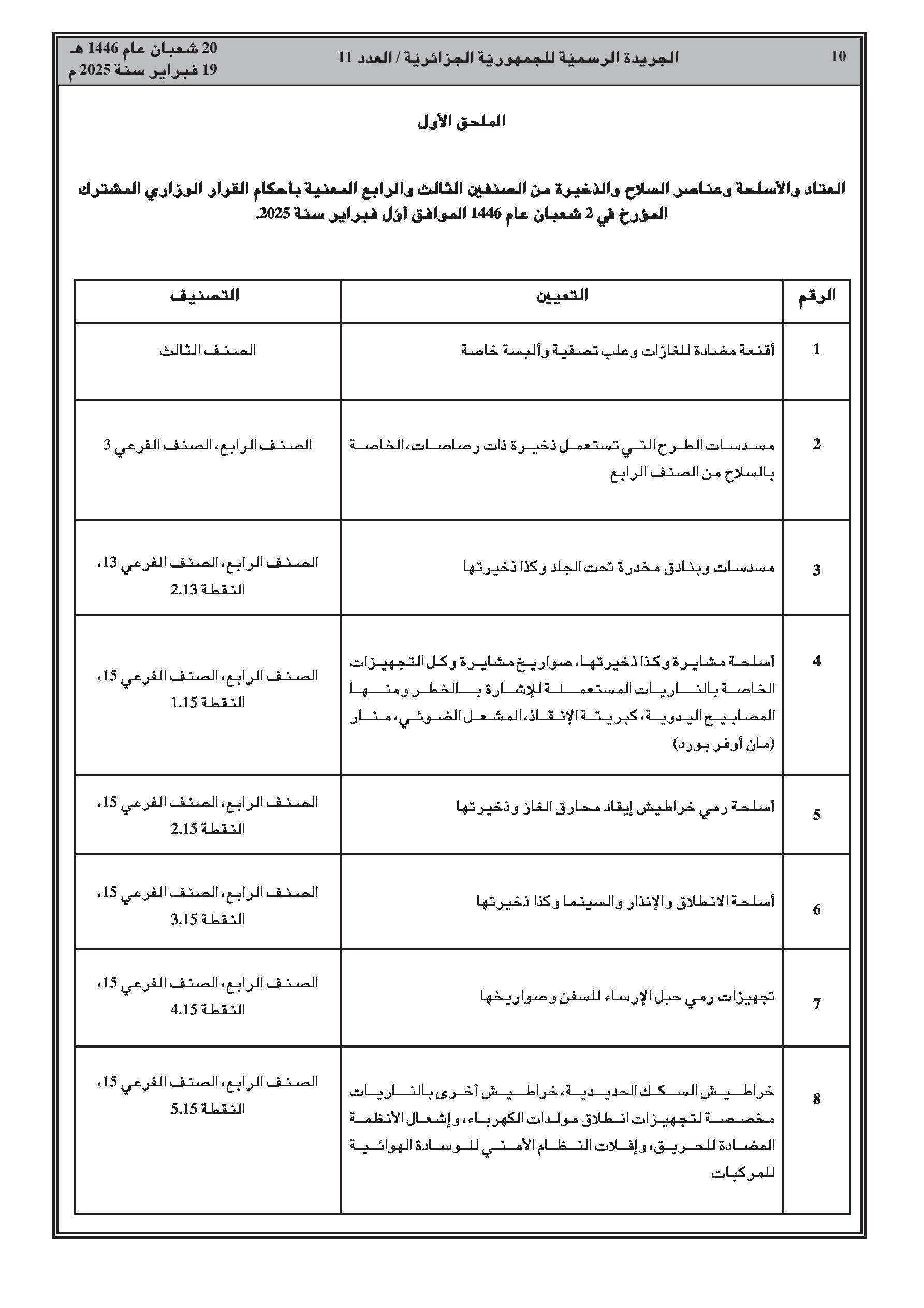 - قرار وزاري مشترك يحدد شروط حيازة وحمل بعض العتاد والأسلحة وعناصر الأسلحة والذخائر من الصنفين 3 و4.