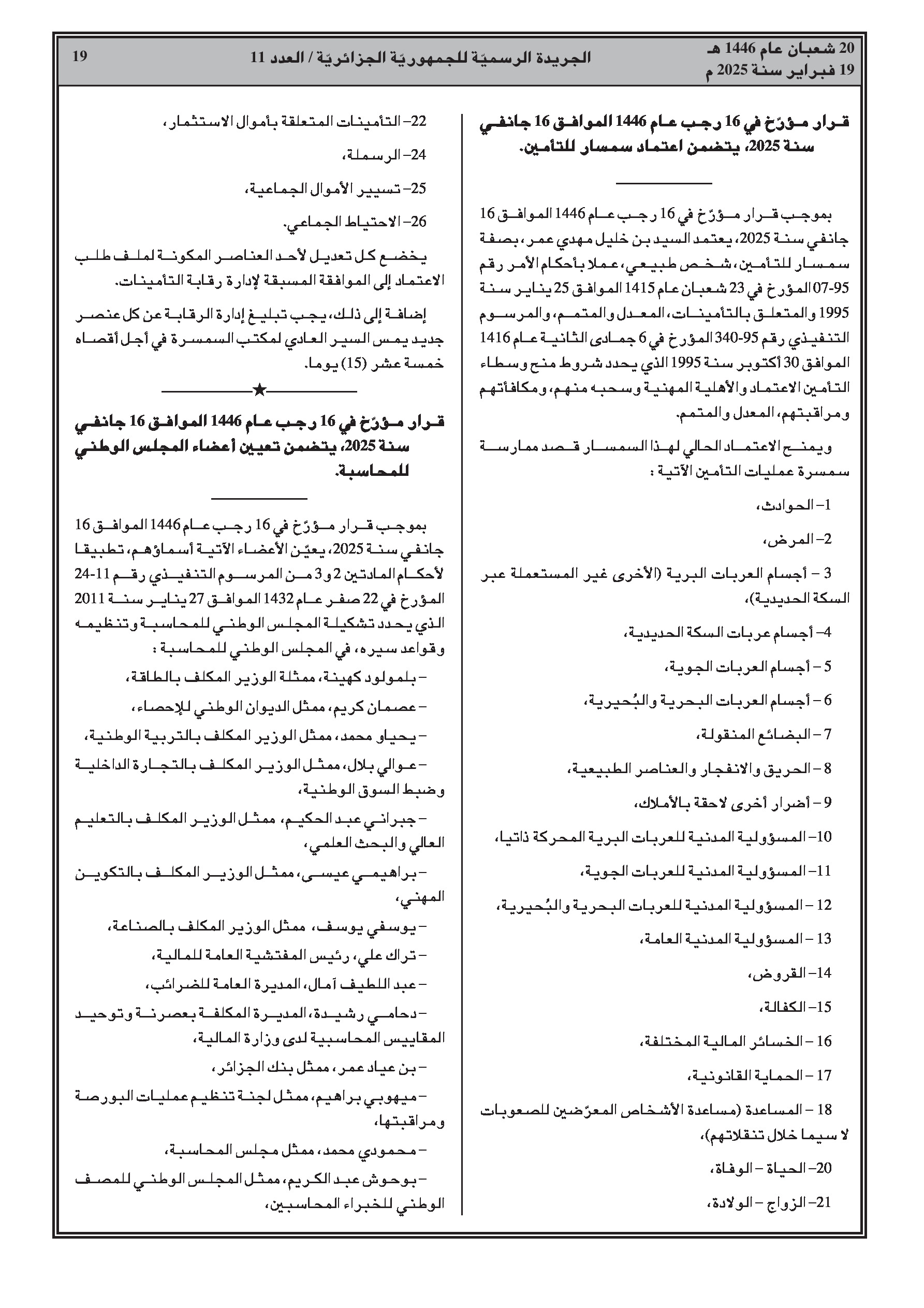 - قرارات اعتماد شركات وساطة في التأمين (إكسبرت للتأمينات، الأوروبية الإفريقية لوساطة التأمين، إنشورنس بروكراج أند سيرفيسز). - قرار اعتماد وسيط تأمين. - قرار تعيين أعضاء المجلس الوطني للمحاسبة.