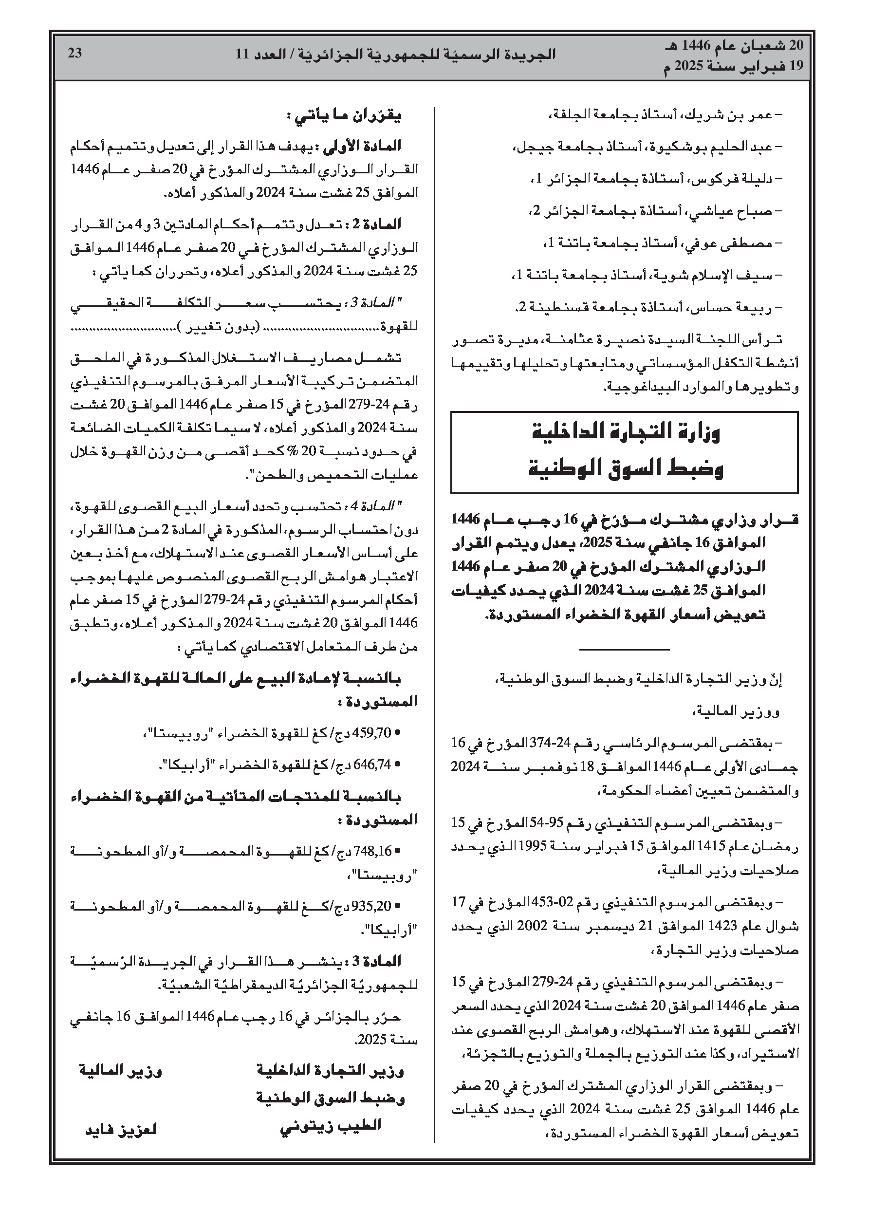 - قرار وزاري مشترك يعدل ويتمم القرار الوزاري المشترك المحدد لكيفيات تعويض أسعار البن الأخضر المستورد.