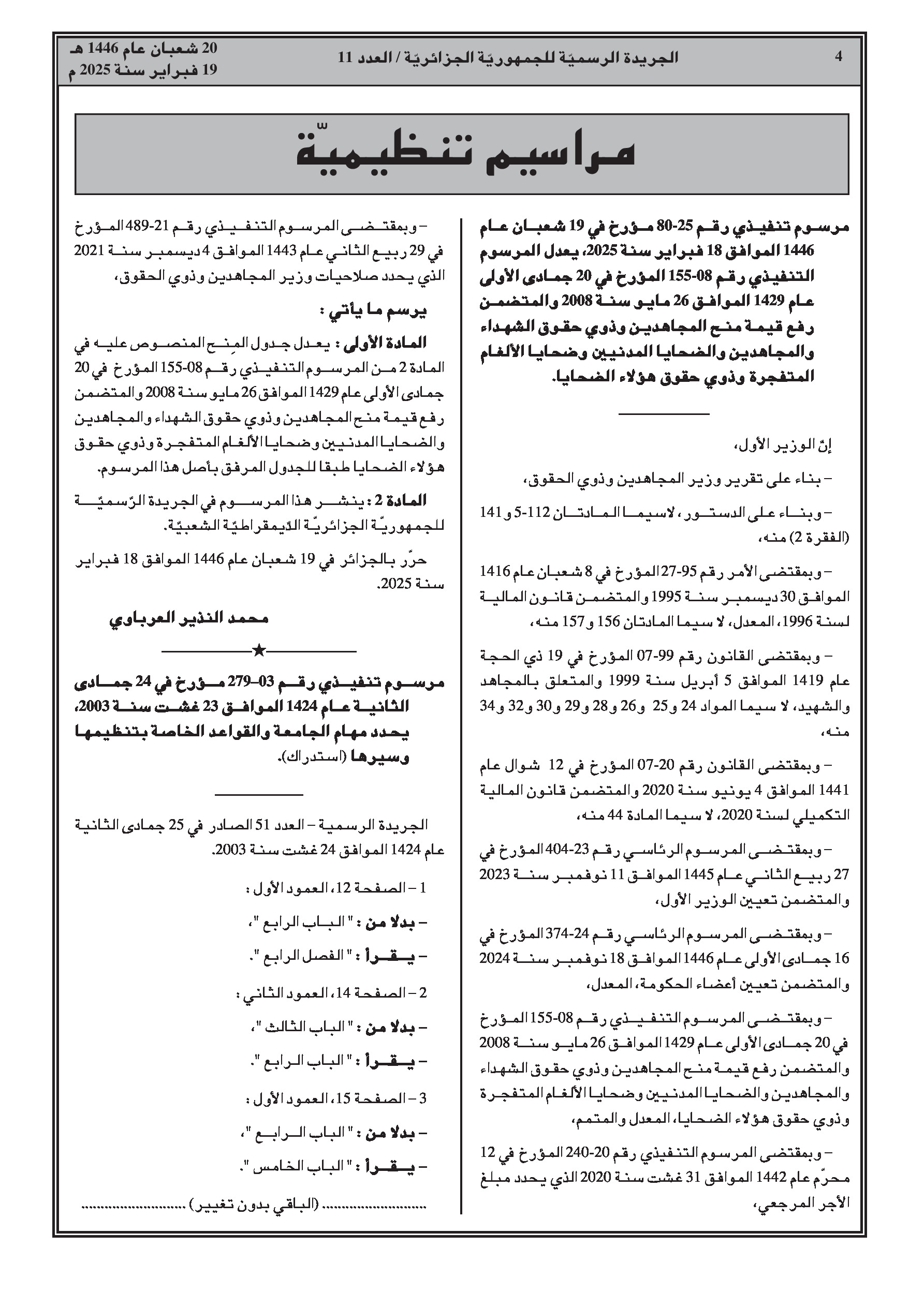 - مرسوم تنفيذي رقم 25-80 يعدل المرسوم التنفيذي رقم 08-155 المتعلق بتثمين مبلغ معاشات المجاهدين وذوي حقوق الشهداء والمجاهدين وضحايا الأعمال الإرهابية وضحايا المتفجرات وذويهم. - مرسوم تنفيذي رقم 03-279 يحدد مهام وقواعد تنظيم وسير الجامعة (استدراك).