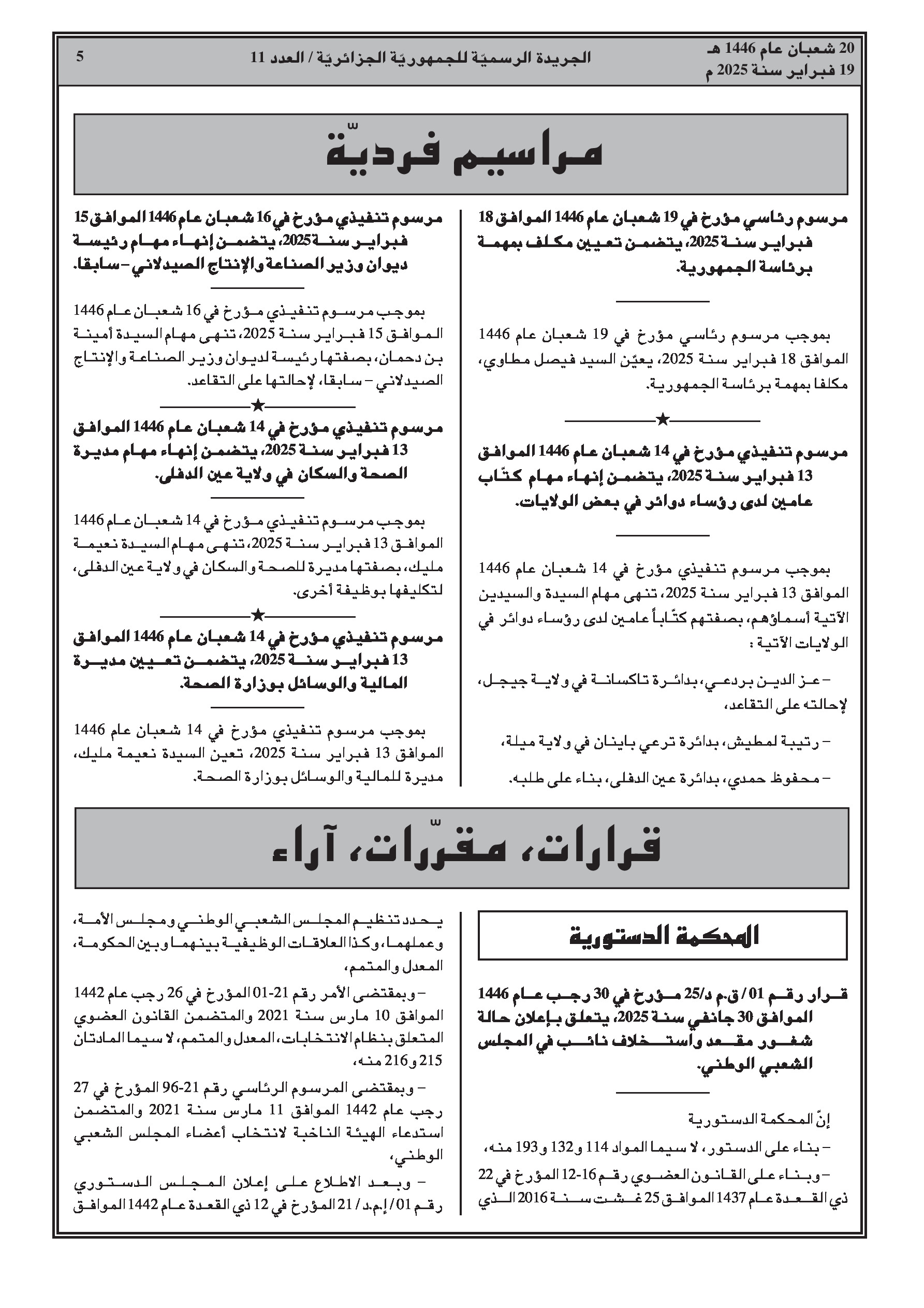 - مرسوم رئاسي يتضمن تعيين مكلف بمهمة برئاسة الجمهورية. - مراسيم تنفيذية تتضمن إنهاء مهام أمناء عامين لدى رؤساء دوائر في بعض الولايات. - مرسوم تنفيذي يتضمن إنهاء مهام رئيسة ديوان الوزير السابق للصناعة والإنتاج الصيدلاني. - مرسوم تنفيذي يتضمن إنهاء مهام مديرة الصحة والسكان لولاية عين الدفلى. - مرسوم تنفيذي يتضمن تعيين مديرة المالية والوسائل بوزارة الصحة.