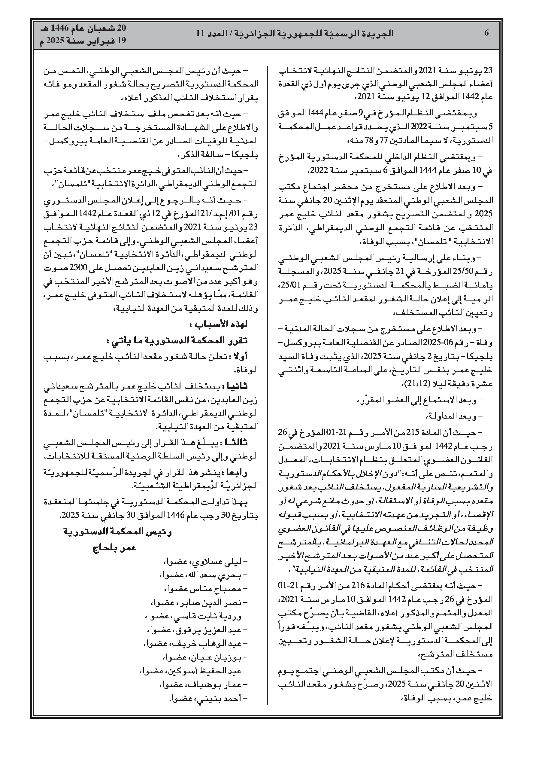 - قرار رقم 01/ق.م.د/25 يتعلق بإعلان شغور مقعد واستخلاف نائب بالمجلس الشعبي الوطني.