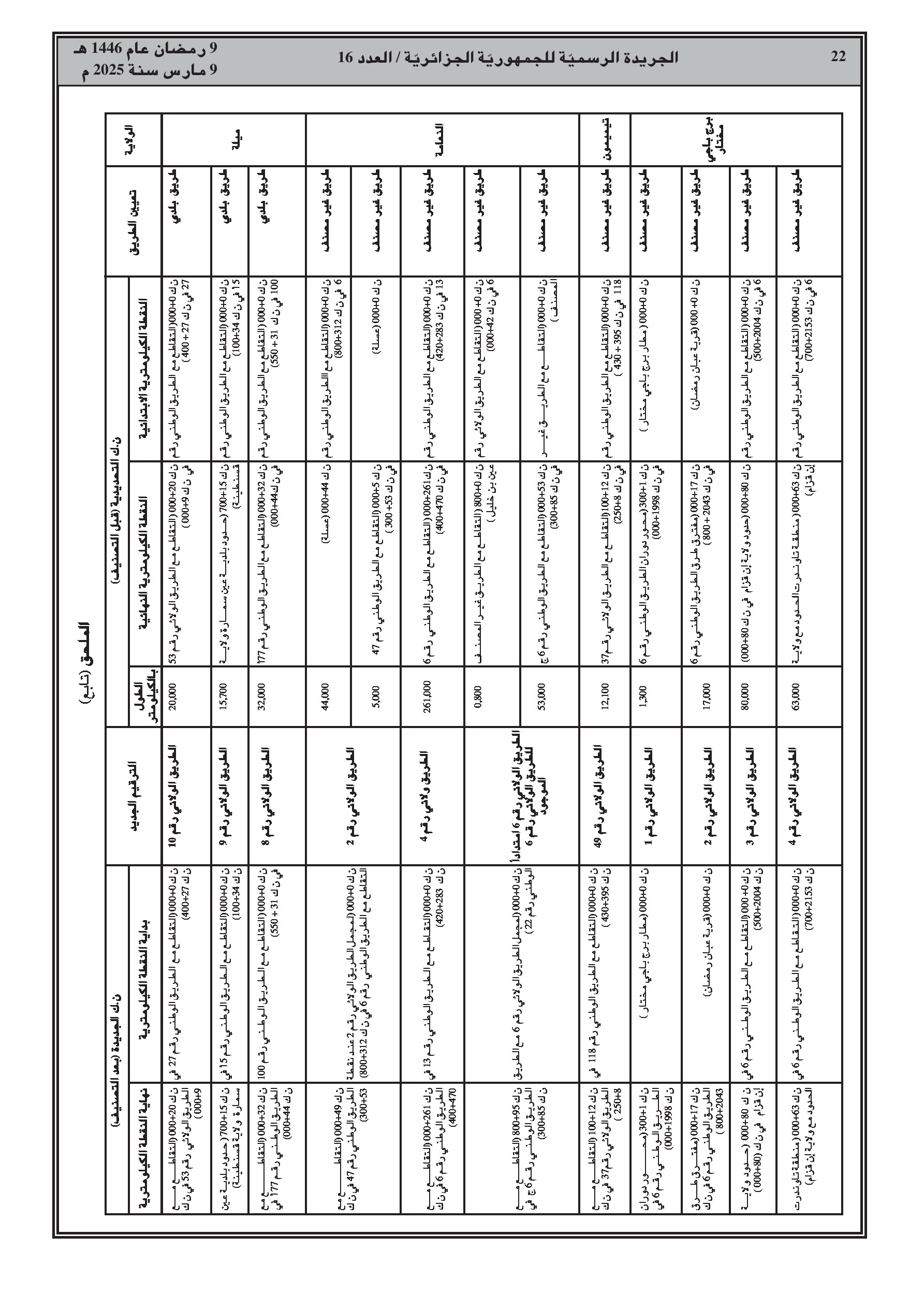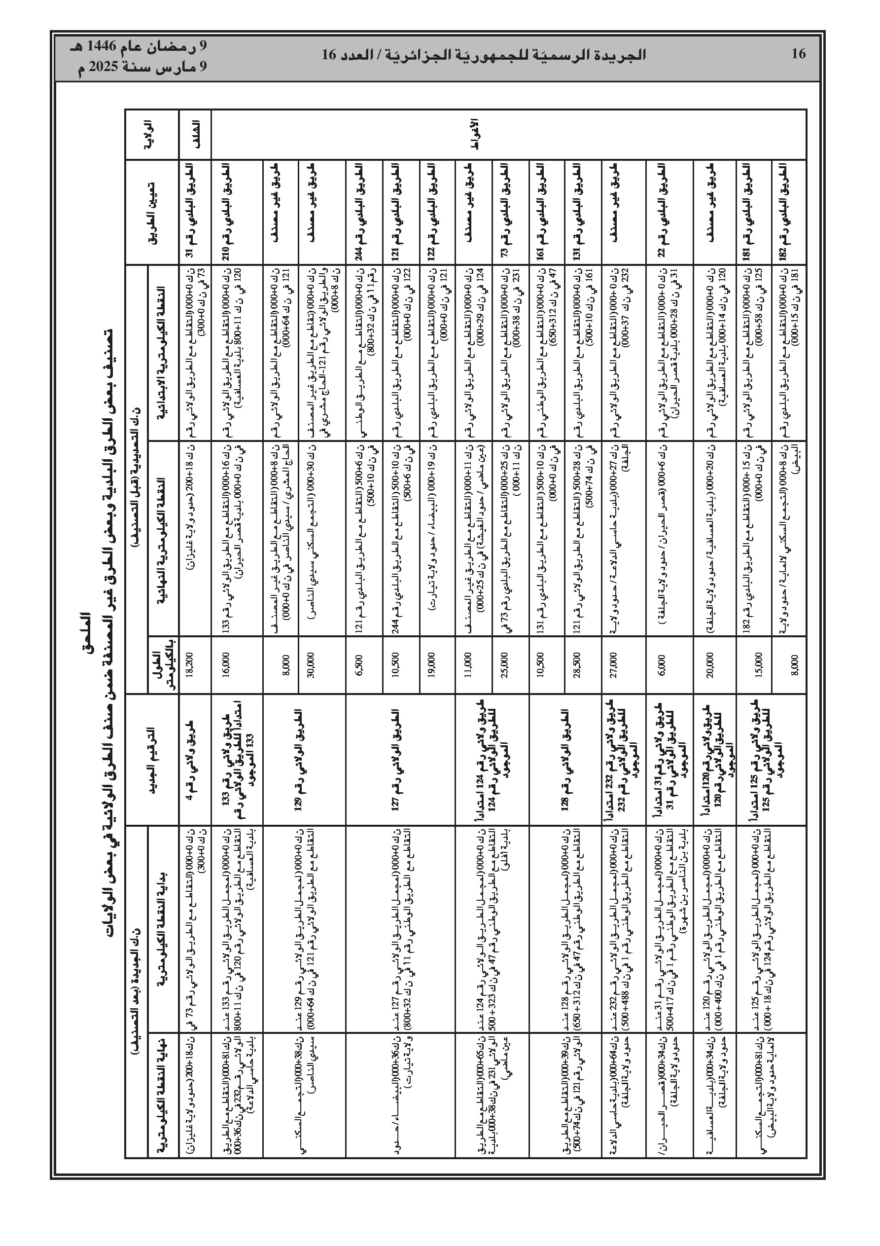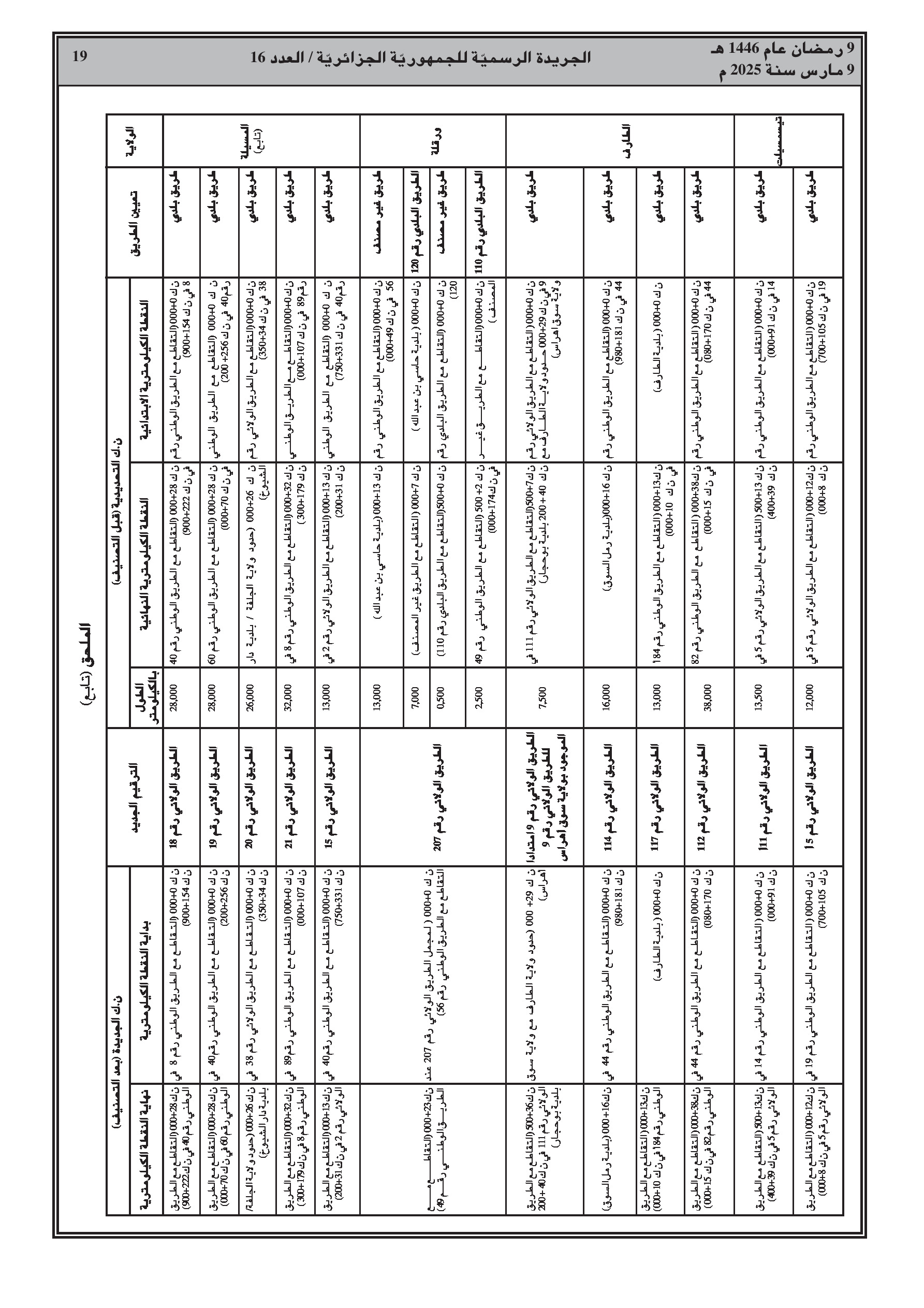 القرار، الصادر بالاشتراك مع وزارة الداخلية، يفصل في ملحق الطرق المعنية حسب الولاية (الشلف، الأغواط، بسكرة، تمنراست، تبسة، الجلفة، المدية، المسيلة، ورقلة، الطارف، تيسمسيلت، الوادي، خنشلة، ميلة، النعامة، تيميمون، برج باجي مختار، بني عباس، عين قزام) مع ترقيمها الجديد وحدودها الكيلومترية.