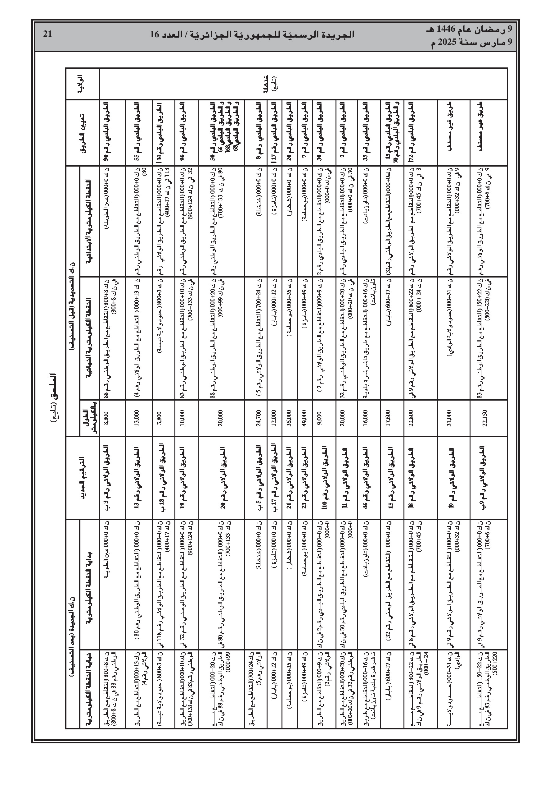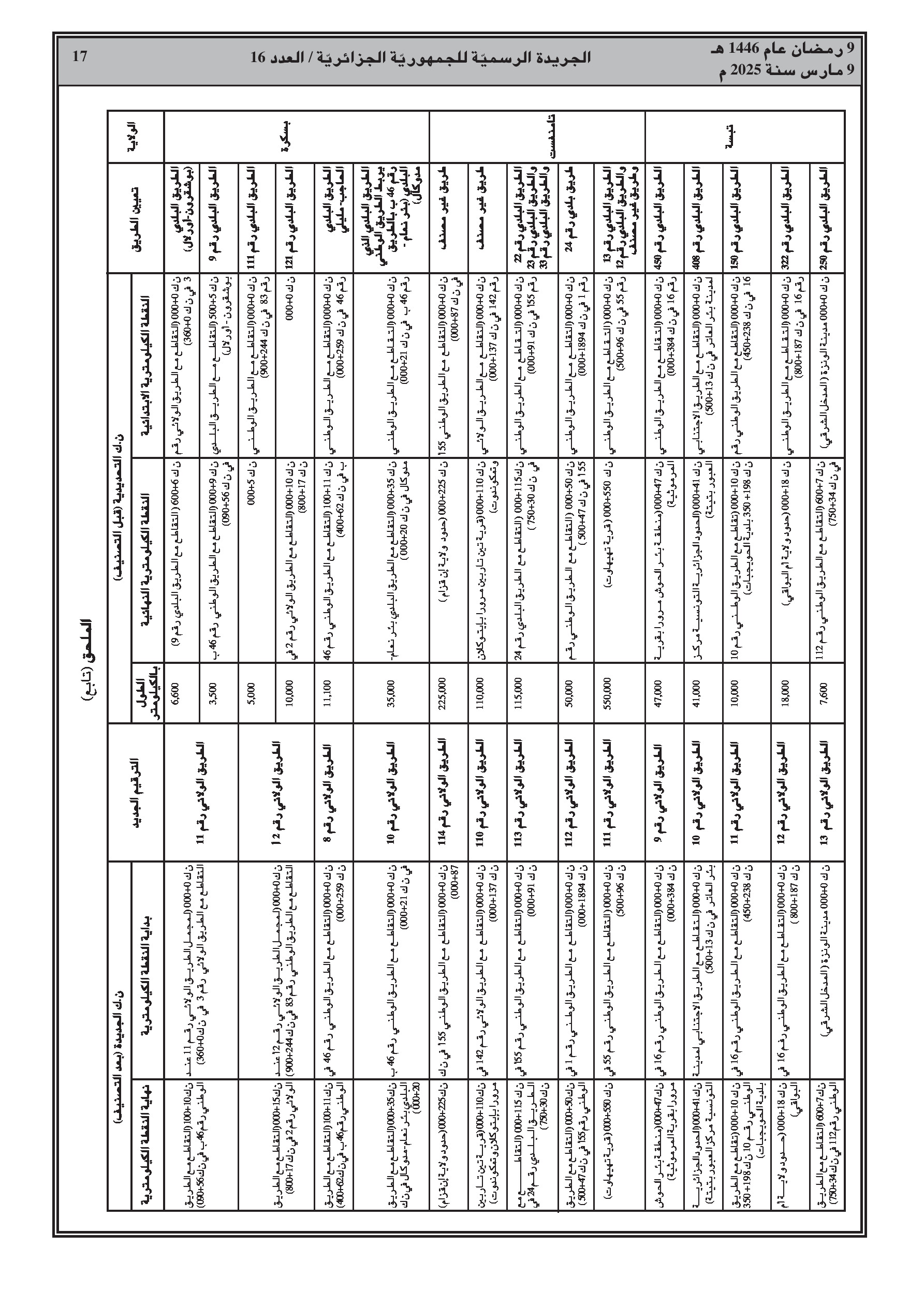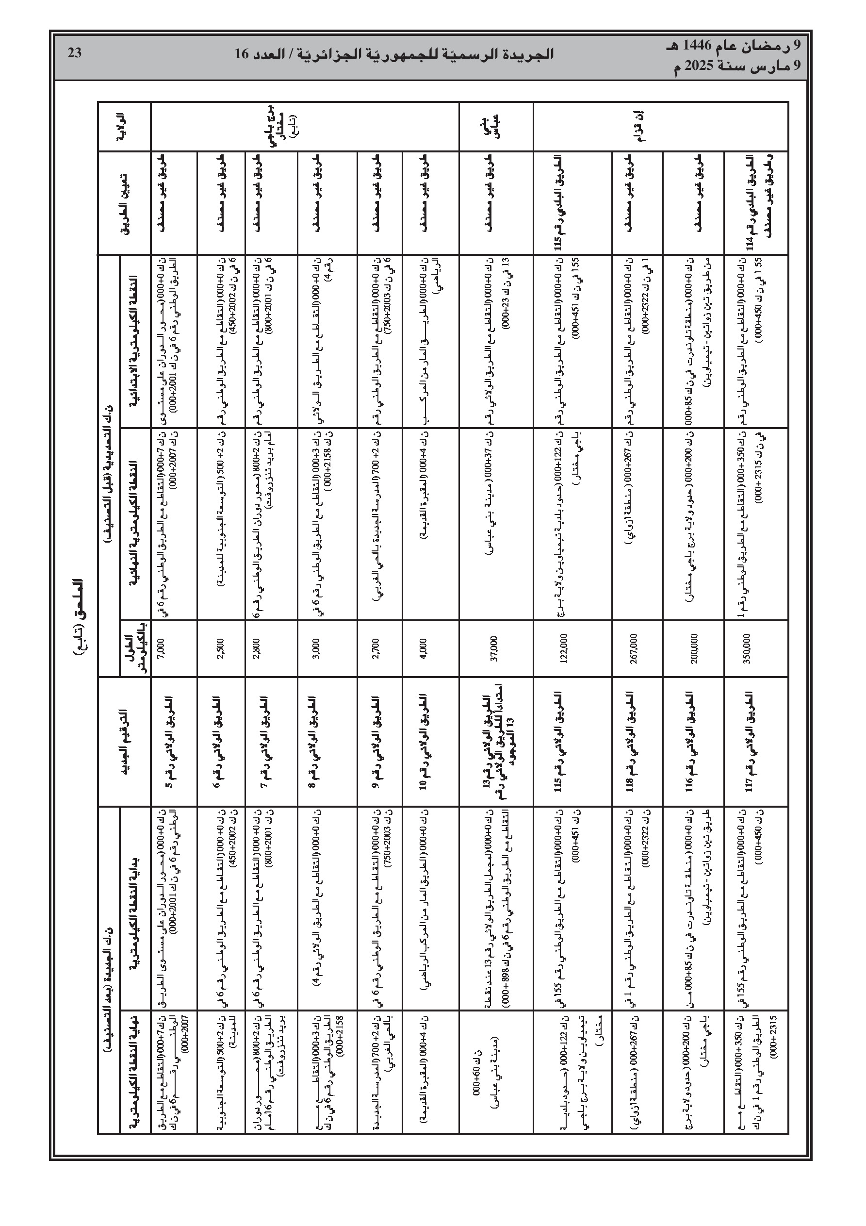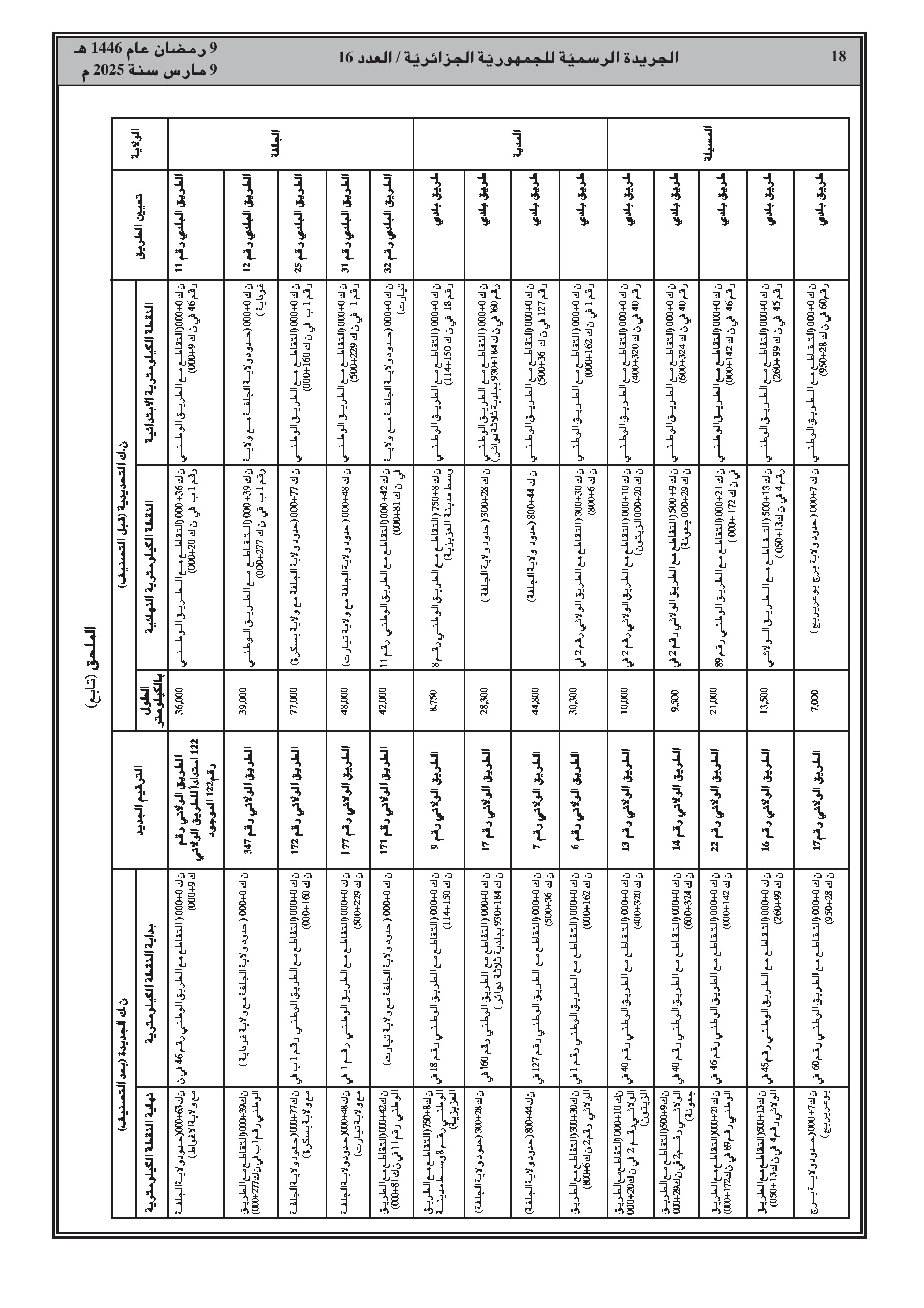 القرار، الصادر بالاشتراك مع وزارة الداخلية، يفصل في ملحق الطرق المعنية حسب الولاية (الشلف، الأغواط، بسكرة، تمنراست، تبسة، الجلفة، المدية، المسيلة، ورقلة، الطارف، تيسمسيلت، الوادي، خنشلة، ميلة، النعامة، تيميمون، برج باجي مختار، بني عباس، عين قزام) مع ترقيمها الجديد وحدودها الكيلومترية.