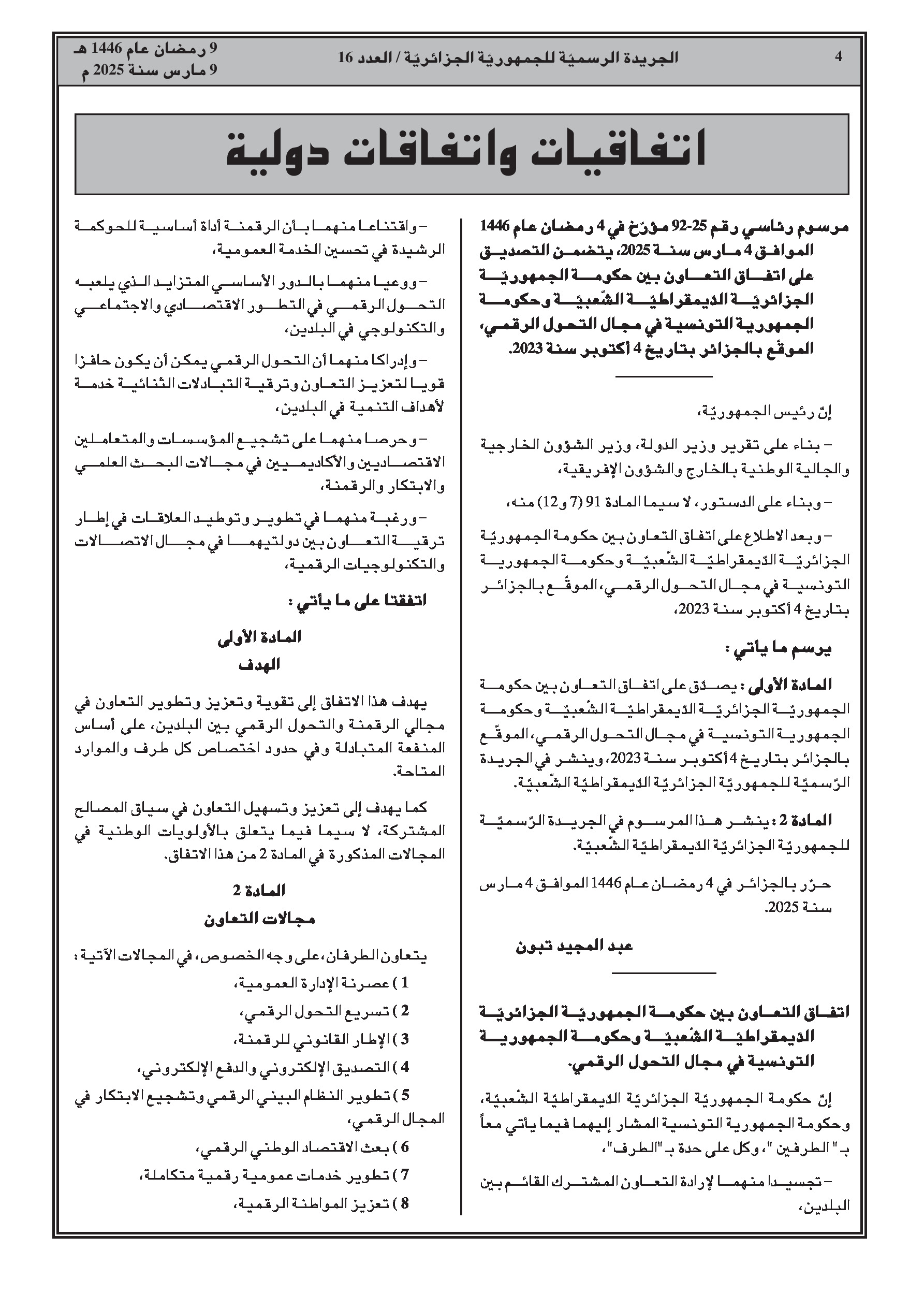 يصادق المرسوم على الاتفاق الموقع في 4 أكتوبر 2023 لتطوير التعاون الثنائي في مجال الرقمنة، الخدمات العمومية الرقمية، والاقتصاد الرقمي.
