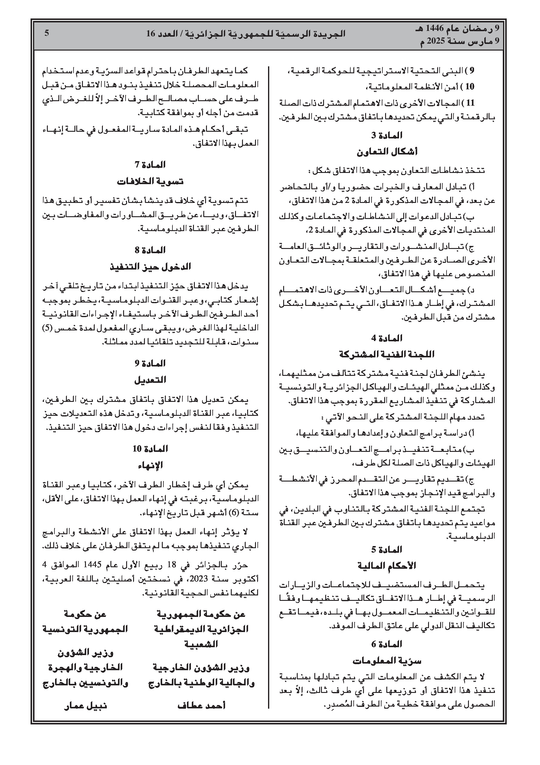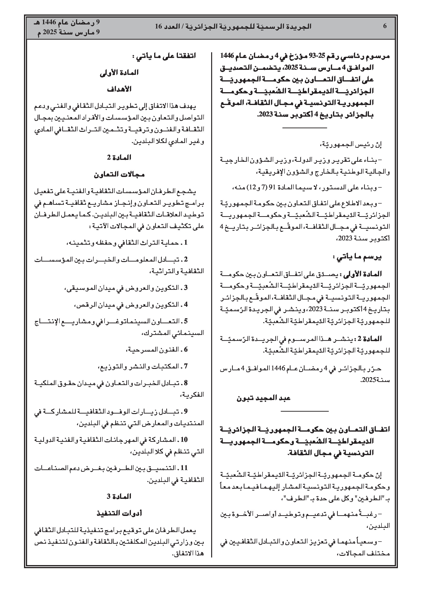 المصادقة على اتفاق التعاون الثقافي مع تونس الموقع في 4 أكتوبر 2023، ليحل محل اتفاقية 1963.