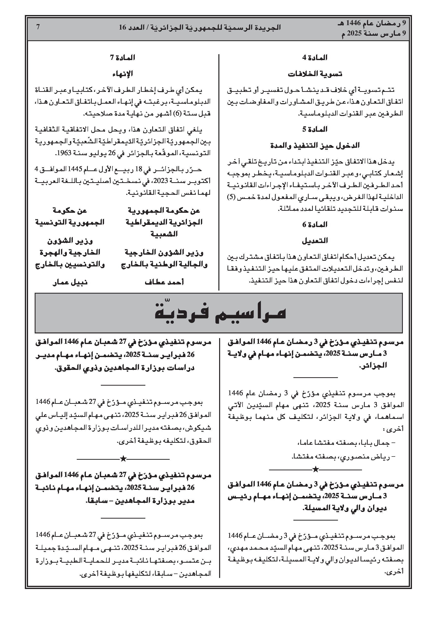 تعيين مديري المجاهدين وذوي الحقوق: إلياس علي شيكوش (وهران)، أحمد تيجاني حفصي (الطارف)، يحيى حومات (تقرت)، وحمزة وعدة (المنيعة).