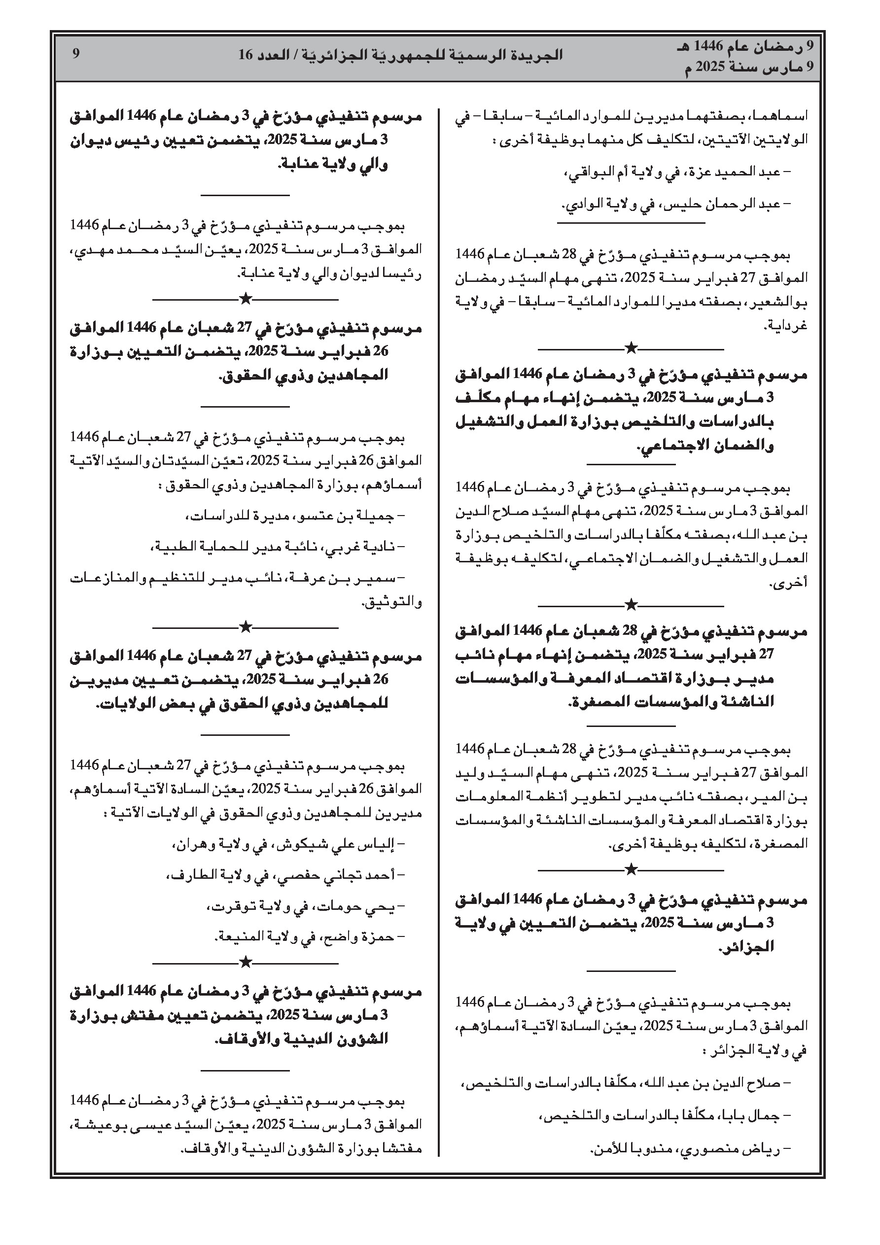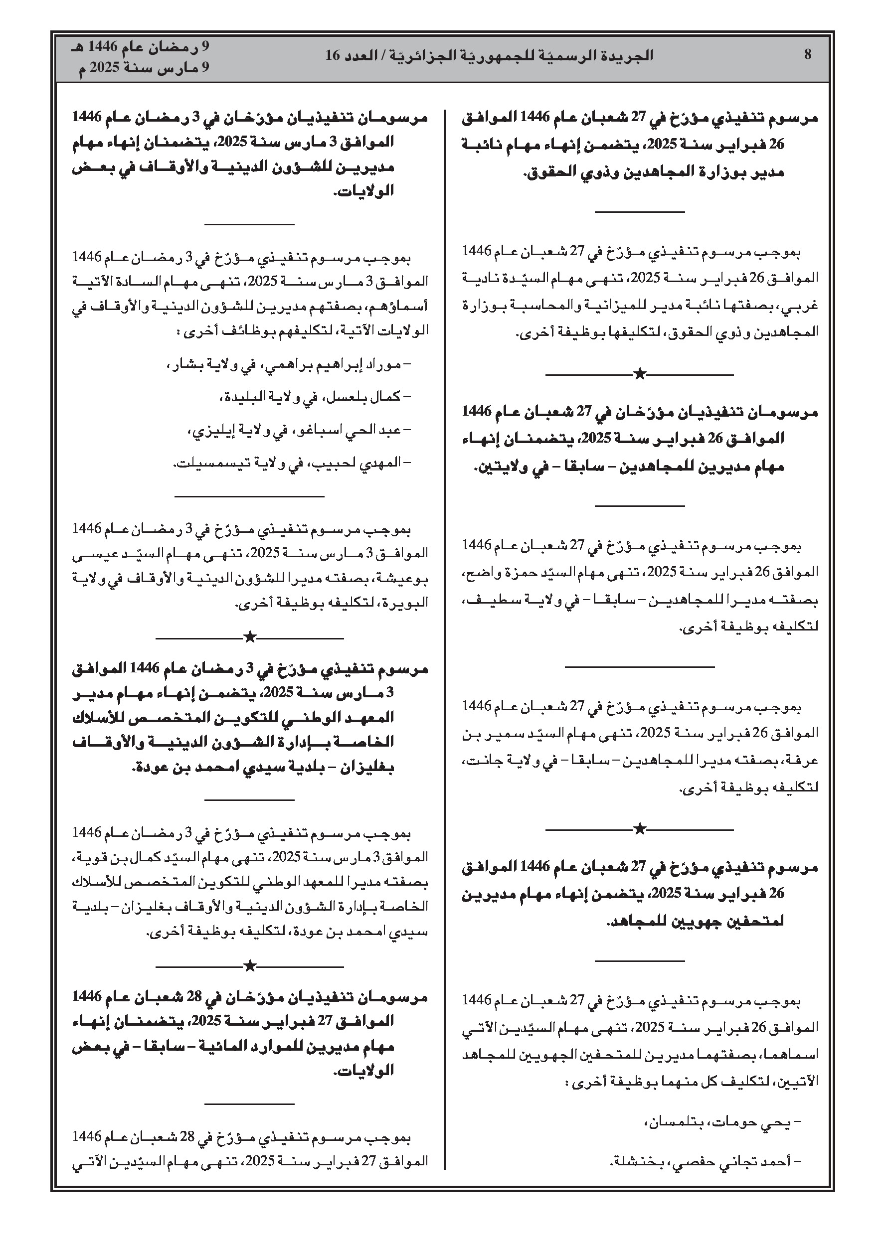 إنهاء مهام مديري الشؤون الدينية والأوقاف: مراد إبراهيم براهمي (بشار)، كمال بلعسل (البليدة)، عبد الحي سباغو (إليزي)، المهدي لحبيب (تيسمسيلت)، وعيسى بوعيشة (البويرة). جميعهم مدعوون لمهام أخرى.