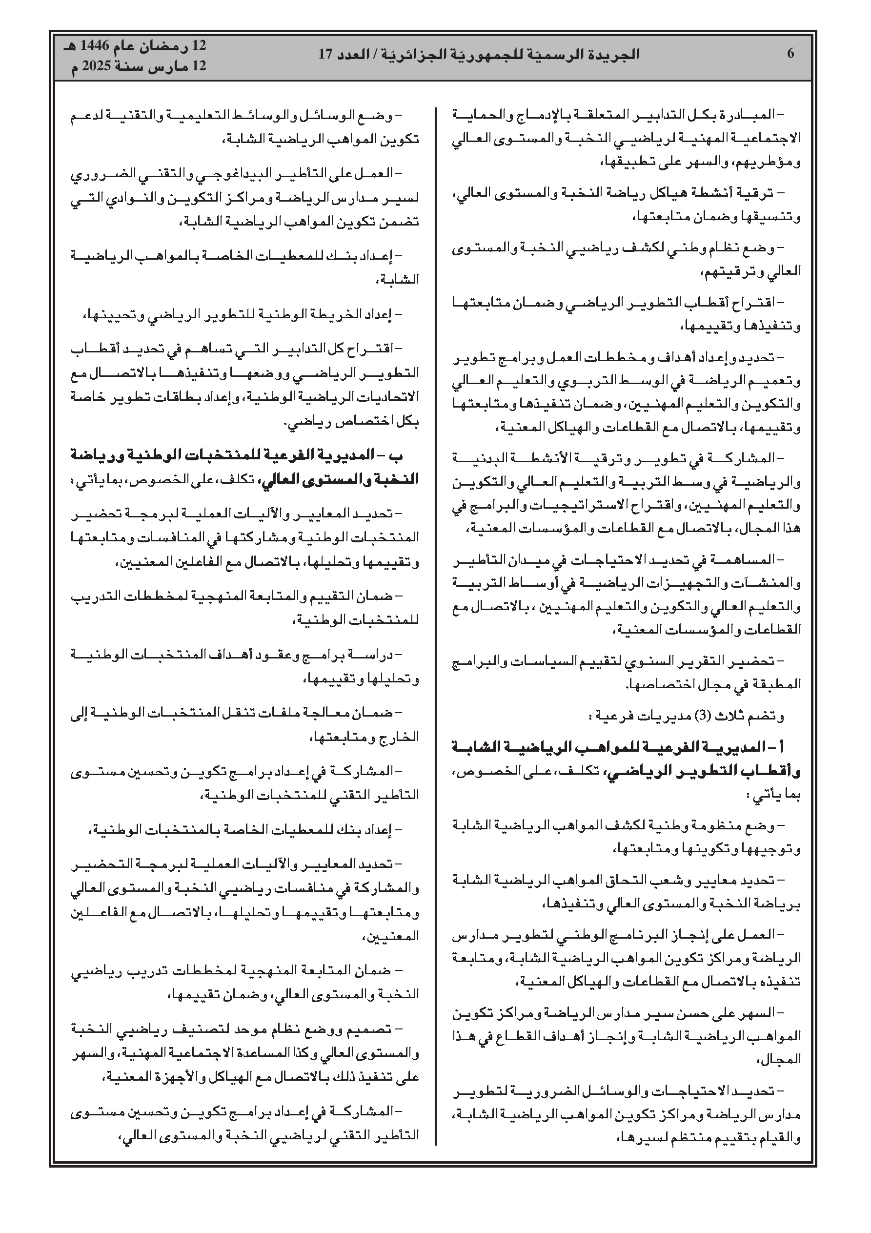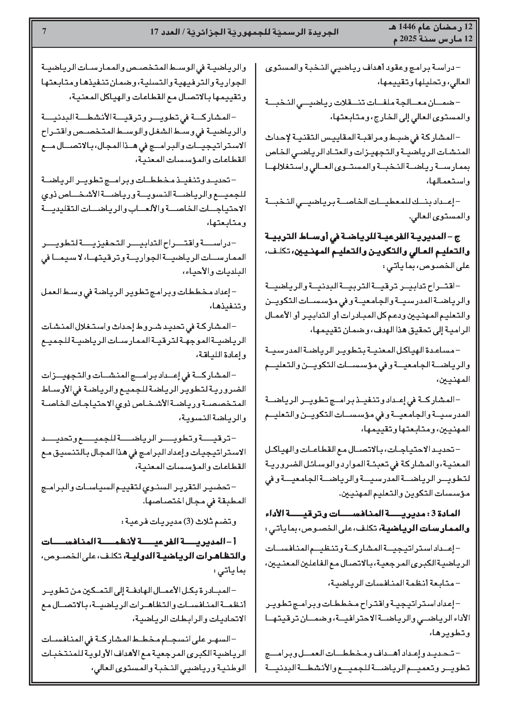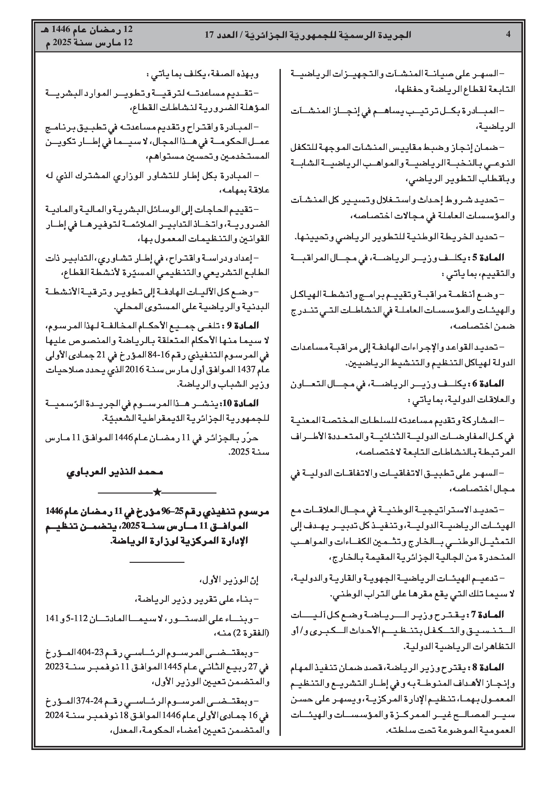 مرسوم تنفيذي رقم 25-95 يحدد صلاحيات وزير الرياضة، وتشمل تطوير وتنفيذ السياسة الوطنية للرياضة، رياضة النخبة، الرياضة للجميع، البنى التحتية، التكوين، ومكافحة المنشطات.