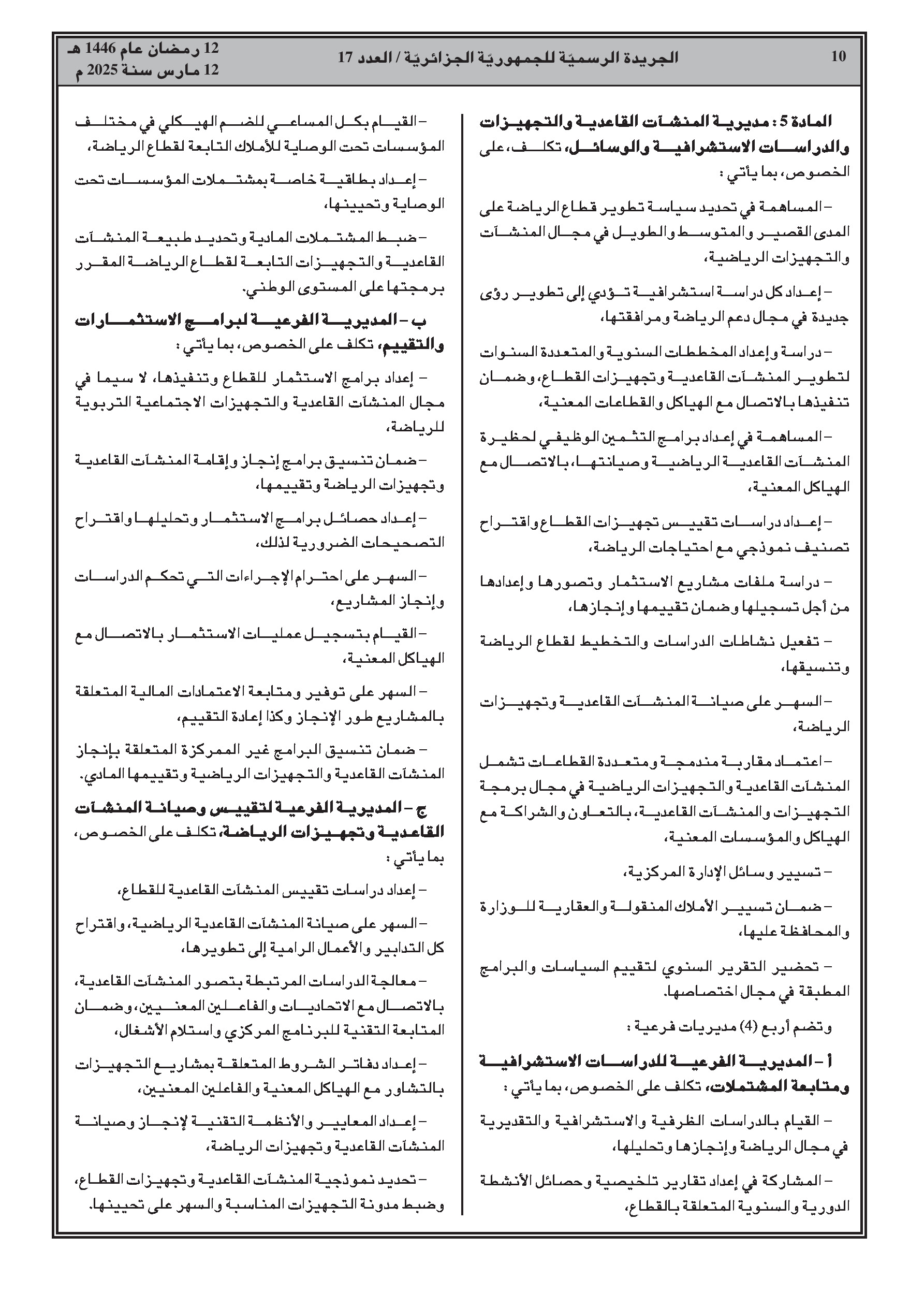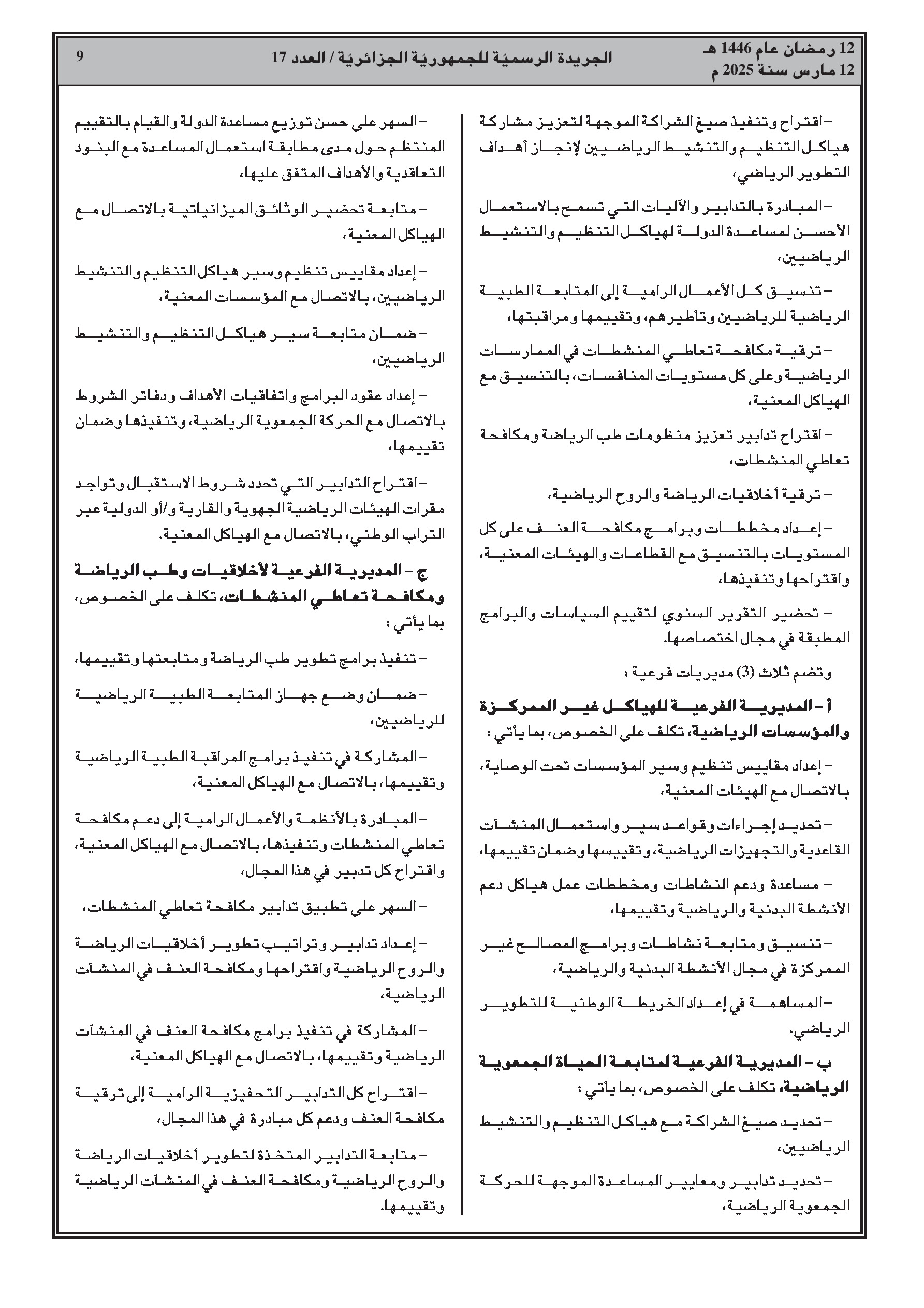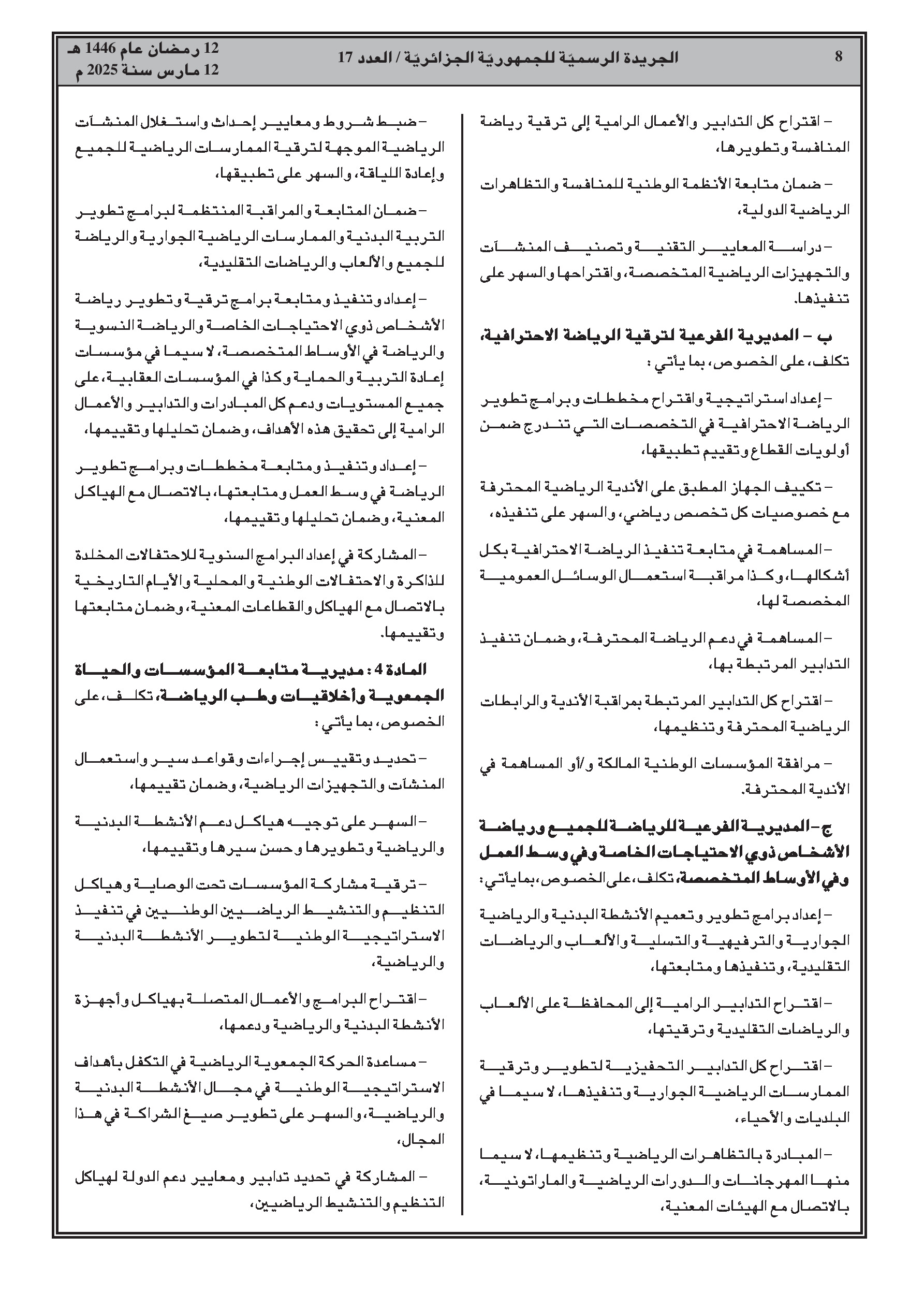 مرسوم تنفيذي رقم 25-95 يحدد صلاحيات وزير الرياضة، وتشمل تطوير وتنفيذ السياسة الوطنية للرياضة، رياضة النخبة، الرياضة للجميع، البنى التحتية، التكوين، ومكافحة المنشطات.