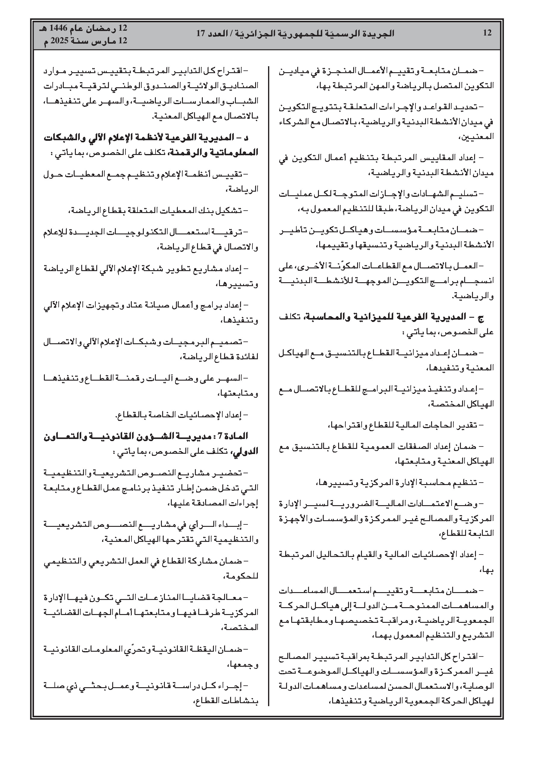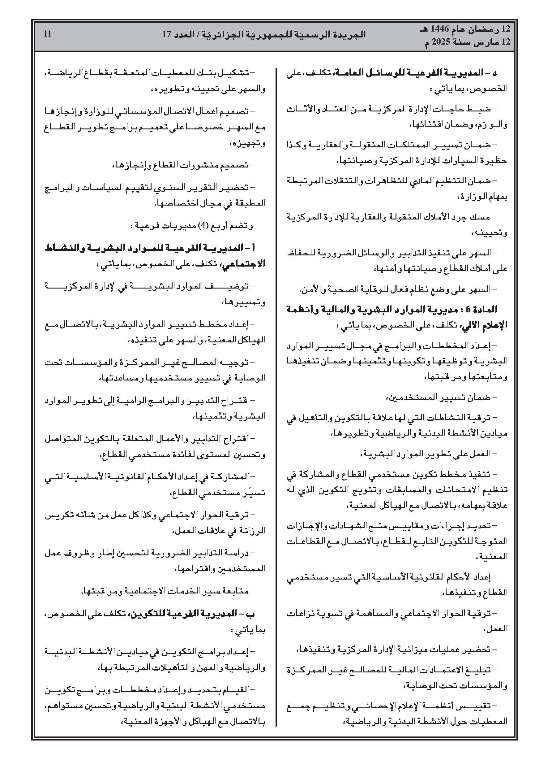 مرسوم تنفيذي رقم 25-96 يحدد تنظيم الإدارة المركزية لوزارة الرياضة، وتضم الأمانة العامة، ديوان الوزير، المفتشية العامة، و6 مديريات مركزية: مديرية المواهب الرياضية الشابة ورياضة النخبة والمستوى العالي والرياضة في أوساط التربية والتكوين؛ مديرية المنافسات وترقية الأداء والممارسات الرياضية؛ مديرية متابعة المؤسسات والحياة الجمعوية والأخلاقيات وطب الرياضة؛ مديرية الهياكل القاعدية والتجهيزات والدراسات الاستشرافية والوسائل؛ مديرية الموارد البشرية والمالية وأنظمة الإعلام؛ مديرية الشؤون القانونية والتعاون الدولي.