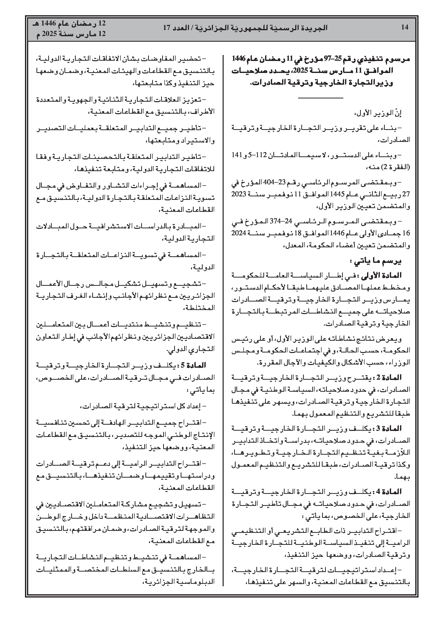 مرسوم تنفيذي رقم 25-97 يحدد صلاحيات وزير التجارة الخارجية وترقية الصادرات، المتعلقة بالسياسة الوطنية للتجارة الخارجية، الاتفاقيات الدولية، دعم المصدرين، وحماية المنتوج الوطني.