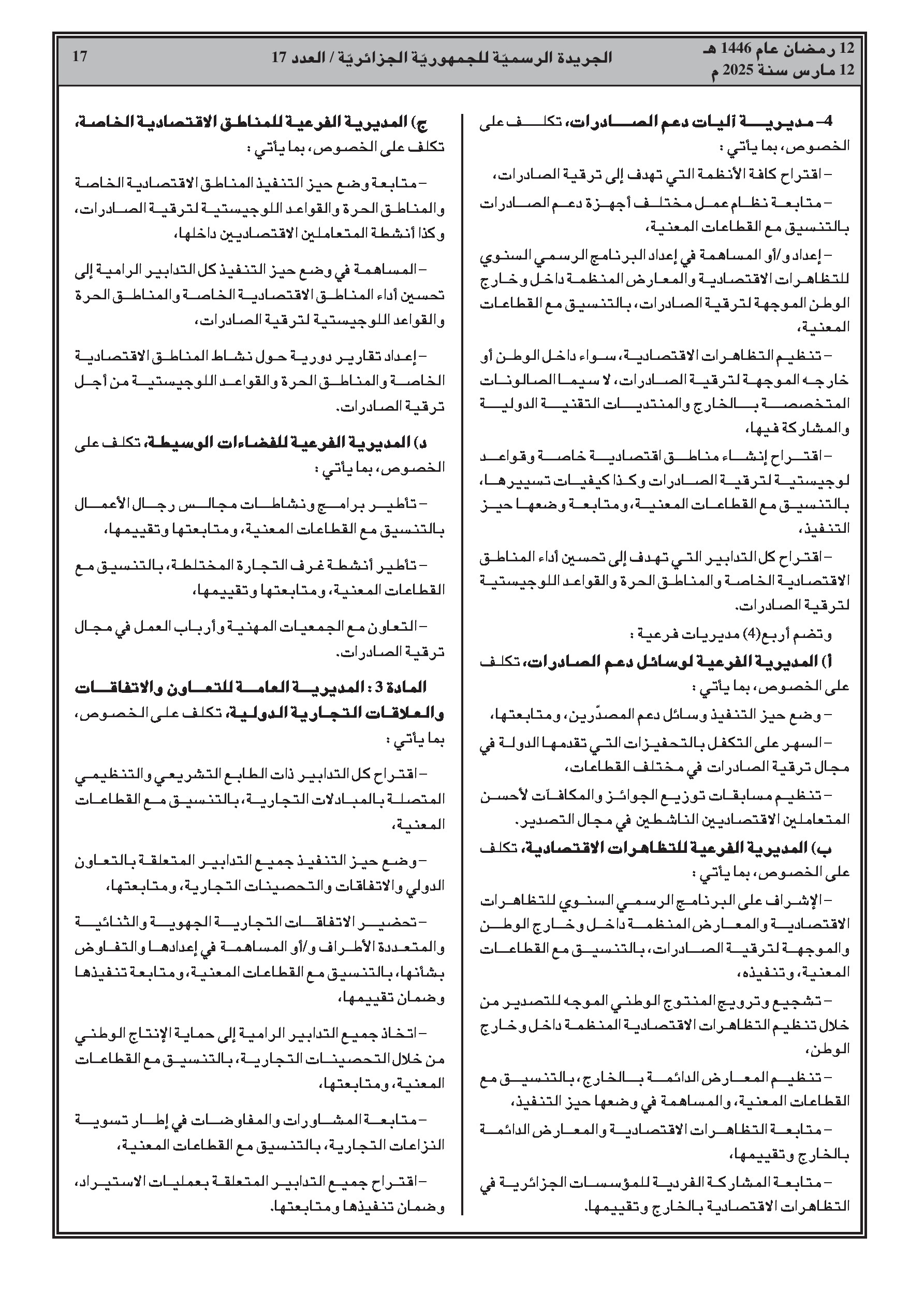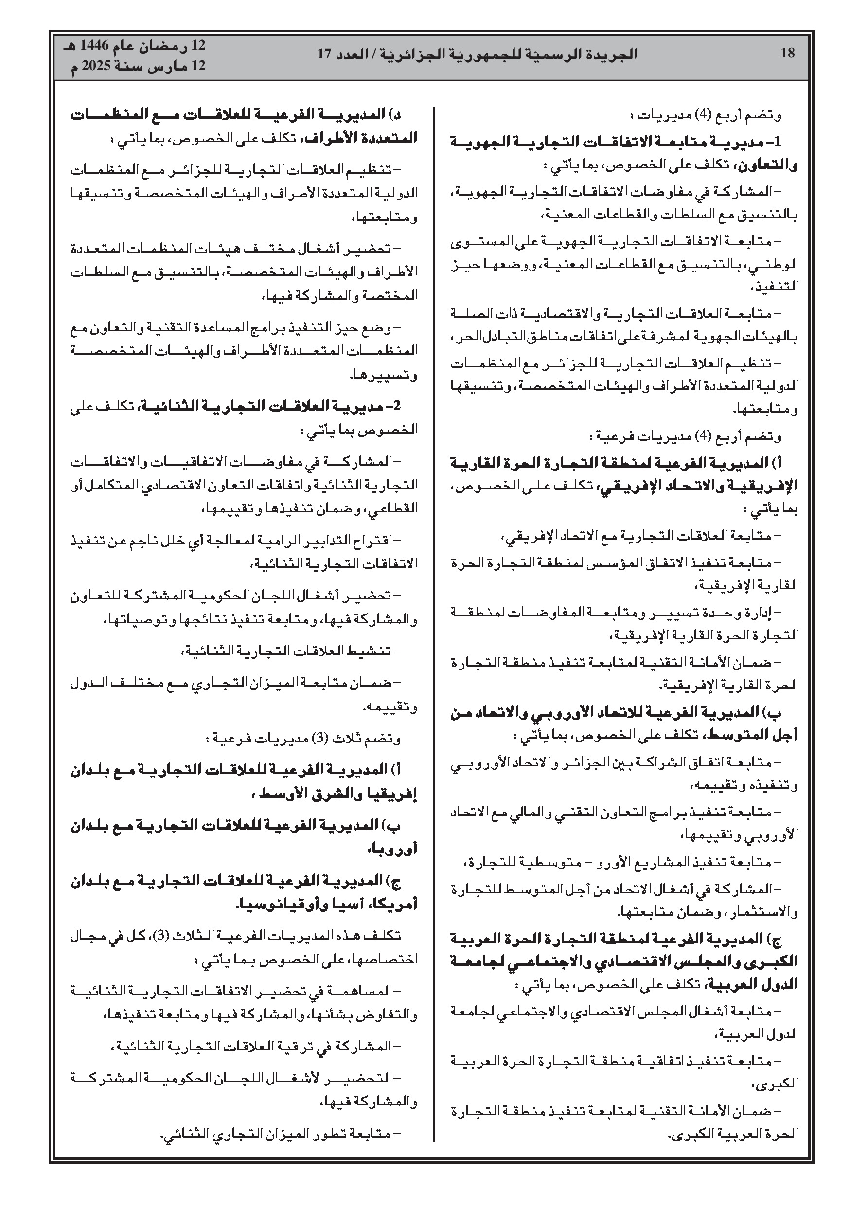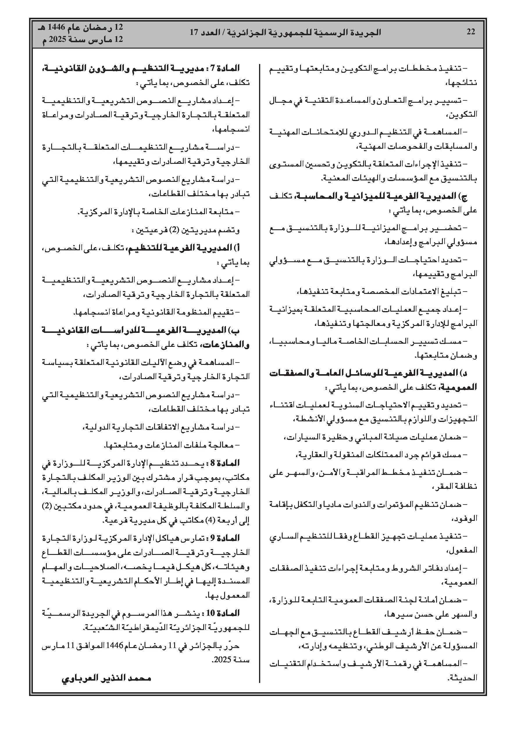 تحديد صلاحيات وزير التجارة الخارجية وترقية الصادرات وهيكلة إدارته المركزية لتعزيز التجارة الخارجية ودعم الصادرات الوطنية.