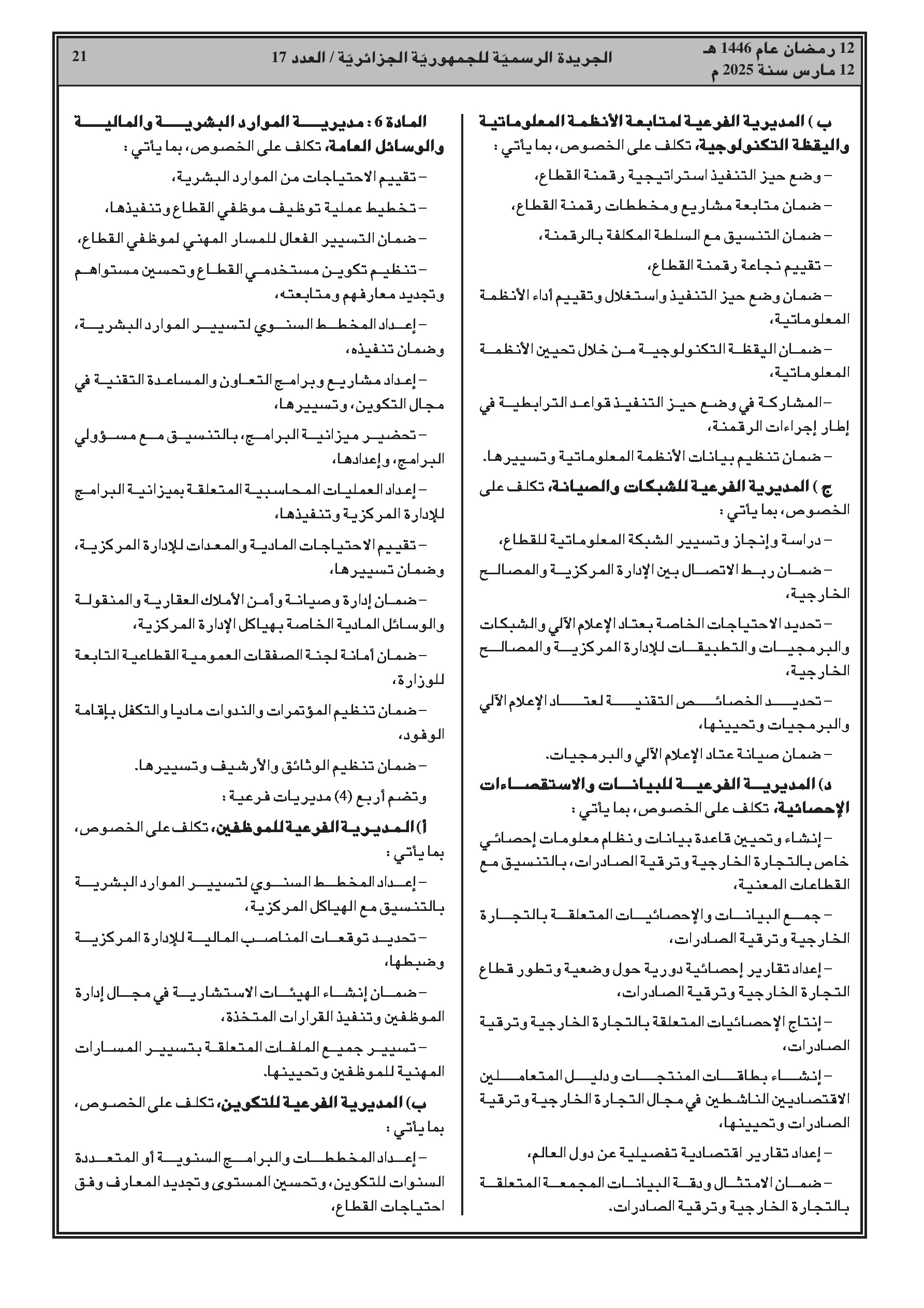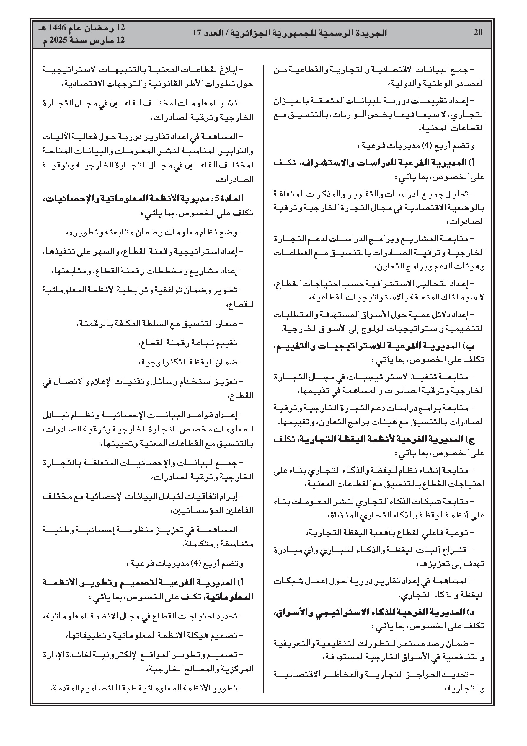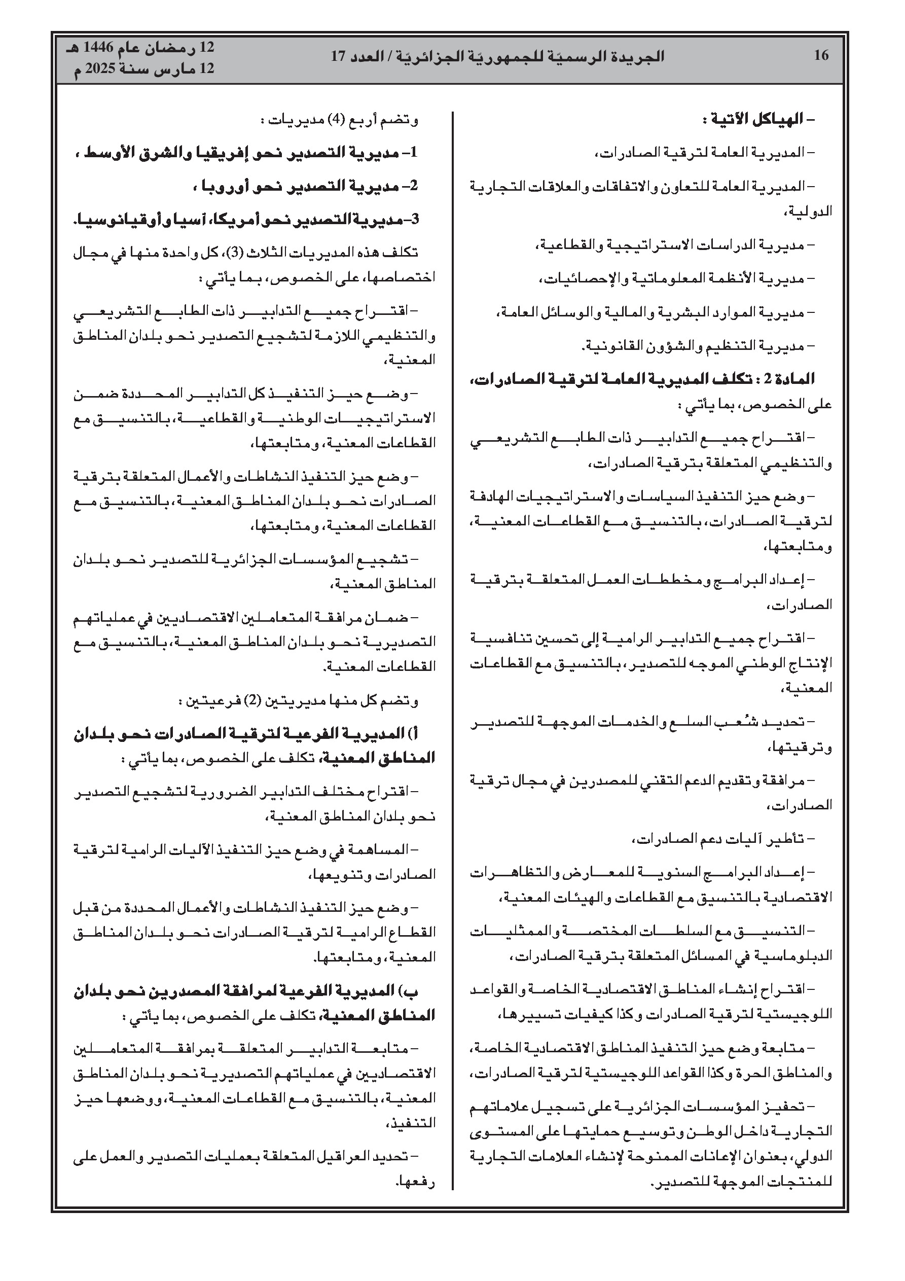 تحديد صلاحيات وزير التجارة الخارجية وترقية الصادرات وهيكلة إدارته المركزية لتعزيز التجارة الخارجية ودعم الصادرات الوطنية.