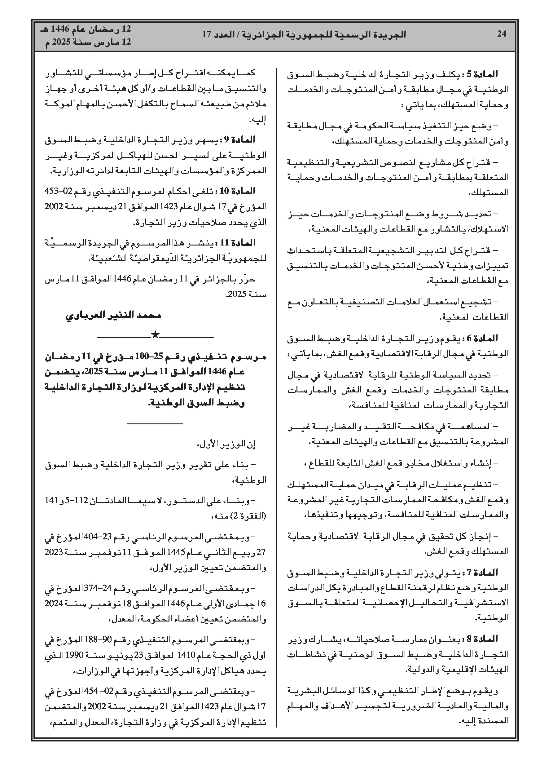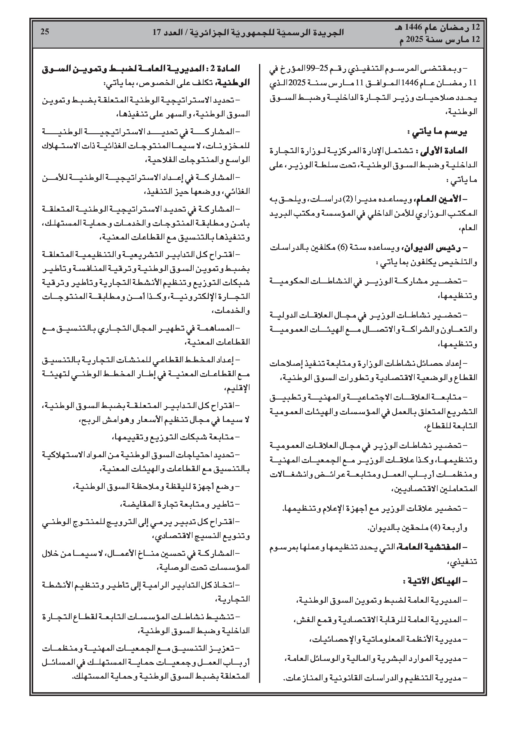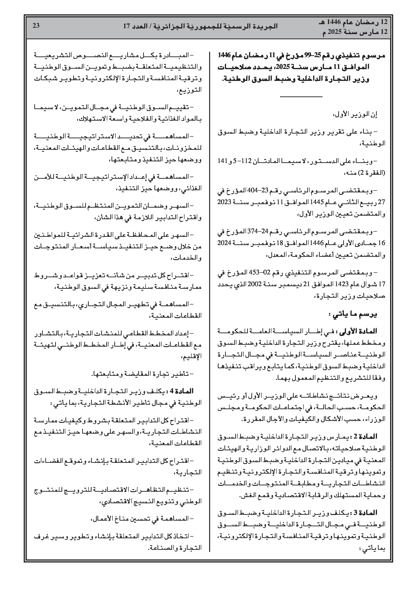 مرسوم تنفيذي رقم 25-99 يحدد صلاحيات وزير التجارة الداخلية وتنظيم السوق الوطنية، وتشمل تنظيم السوق، التموين، المنافسة، التجارة الإلكترونية، حماية المستهلك وقمع الغش.
