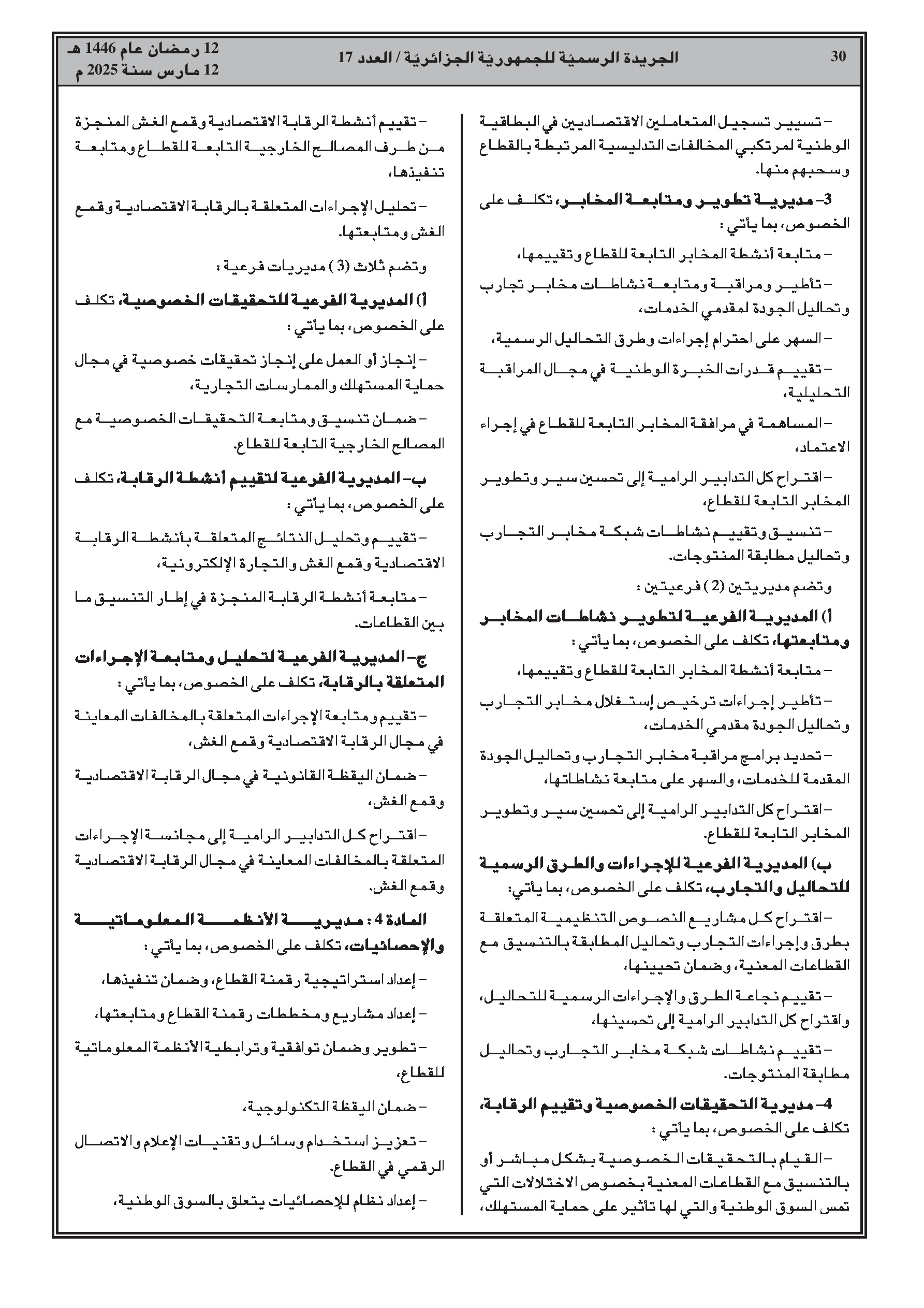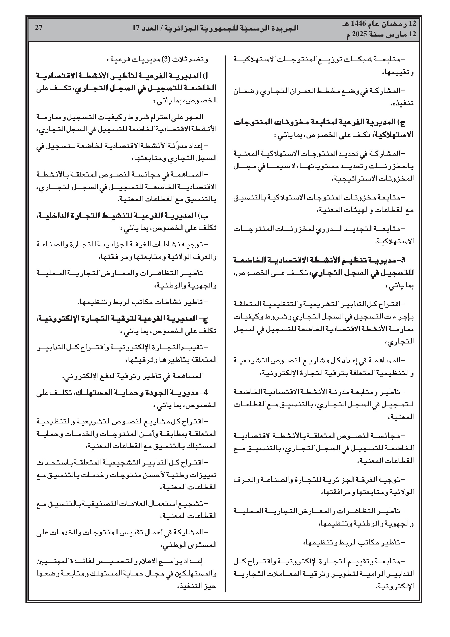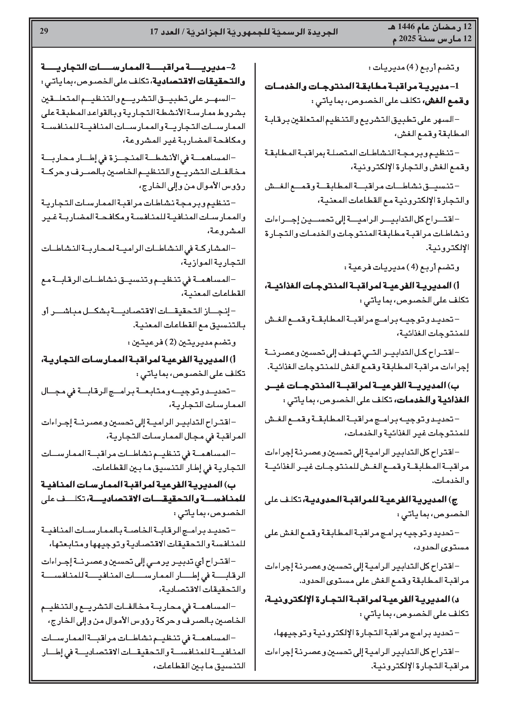 مرسوم تنفيذي رقم 25-100 يحدد تنظيم الإدارة المركزية لوزارة التجارة الداخلية وتنظيم السوق الوطنية، وتضم الأمانة العامة، ديوان الوزير، المفتشية العامة، ومديريتين عامتين (مديرية عامة لضبط وتنظيم السوق الوطنية؛ مديرية عامة للمراقبة الاقتصادية وقمع الغش) و3 مديريات أخرى.