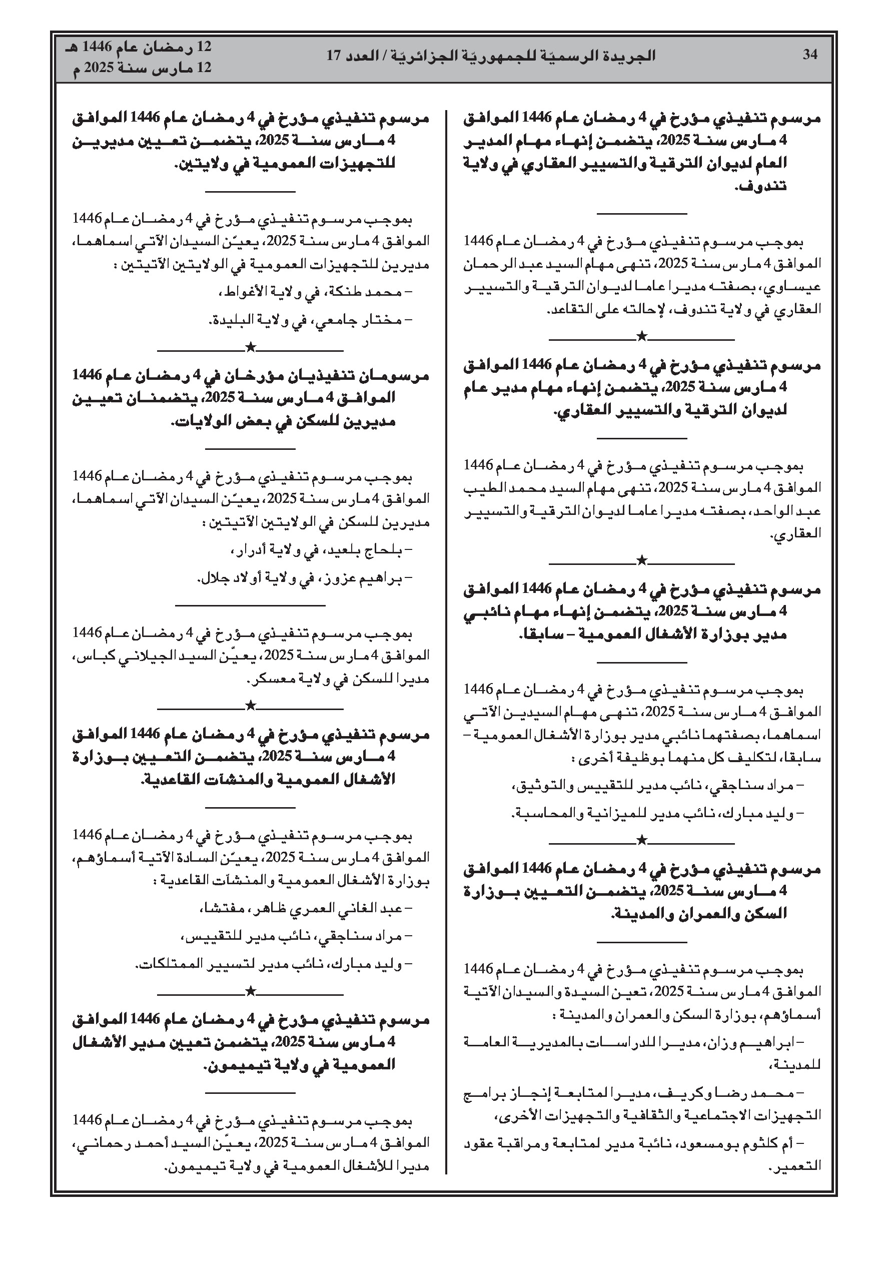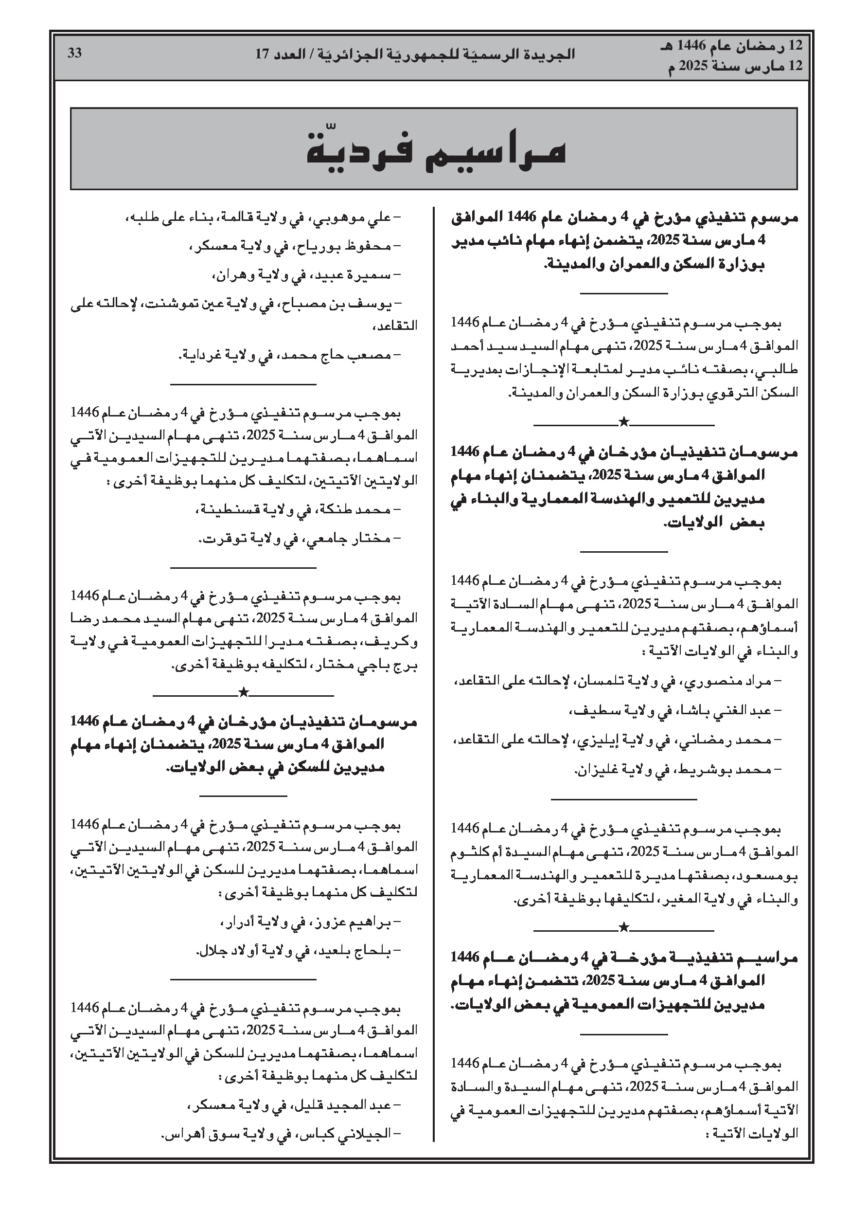 مراسيم تنفيذية تتضمن إنهاء مهام وتعيينات لمسؤولين في عدة قطاعات وزارية، بما في ذلك مديرين مركزيين ومديري ولايات في وزارات السكن والعمران والمدينة، الأشغال العمومية، والمنشآت القاعدية.