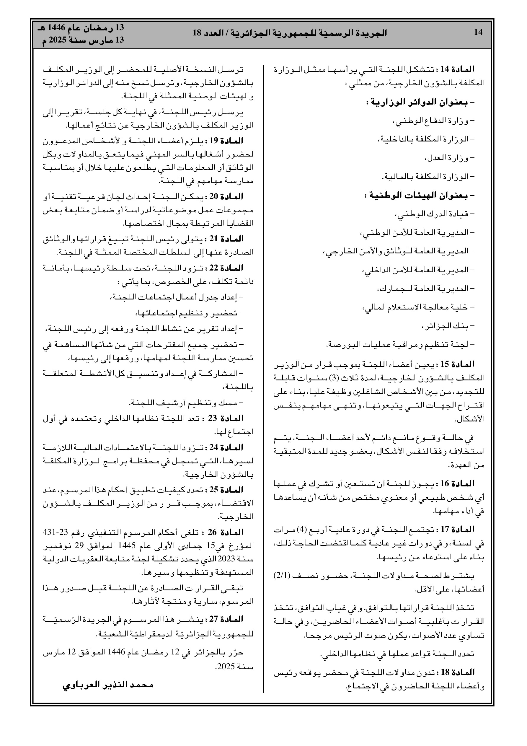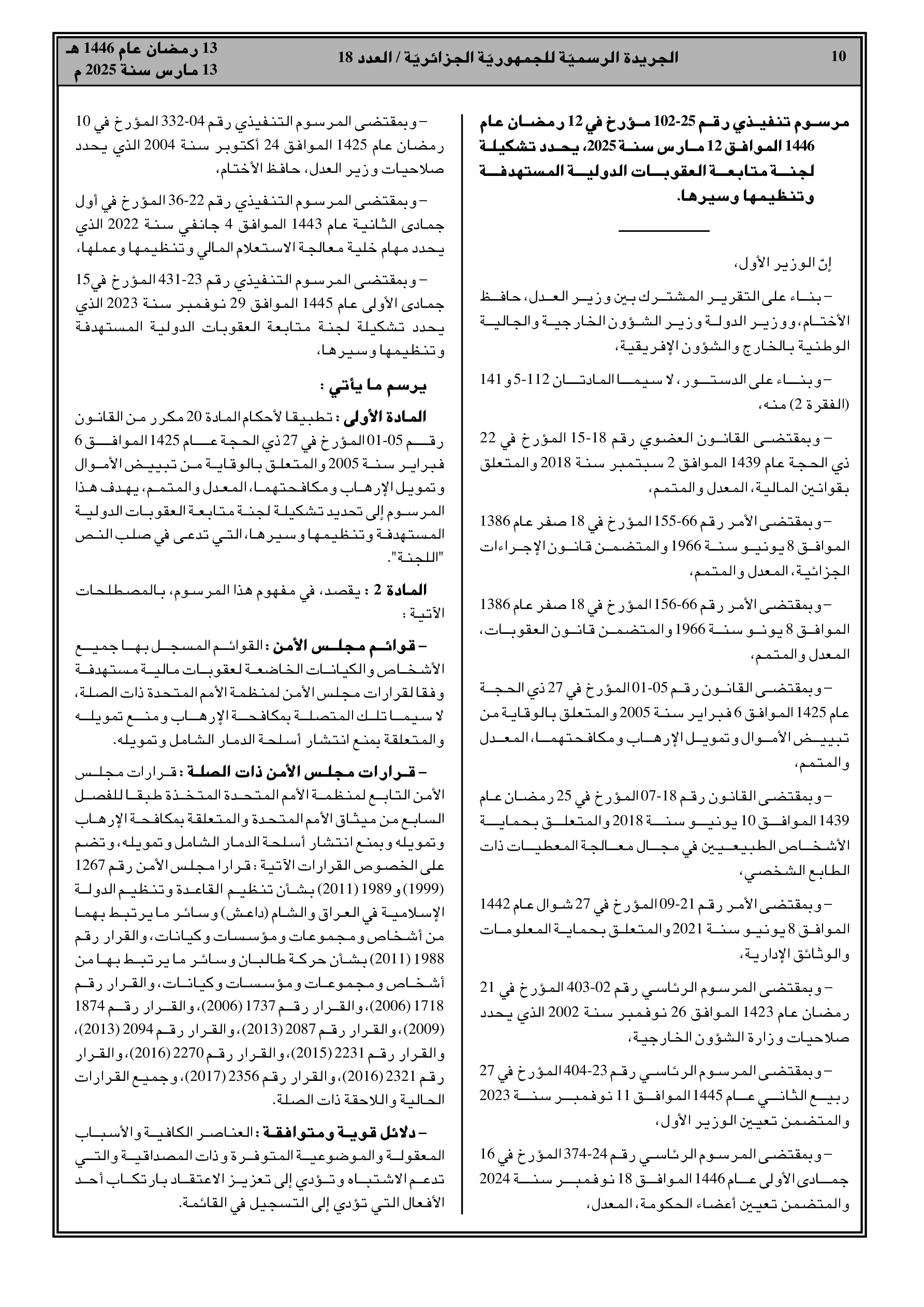 - يترأس اللجنة ممثل وزير الشؤون الخارجية وتضم ممثلين عن عدة قطاعات (الدفاع، الداخلية، العدل، المالية، وهيئات أمنية). - مهام اللجنة تشمل التنسيق مع هيئات الأمم المتحدة، تقديم طلبات الإدراج والشطب، إعداد التقارير الوطنية، واقتراح التعديلات التشريعية. - إلغاء المرسوم التنفيذي رقم 23-431.