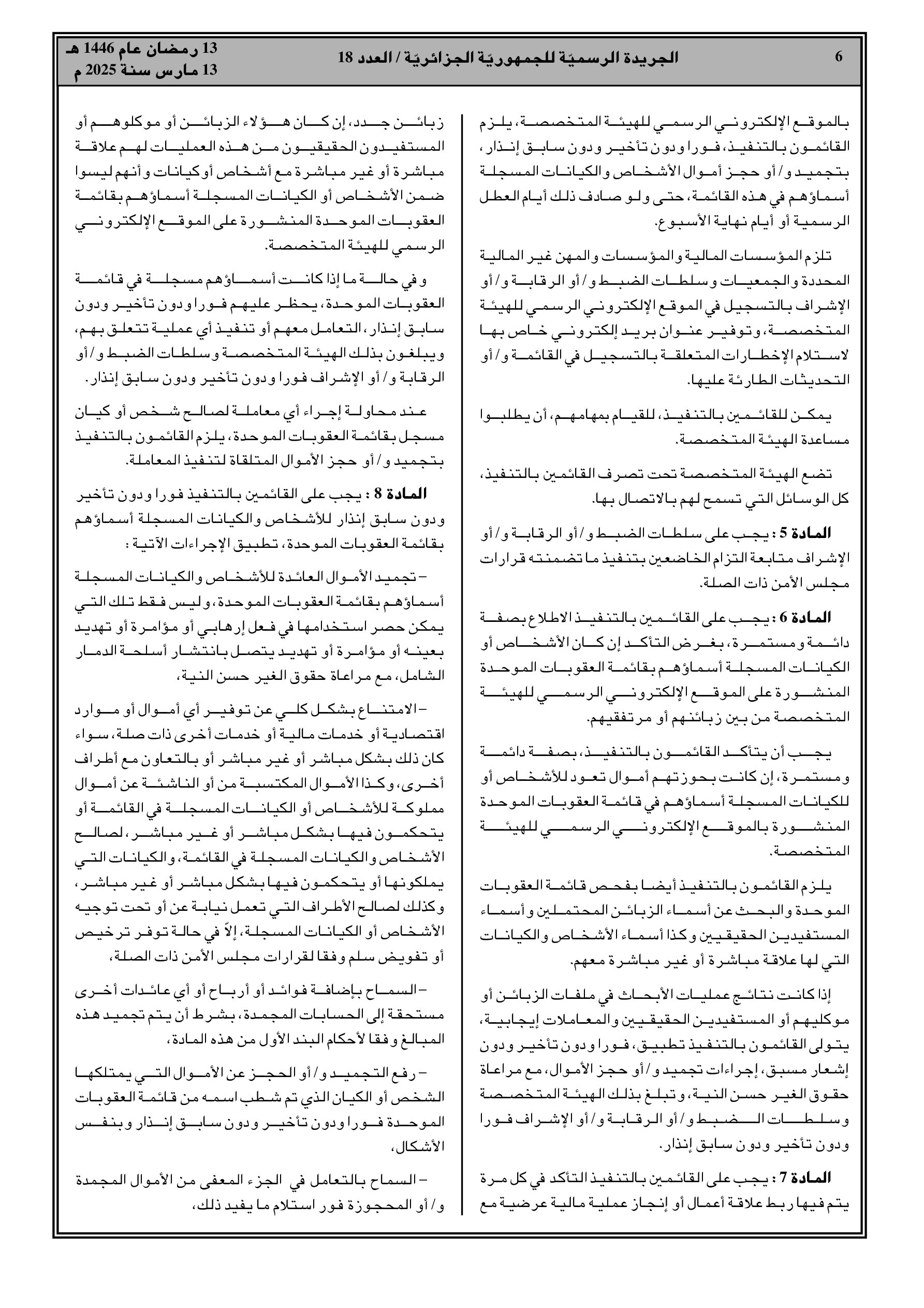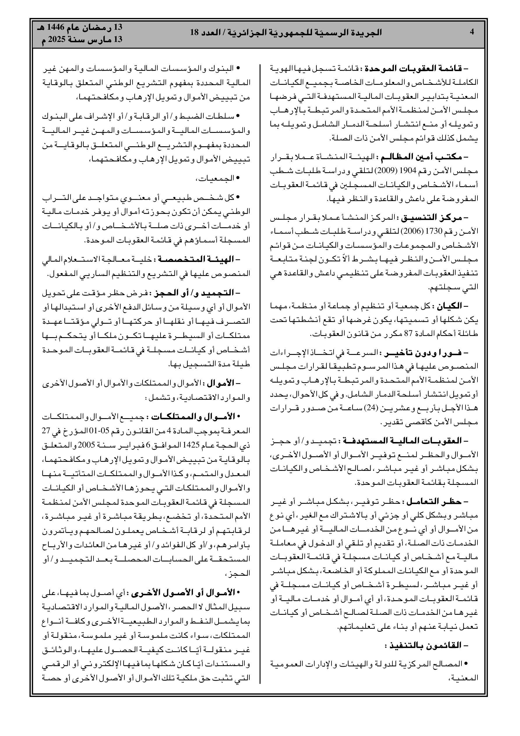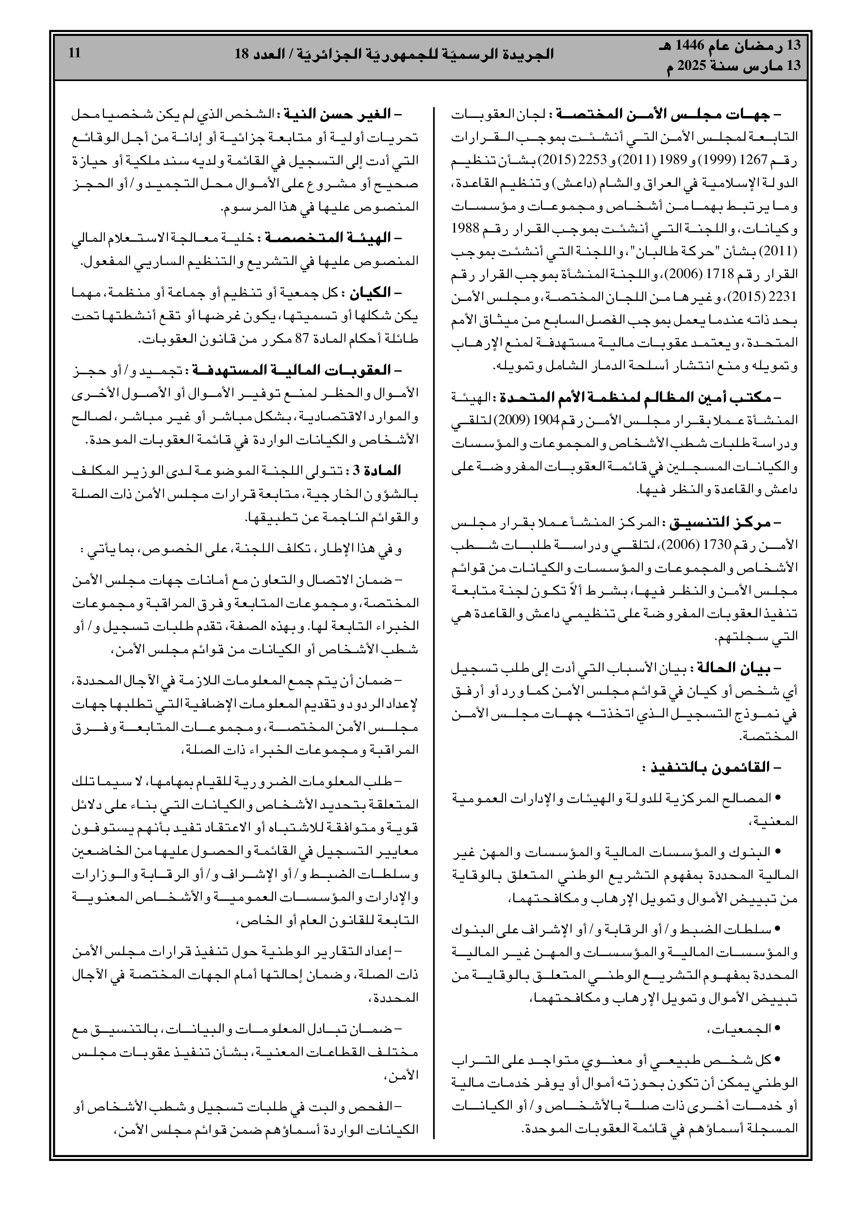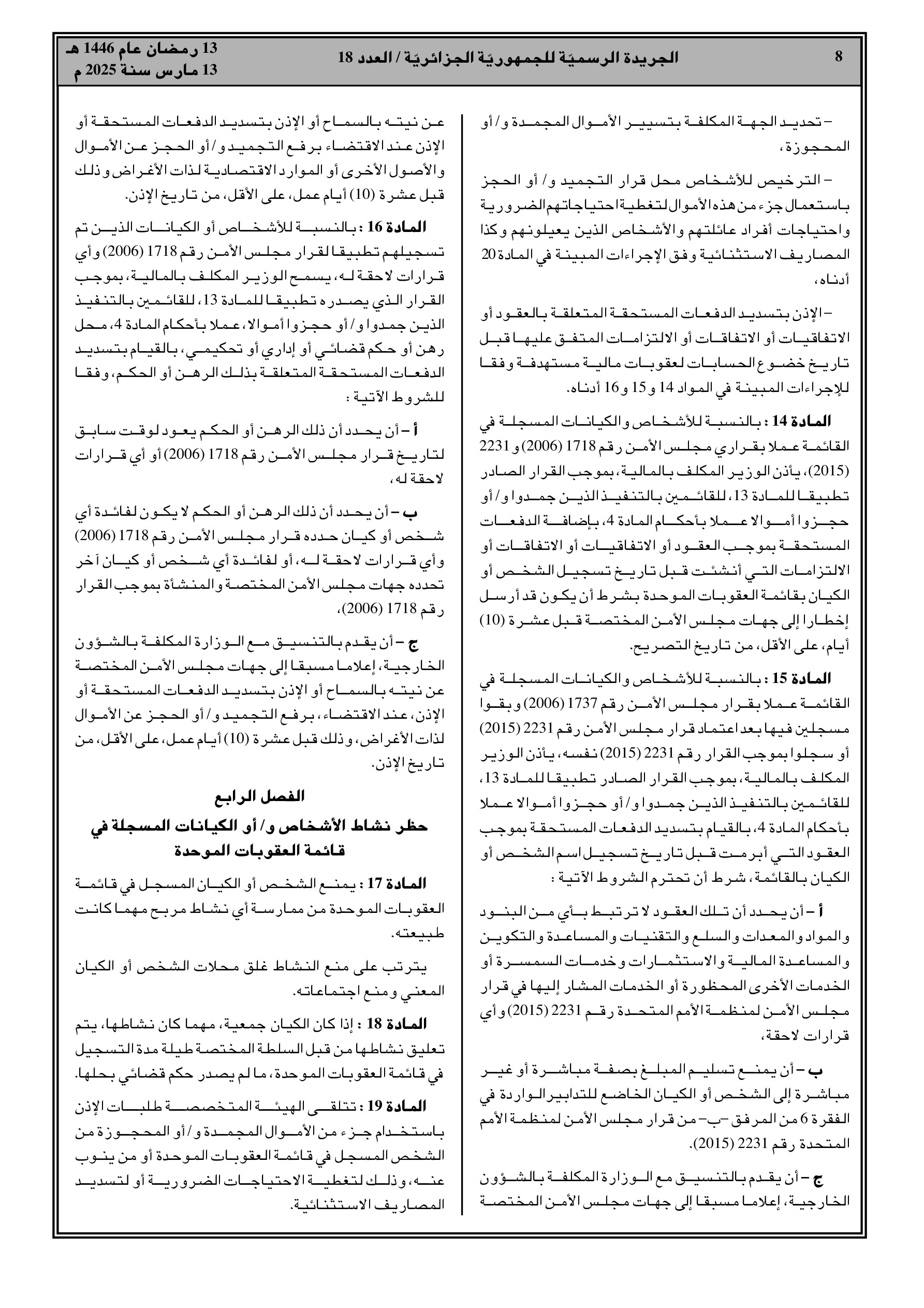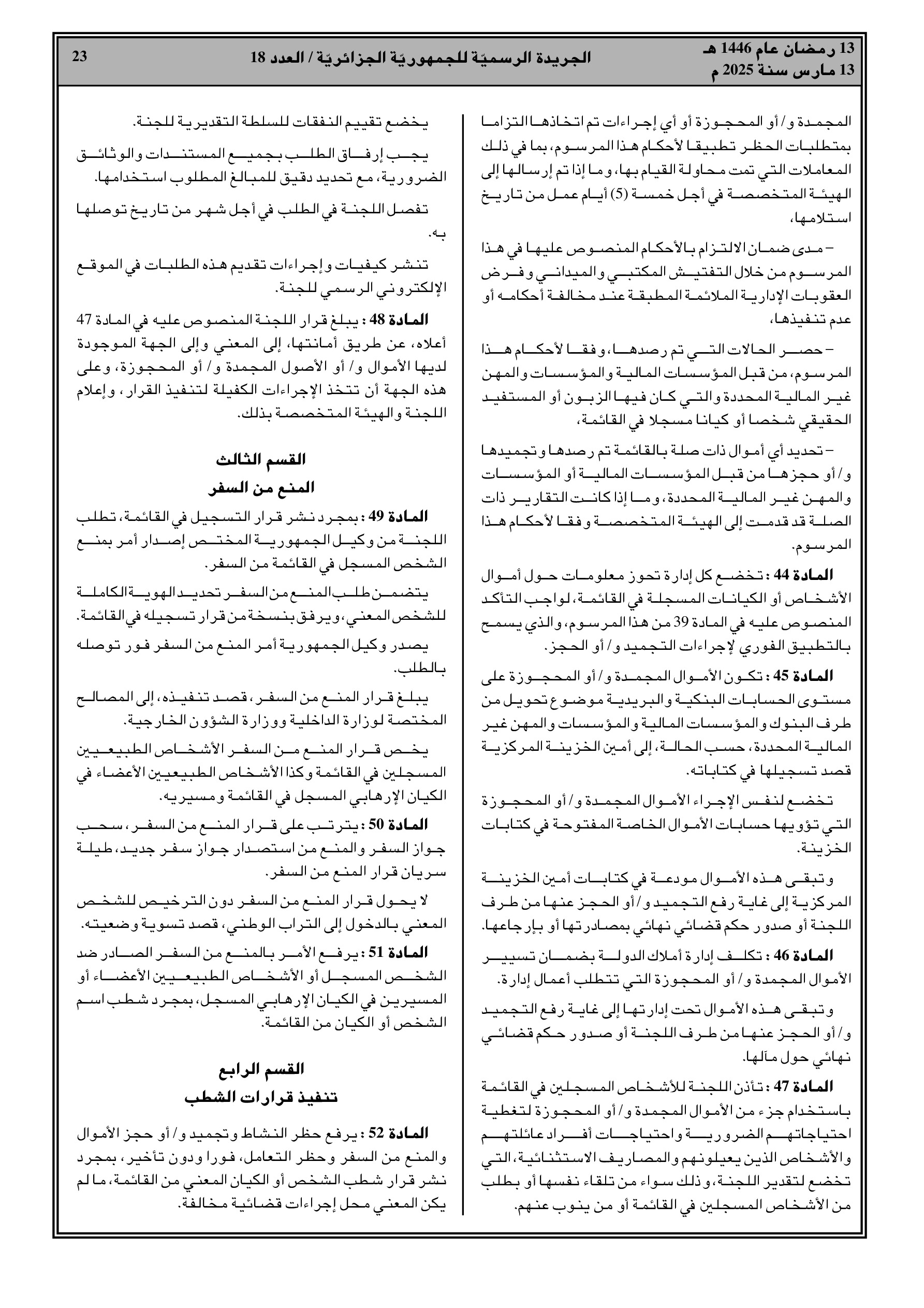 - تحديد إجراءات تجميد أو حجز الأموال للأشخاص والكيانات المدرجة في قوائم العقوبات الأممية. - تفصيل آليات التنفيذ الفوري، حقوق الأطراف الثالثة حسنة النية، والإعفاءات للحاجات الأساسية والنفقات الاستثنائية. - تنظيم حظر السفر والتعاملات المالية مع المدرجين. - إلغاء المرسوم التنفيذي رقم 23-428.