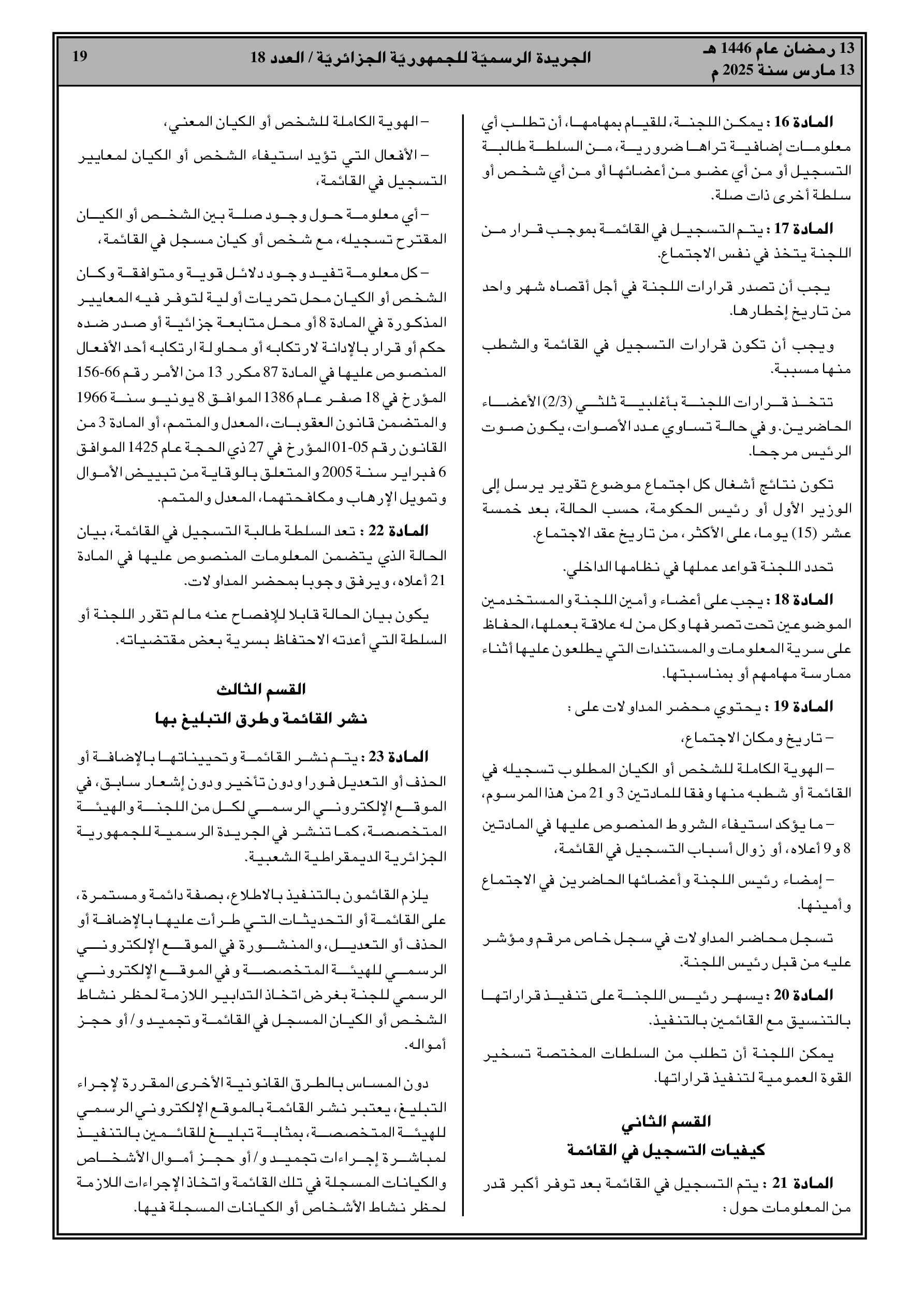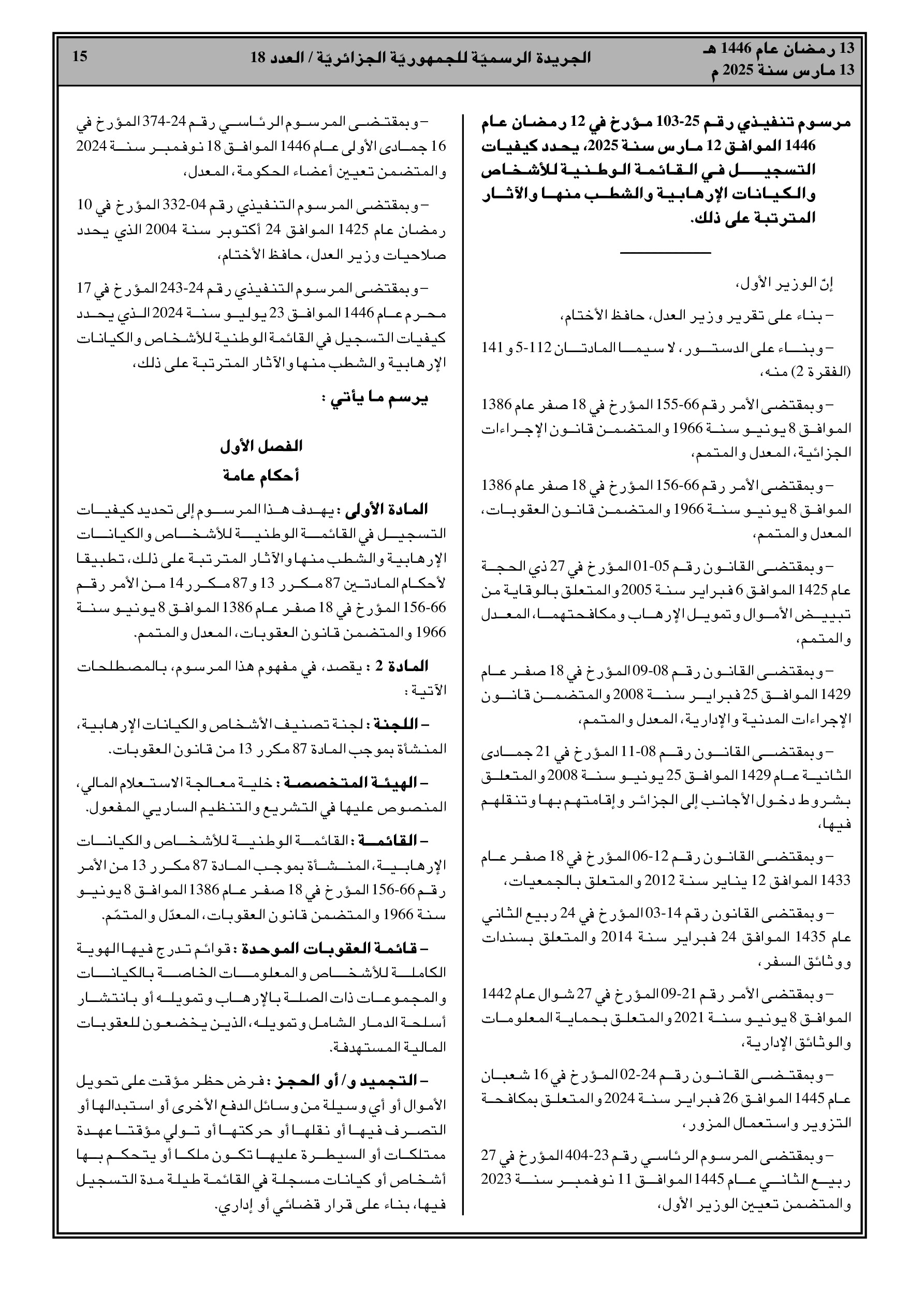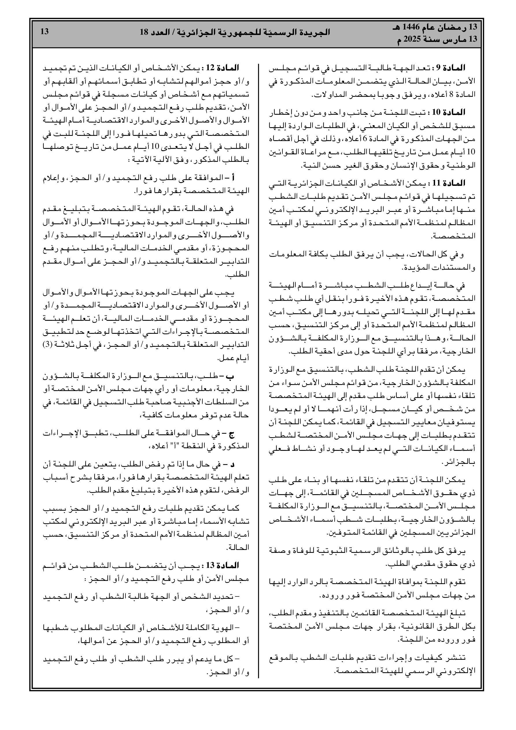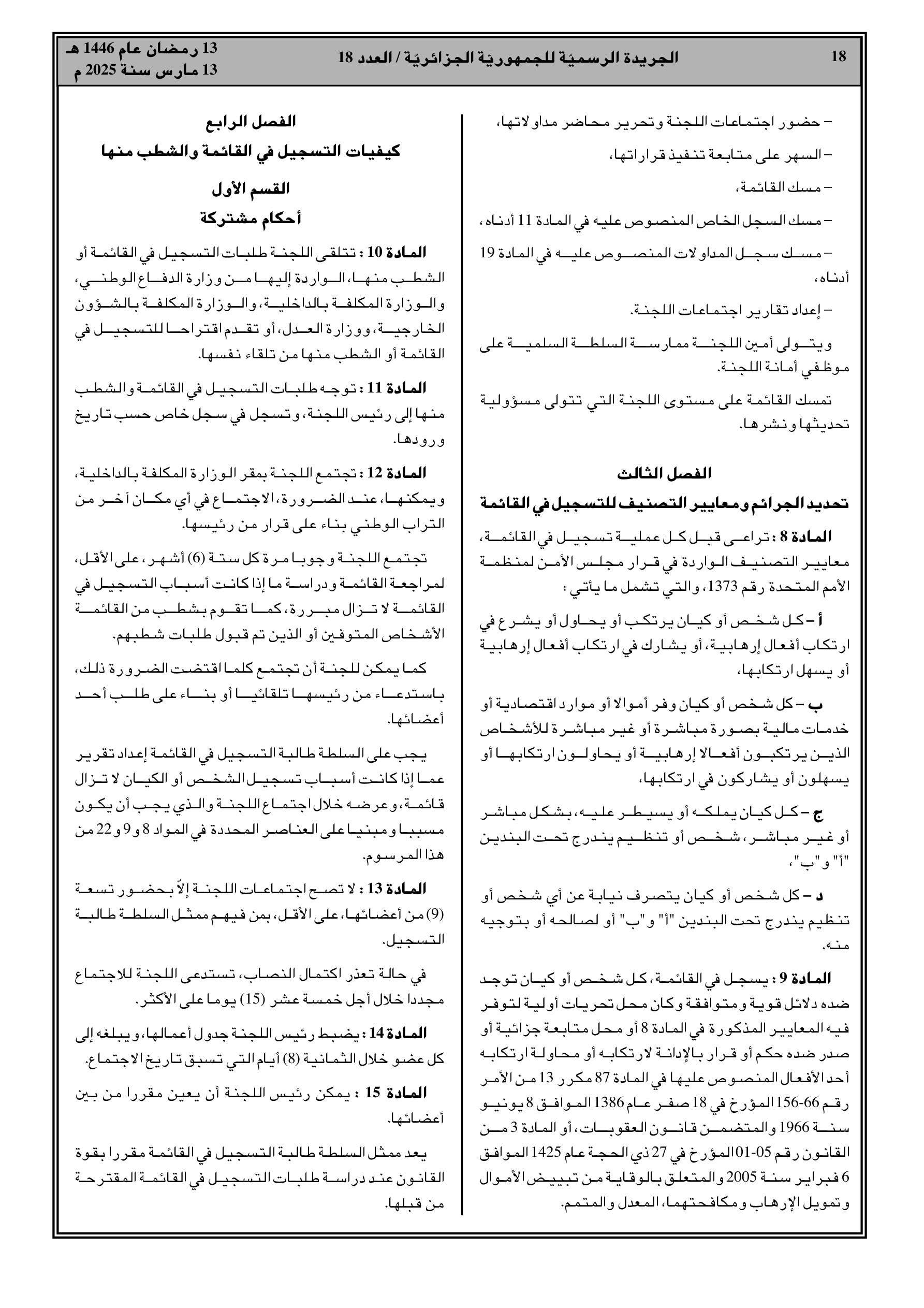 - إنشاء لجنة تصنيف الأشخاص والكيانات الإرهابية برئاسة وزير الداخلية. - تحديد معايير التصنيف بناءً على قرارات مجلس الأمن وأحكام القانون. - تنظيم إجراءات طلب الإدراج، الشطب، مراجعة القائمة، ونشرها. - تفصيل آثار الإدراج: حظر النشاط، تجميد الأموال، حظر السفر. - إلغاء المرسوم التنفيذي رقم 24-243.