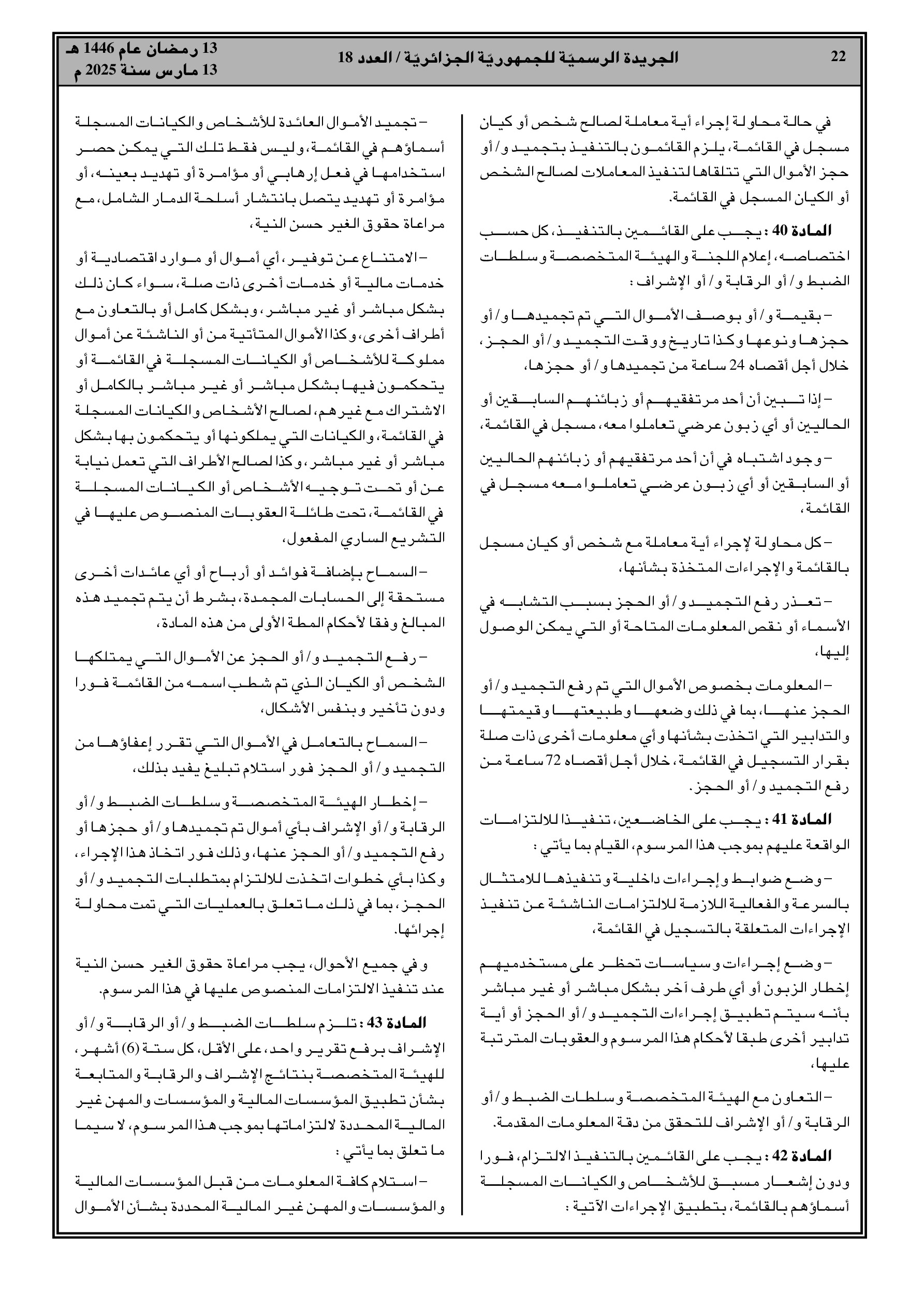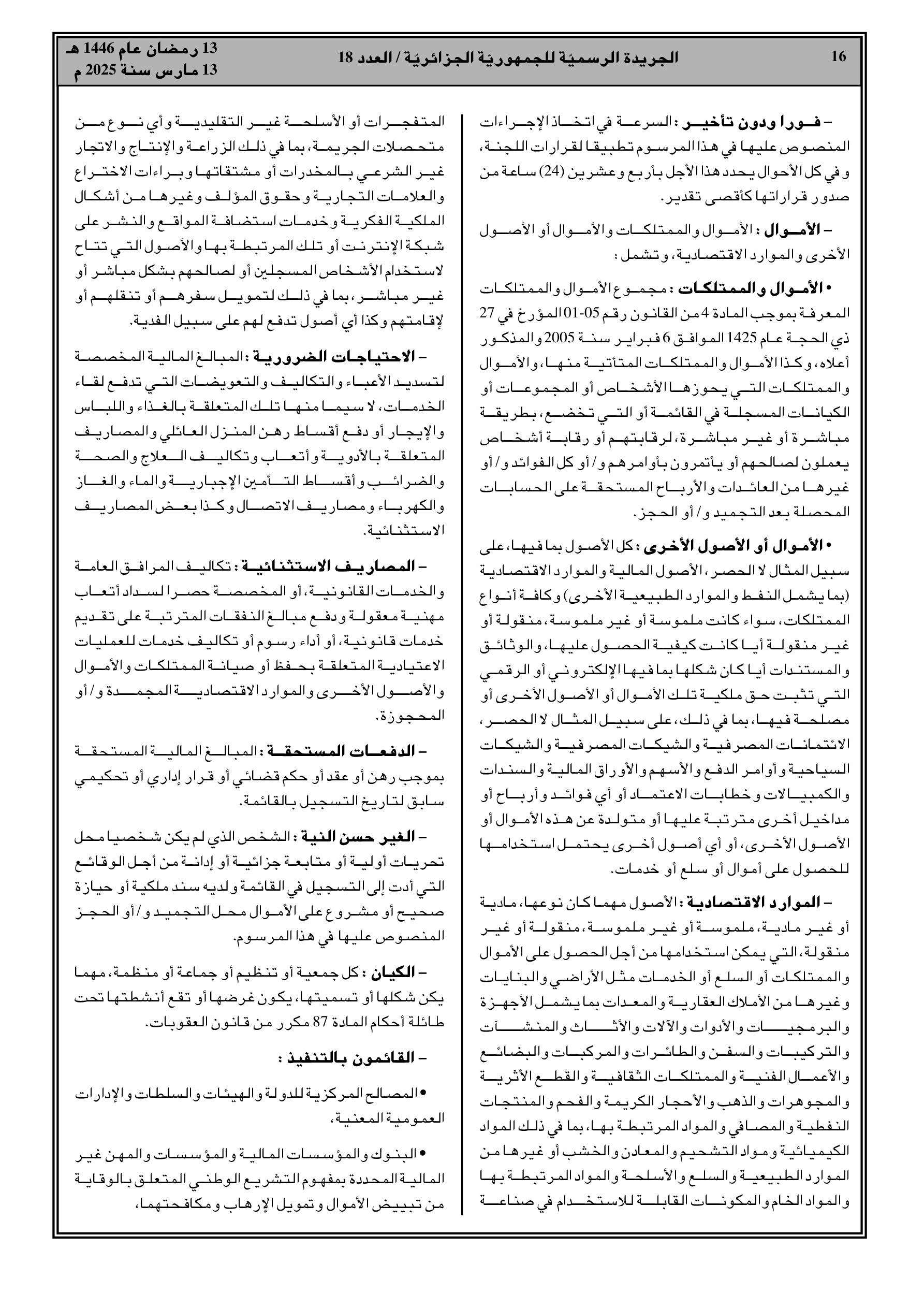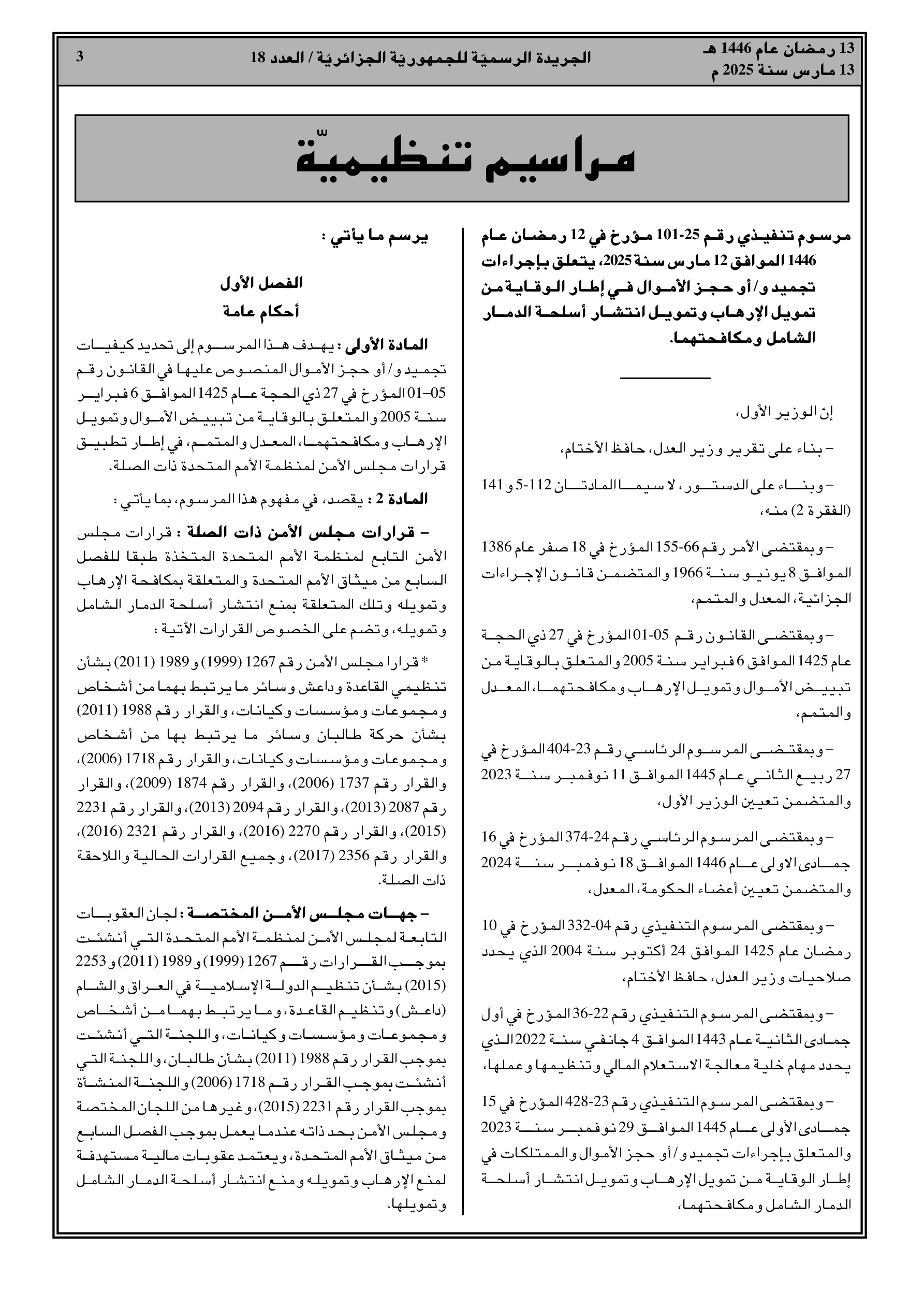 يحدد هذا المرسوم كيفيات تجميد و/أو حجز الأموال تطبيقًا لقرارات مجلس الأمن الأممي ذات الصلة بمكافحة تمويل الإرهاب وتمويل انتشار أسلحة الدمار الشامل.