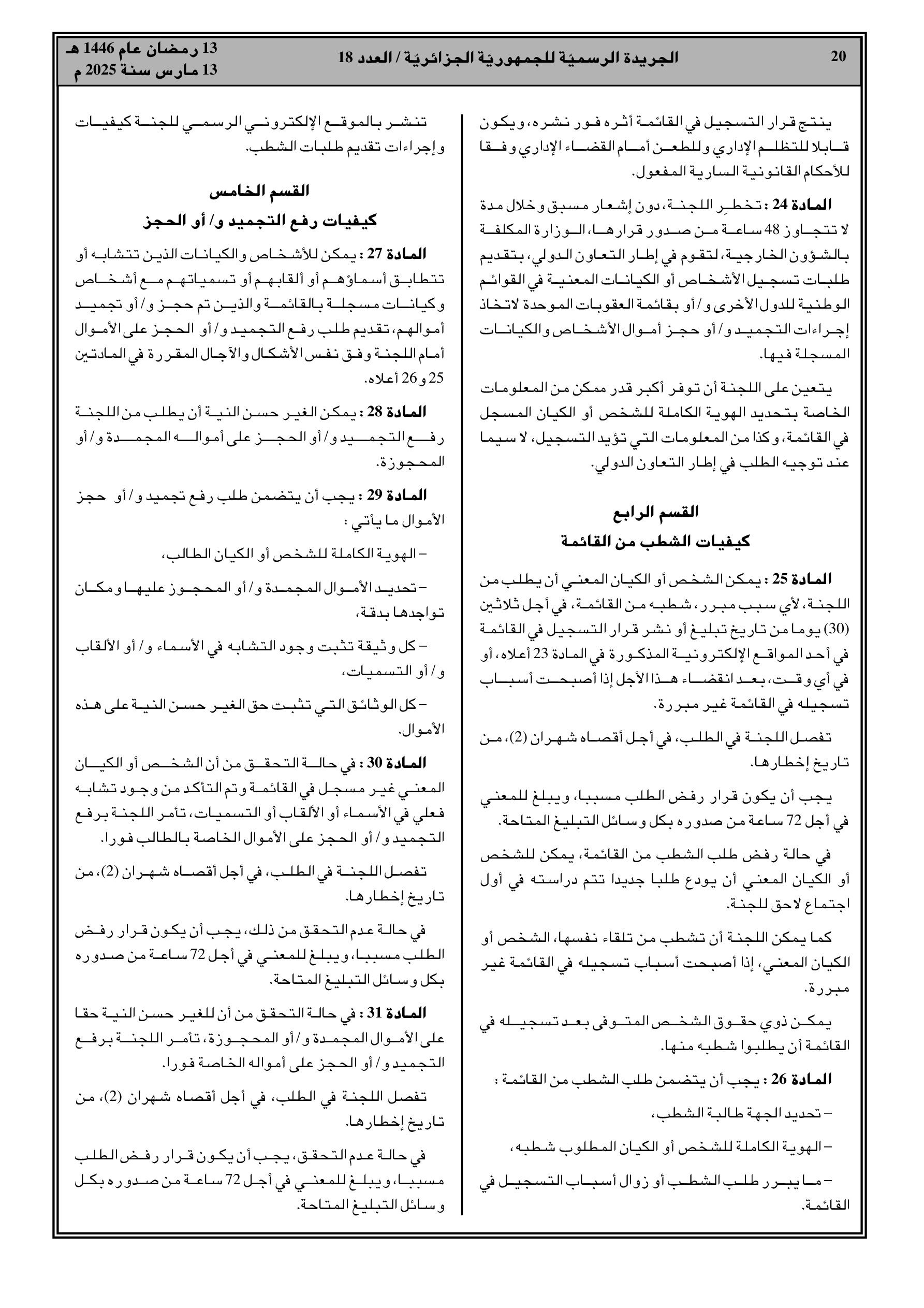 تحديد إجراءات وآليات تسجيل الأشخاص والكيانات في القائمة الوطنية للإرهابيين، وشطبهم منها، والآثار المترتبة على ذلك كحظر النشاط وتجميد الأموال.
