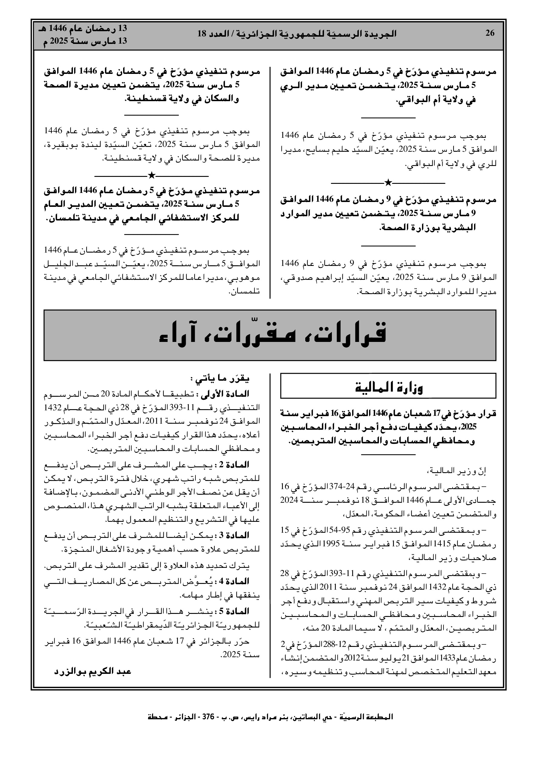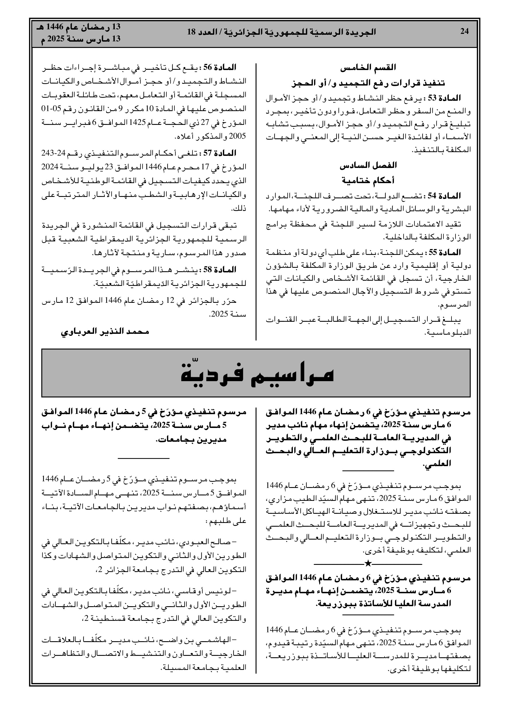 مجموعة من المراسيم التنفيذية المتعلقة بإنهاء مهام وتعيين مسؤولين في قطاعات التعليم العالي، السكن، الموارد المائية، الأشغال العمومية، الصحة، وفي مناصب عليا بالولايات.
