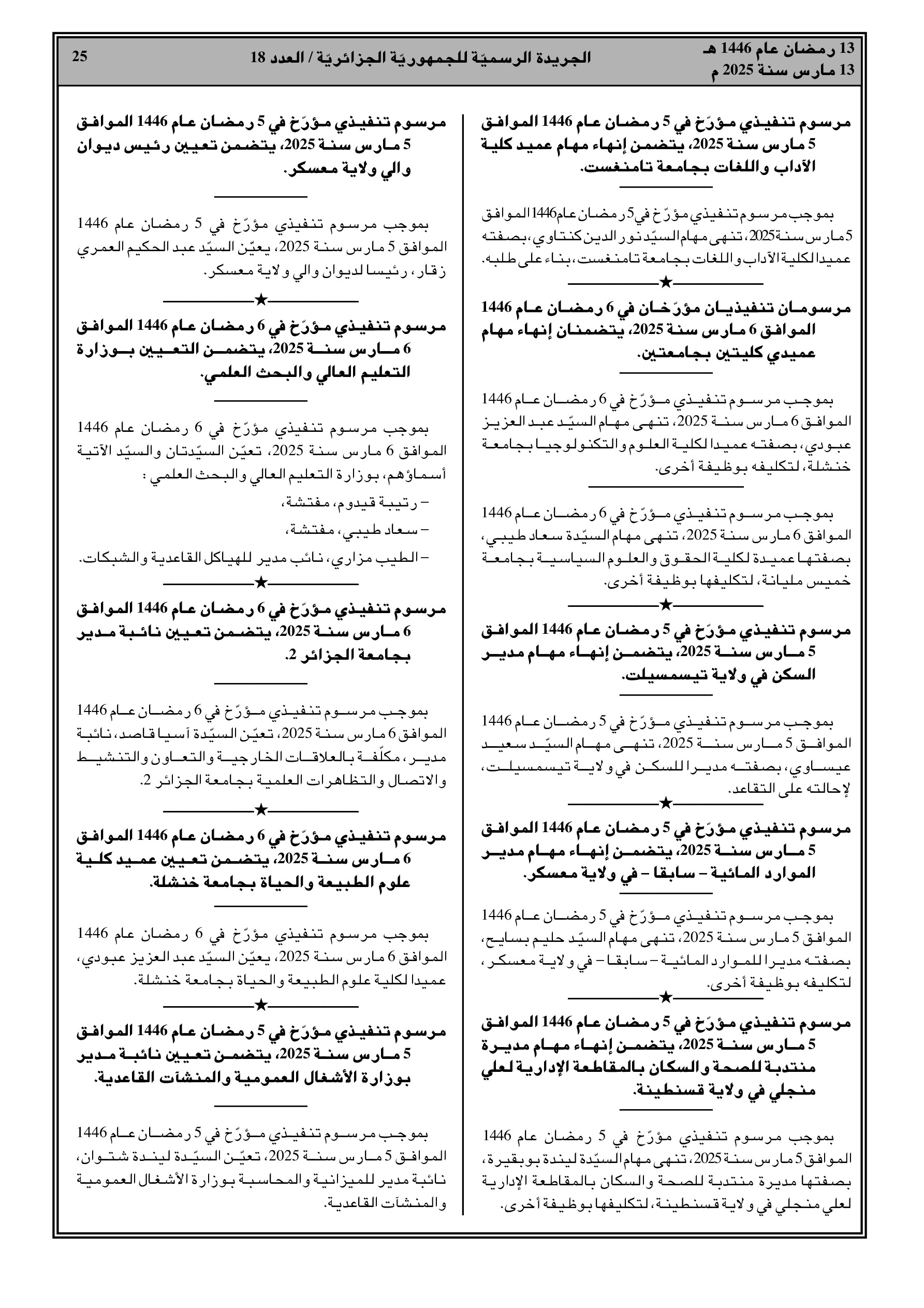 - إنهاء مهام لمسؤولين بوزارة التعليم العالي، المدرسة العليا للأساتذة ببوزريعة، جامعات، مديريات ولائية (السكن تيسمسيلت، الموارد المائية معسكر)، ودائرة علي منجلي (قسنطينة). - تعيينات جديدة تشمل: رئيس ديوان والي معسكر، مناصب بوزارة التعليم العالي، نائبة مدير جامعة الجزائر 2، عميد كلية بجامعة خنشلة، مديرة فرعية بوزارة الأشغال العمومية، مدير الري بأم البواقي، مدير الموارد البشرية بوزارة الصحة، مديرة الصحة بقسنطينة، مدير عام للمستشفى الجامعي بتلمسان.