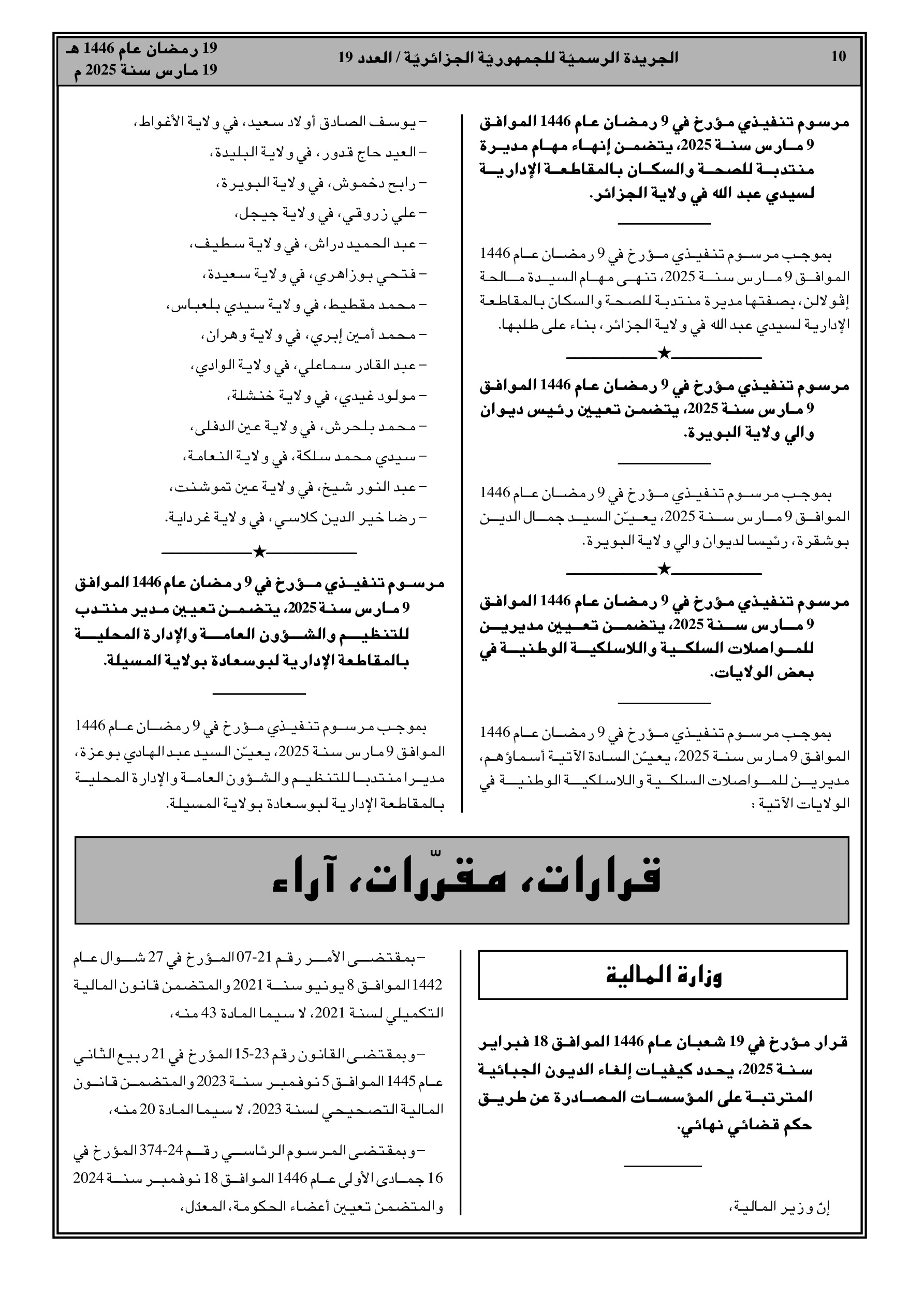 تضمنت القرارات إنهاء مهام مديري اتصالات وطنية بعدة ولايات، أمين عام دائرة الحمادية (تيارت)، وموظفين بوزارة الصحة (مكلف بالدراسات والتلخيص، مديرة فرعية، مكلف بالدراسات، مديرة تنظيم)، ومديري صحة وسكان بعدة ولايات، والمديرة المنتدبة للصحة بسيدي عبد الله (الجزائر). كما تم تعيين رئيس ديوان والي البويرة، ومديري اتصالات وطنية جدد، ومدير منتدب للتنظيم والشؤون العامة والإدارة المحلية ببوسعادة (المسيلة).