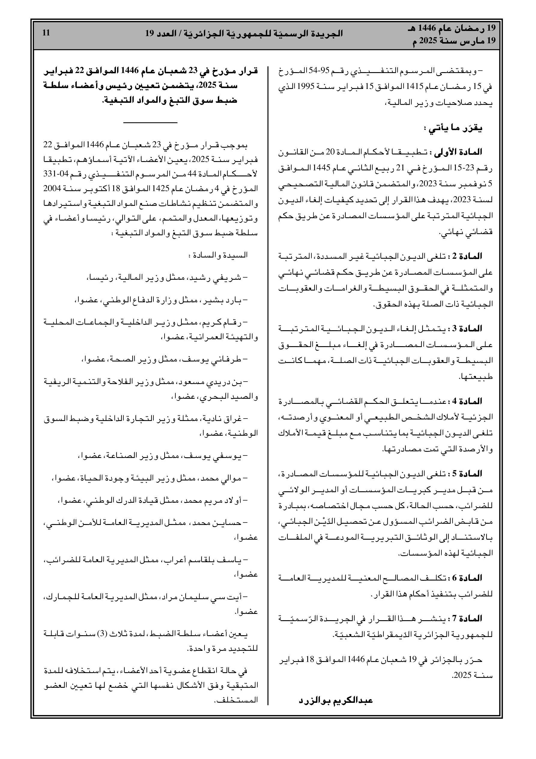 قرار يتضمن تعيين رئيس وأعضاء سلطة ضبط سوق التبغ والمواد التبغية، تطبيقاً للمرسوم التنفيذي رقم 04-331.