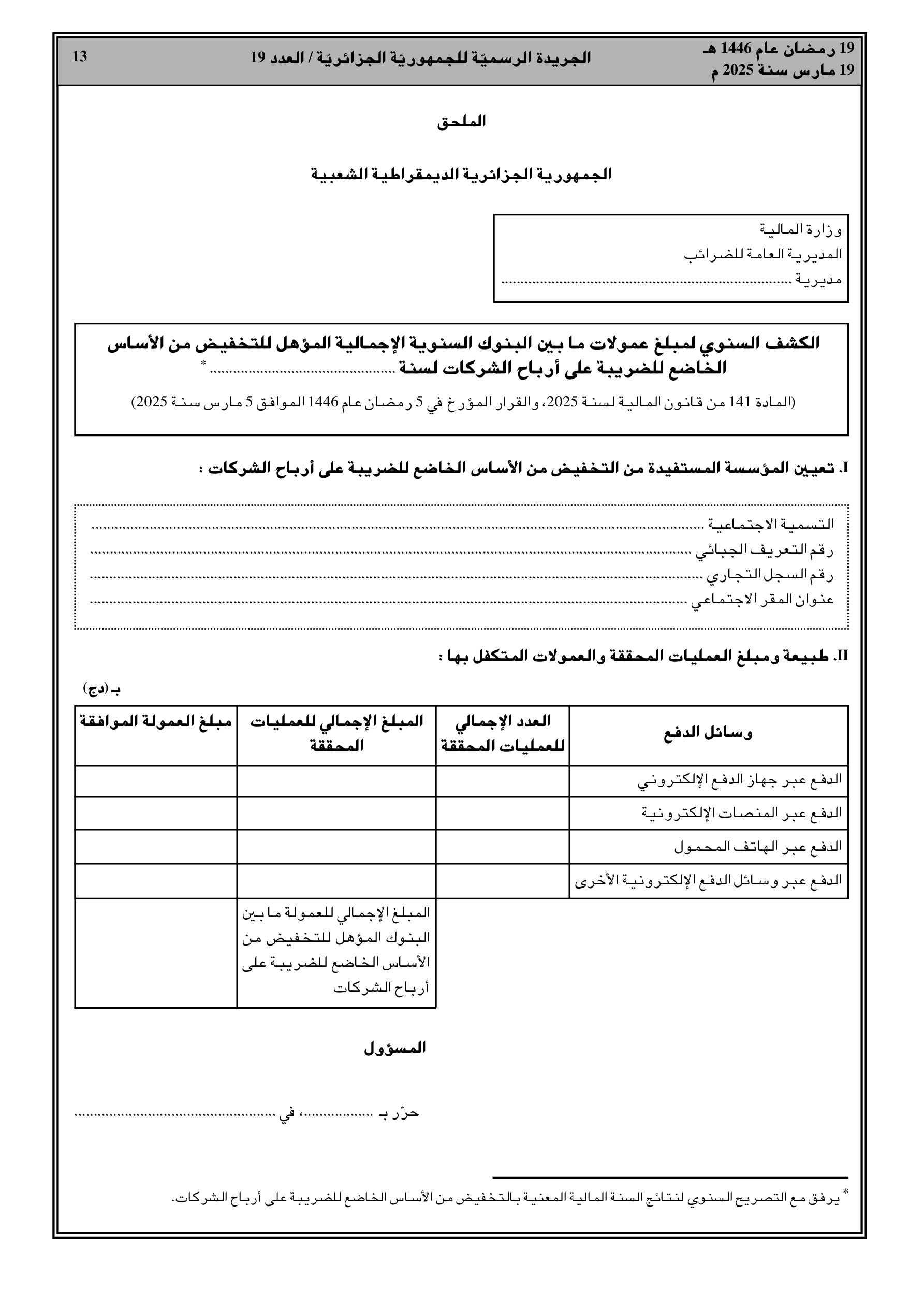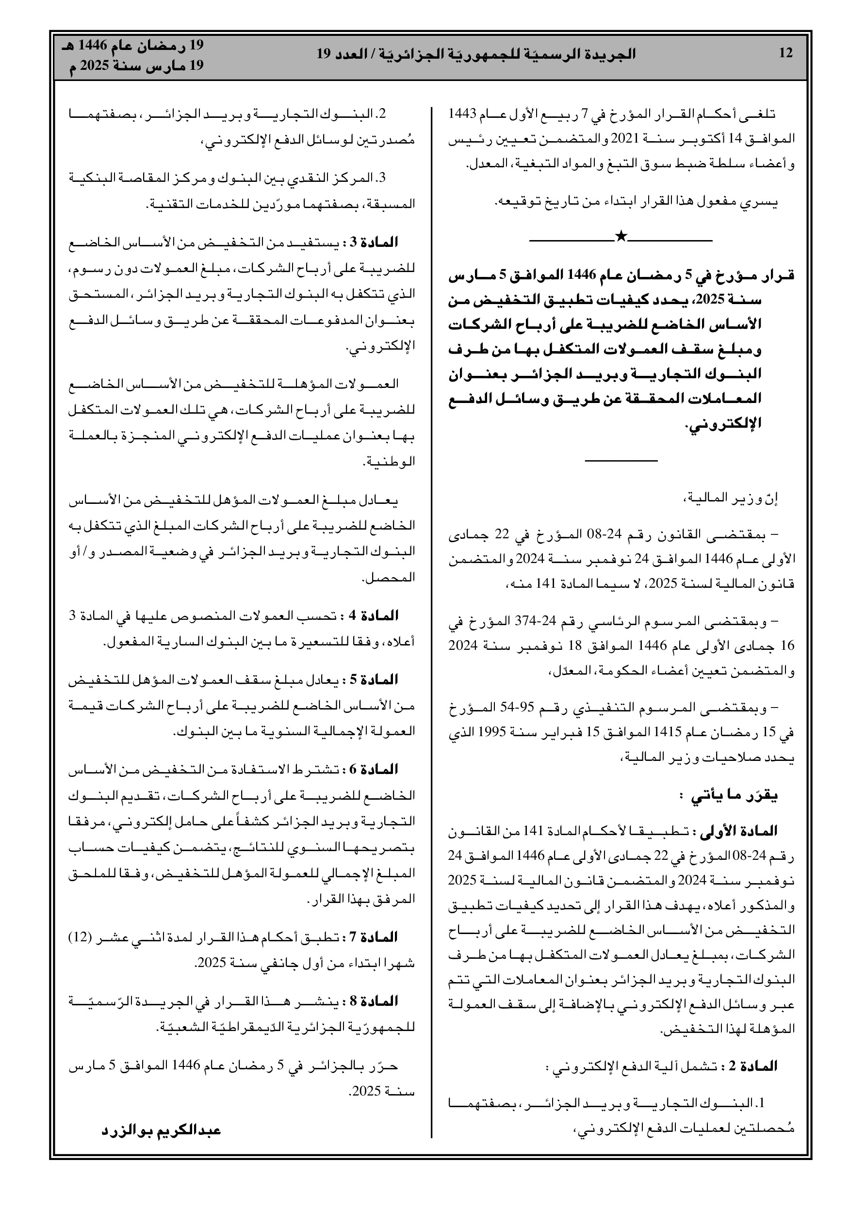 قرار يحدد كيفيات تطبيق تخفيض الوعاء الضريبي للضريبة على أرباح الشركات بما يعادل العمولات المدفوعة عن عمليات الدفع الإلكتروني، وذلك لتشجيع هذه الوسيلة.