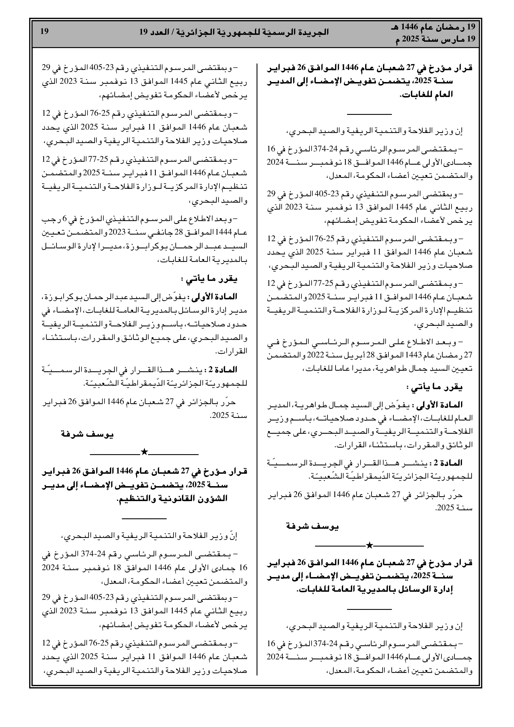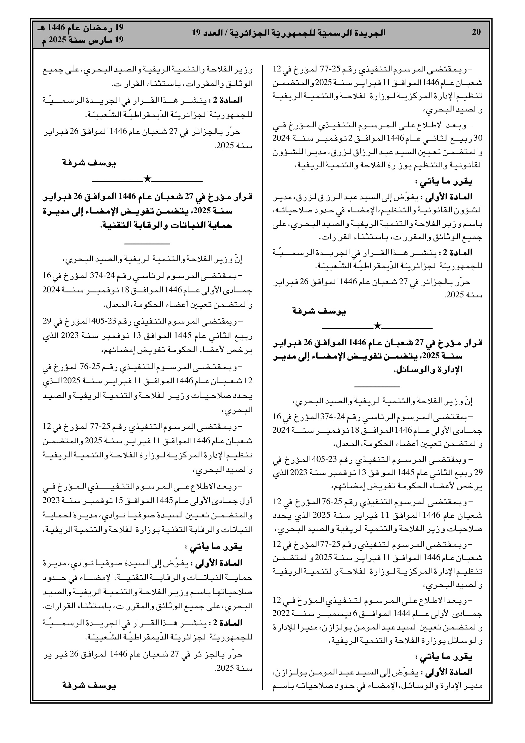 قرارات وزارية متعددة تمنح تفويض التوقيع لعدة مديرين مركزيين بوزارة الفلاحة والتنمية الريفية والصيد البحري.