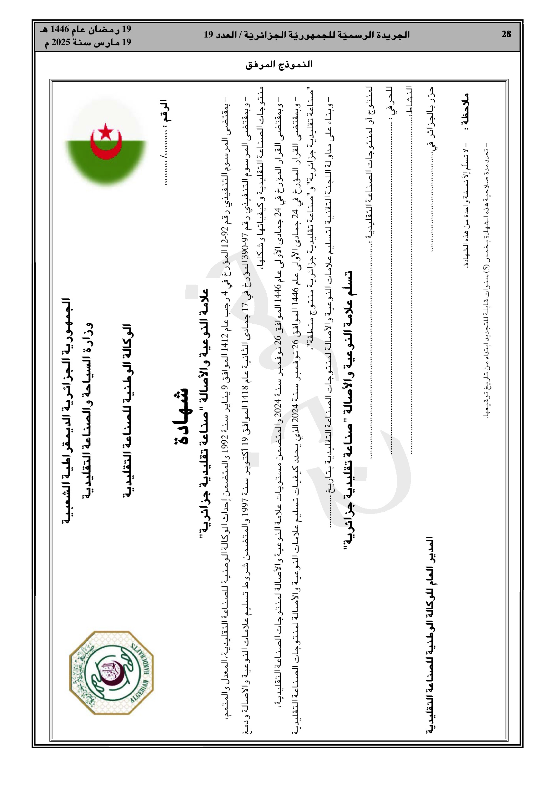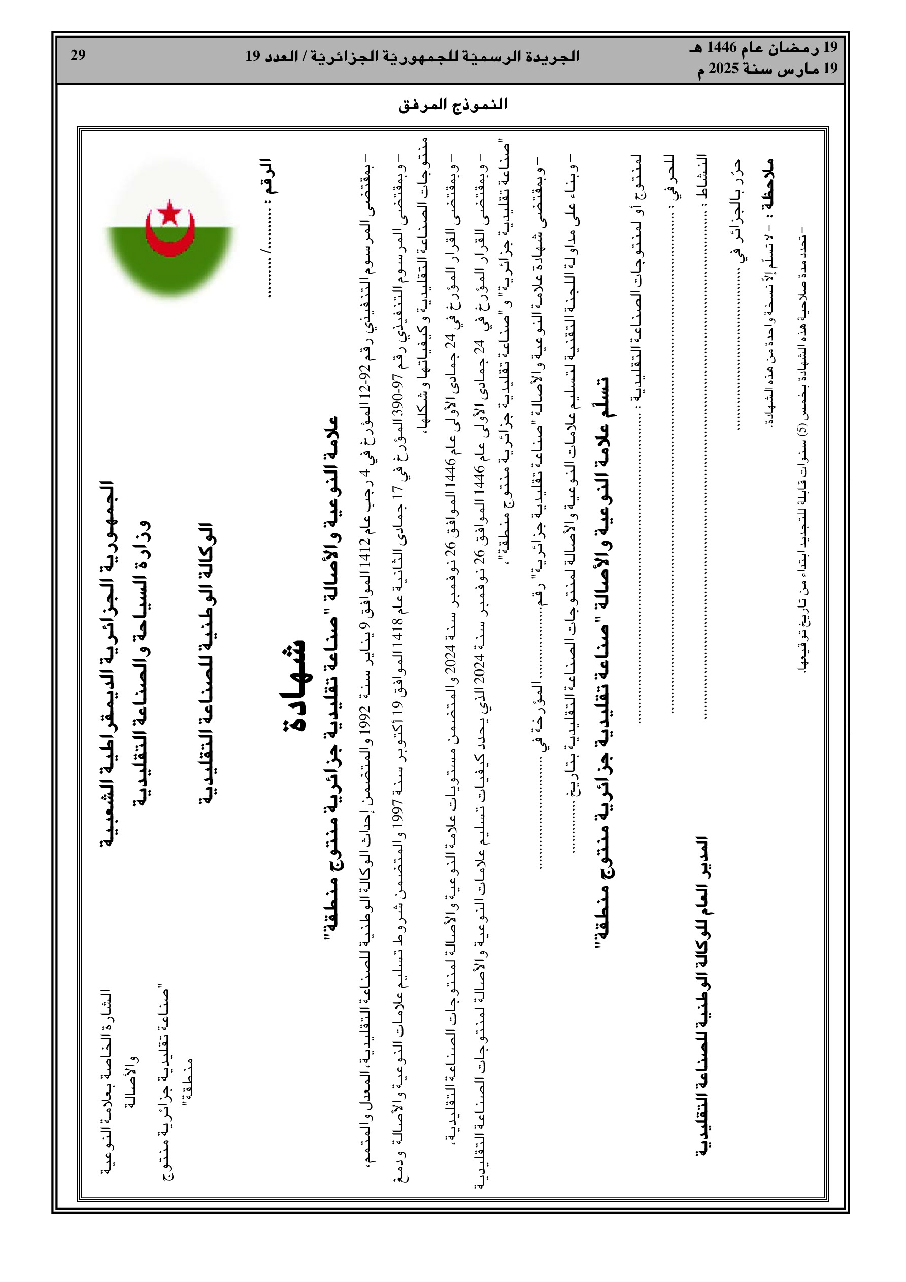 قرار يحدد كيفيات وإجراءات منح علامتي الجودة والأصالة "صناعة تقليدية جزائرية" و"صناعة تقليدية جزائرية منتوج منطقة".