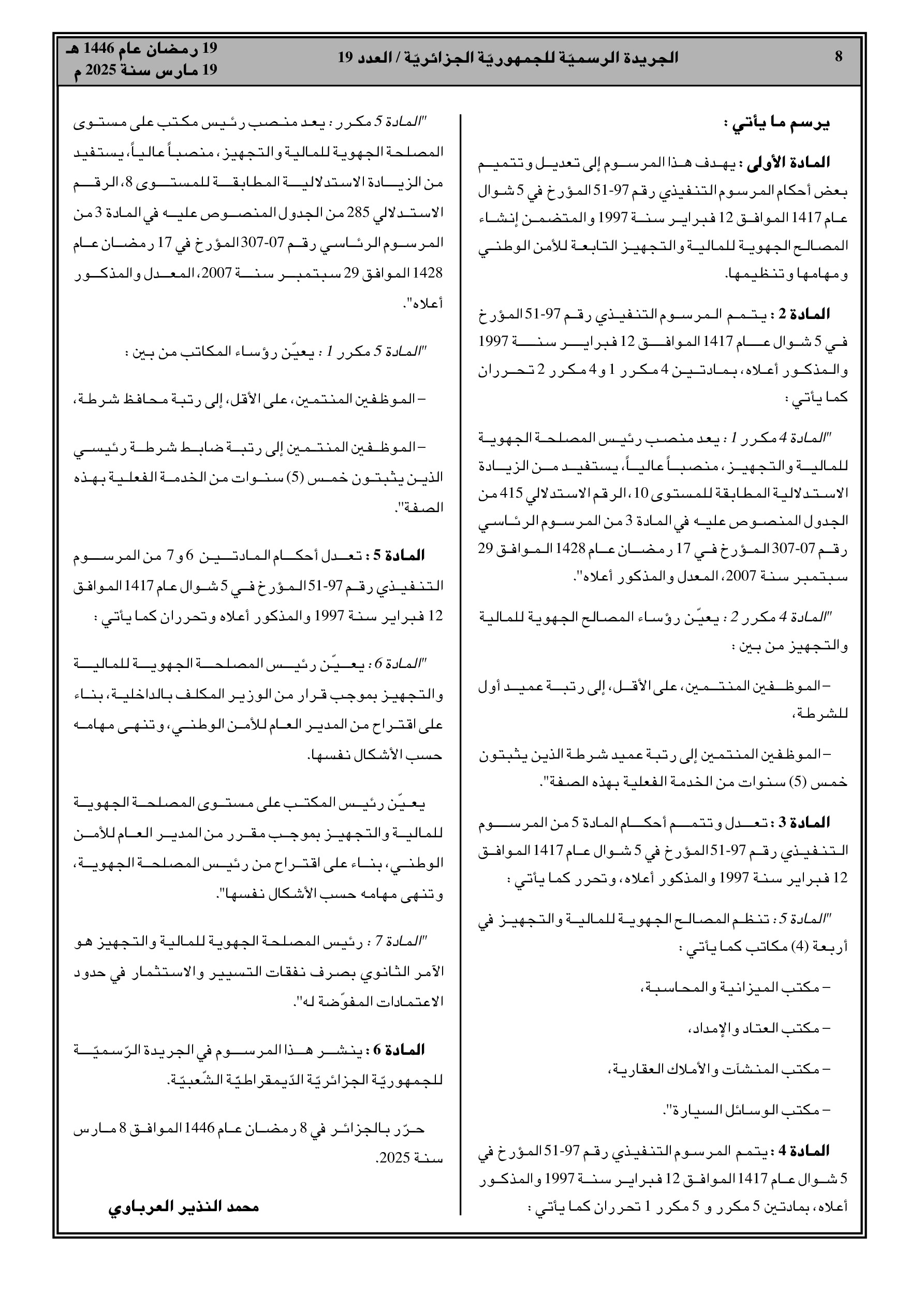 تعديل المرسوم التنفيذي رقم 97-51 المتعلق بإنشاء ومهام وتنظيم المصالح الجهوية للمالية والتجهيز للأمن الوطني.