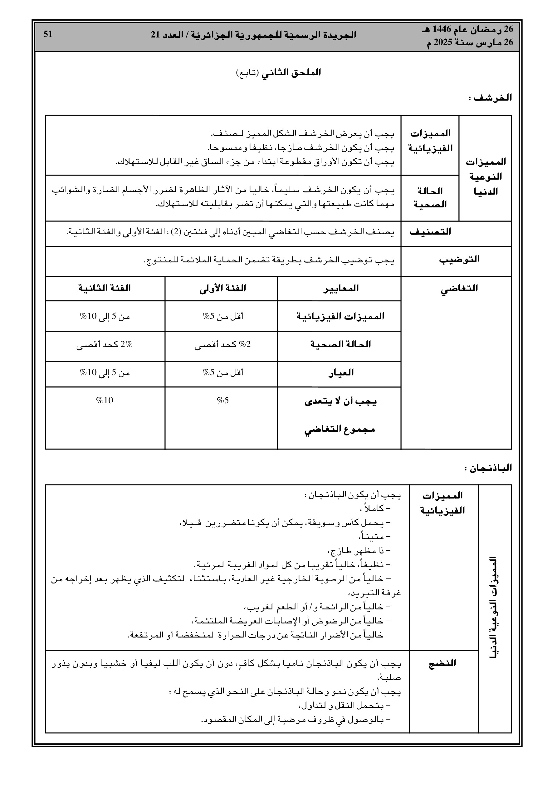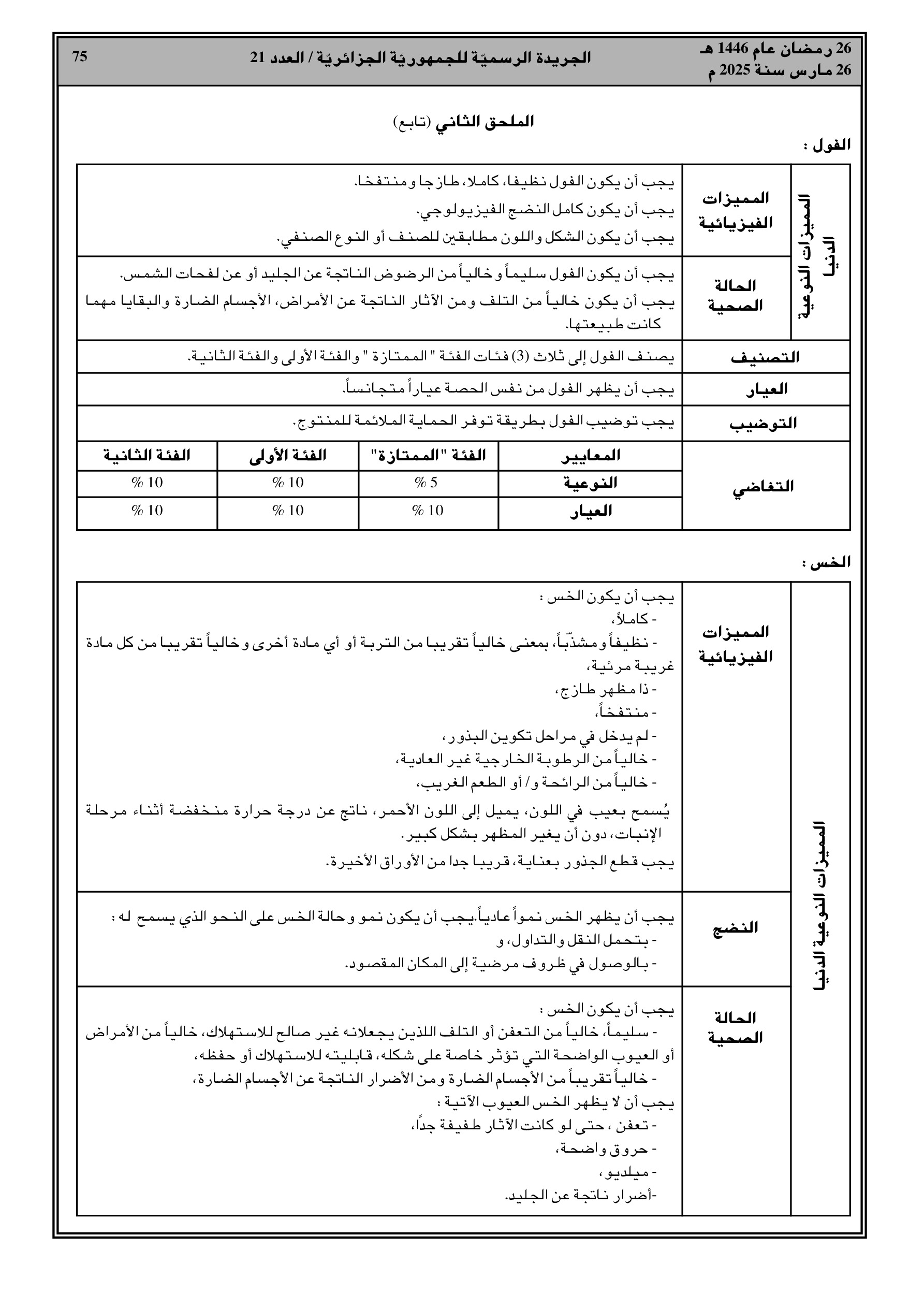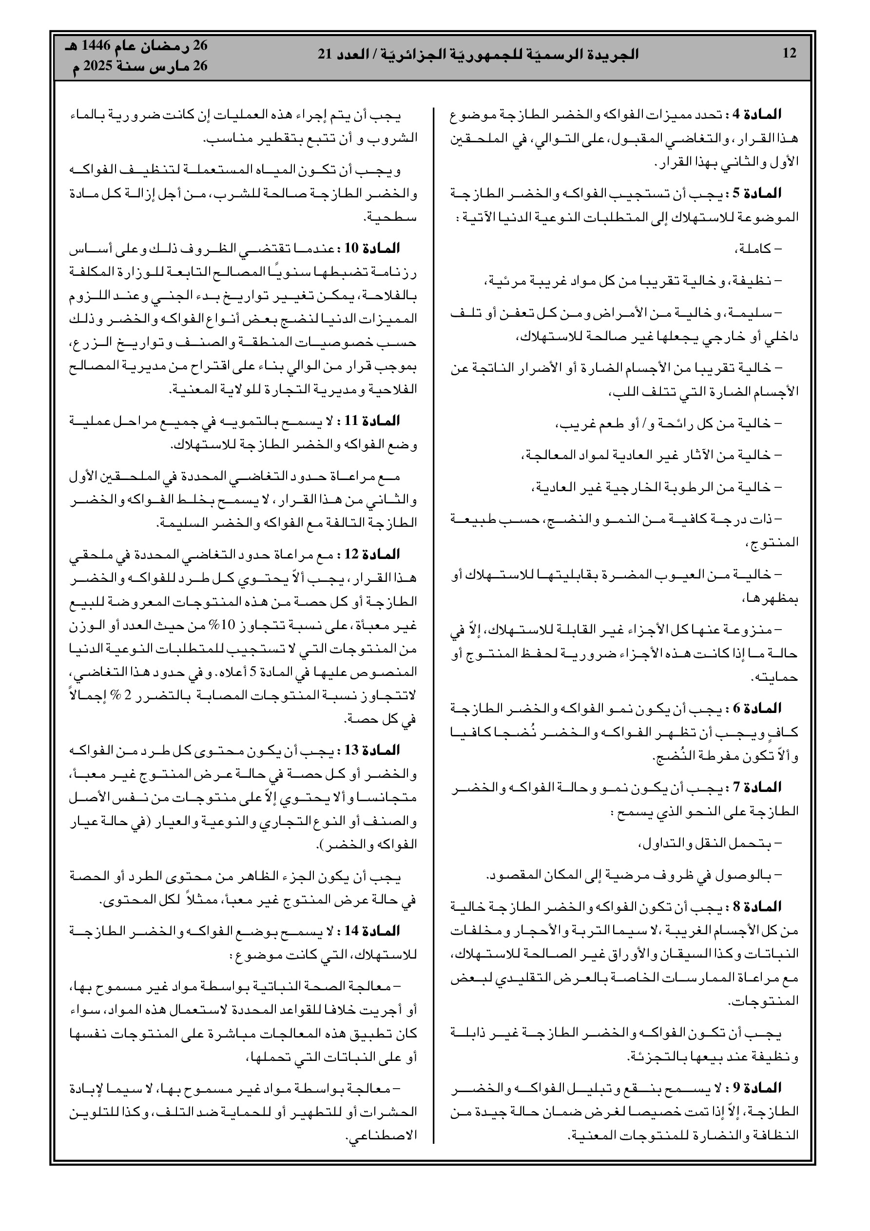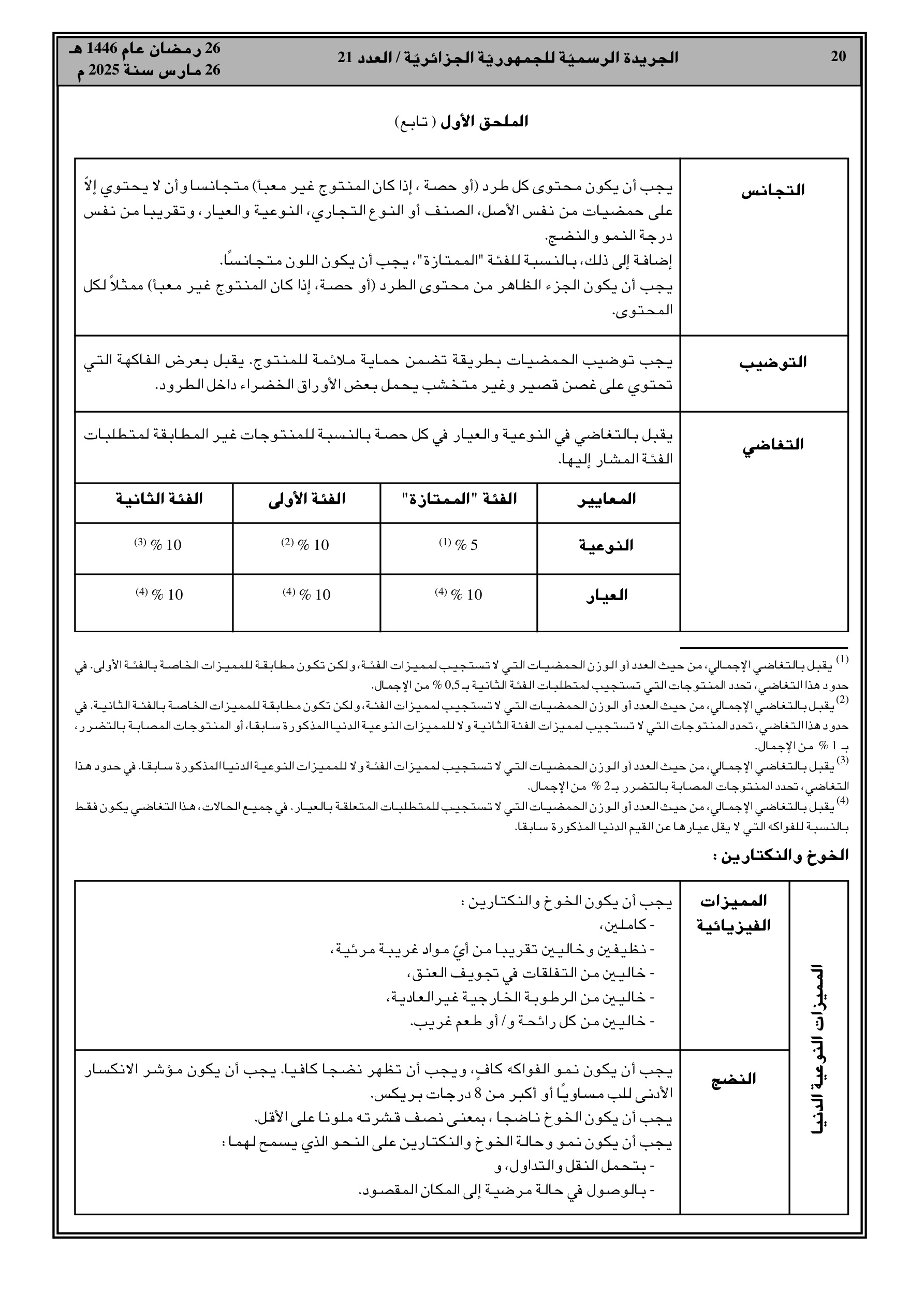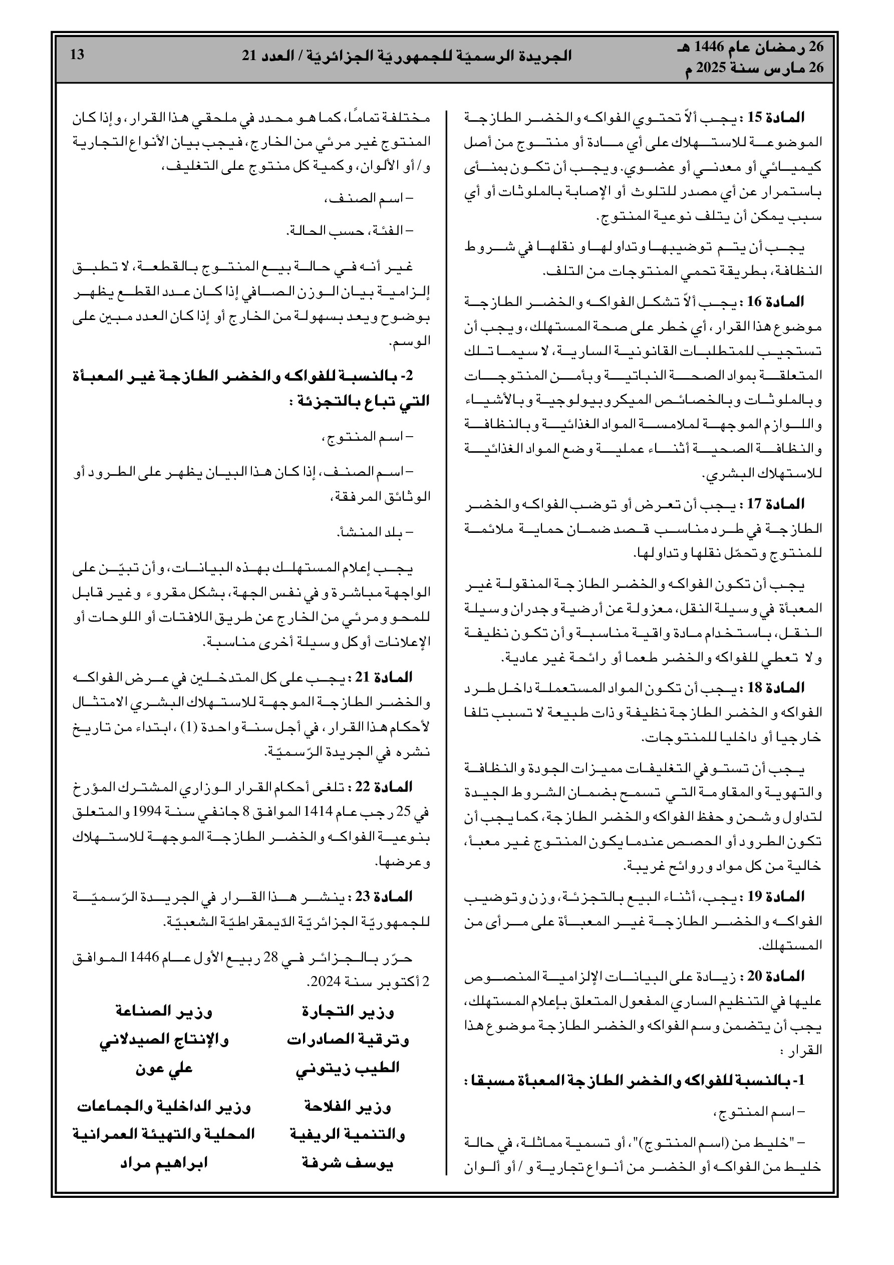 قرار وزاري مشترك يعتمد اللائحة الفنية التي تحدد المواصفات وشروط عرض الفواكه والخضر الطازجة الموجهة للاستهلاك البشري. يحدد المصطلحات الأساسية، متطلبات الجودة والنضج الدنيا، وشروط النقل، النظافة، والعرض. يحظر القرار المعالجات غير المصرح بها والتلوين الاصطناعي، ويحدد متطلبات التعبئة والتغليف والوسم. يلغي القرار المؤرخ في 8 يناير 1994، ويمنح مهلة امتثال لمدة عام واحد. الملحق الأول يפרّق الخصائص التفصيلية لعدة فواكه (مثل المشمش، الحمضيات، الخوخ، التفاح، العنب، الطماطم). الملحق الثاني يפרّق خصائص مختلف الخضروات (مثل الخرشوف، الجزر، القرنبيط، الباذنجان، الكوسة، البطاطس).