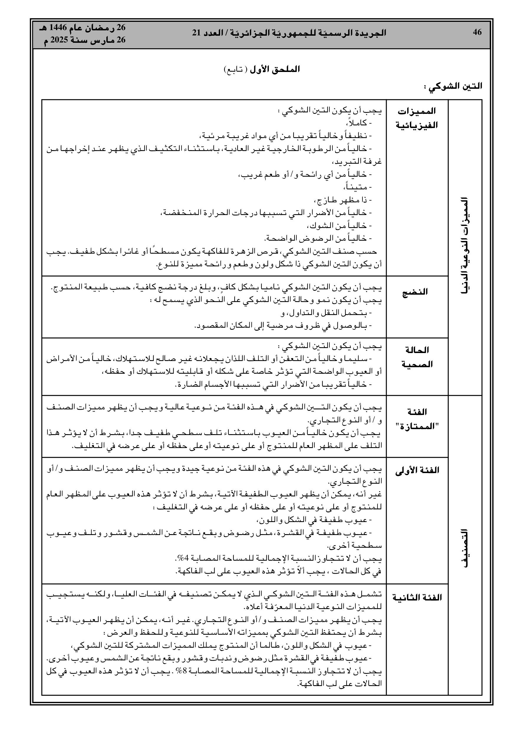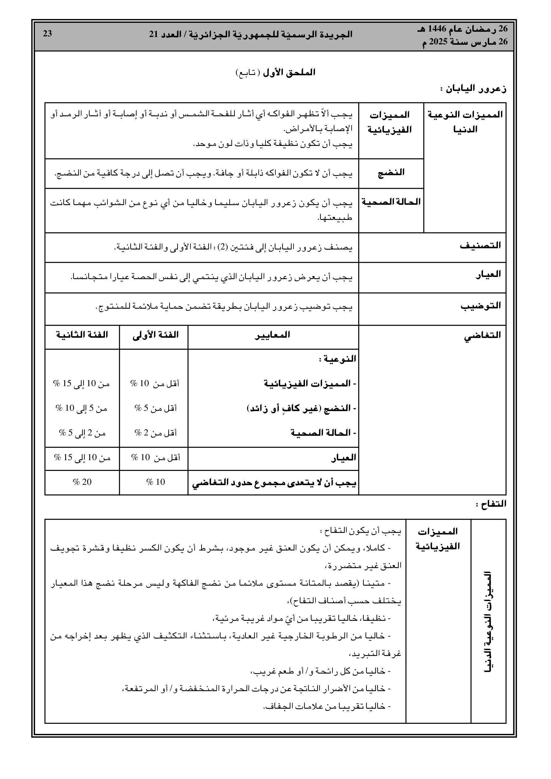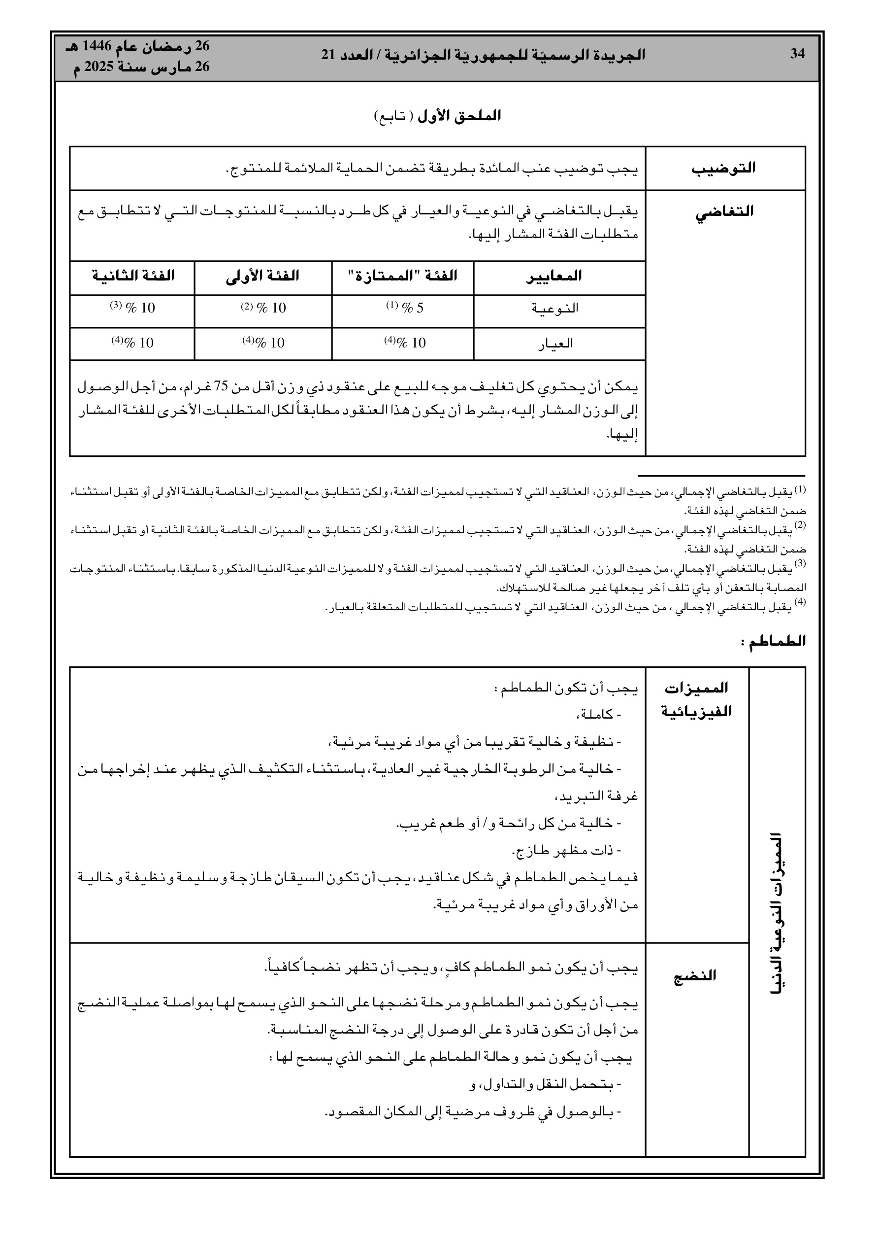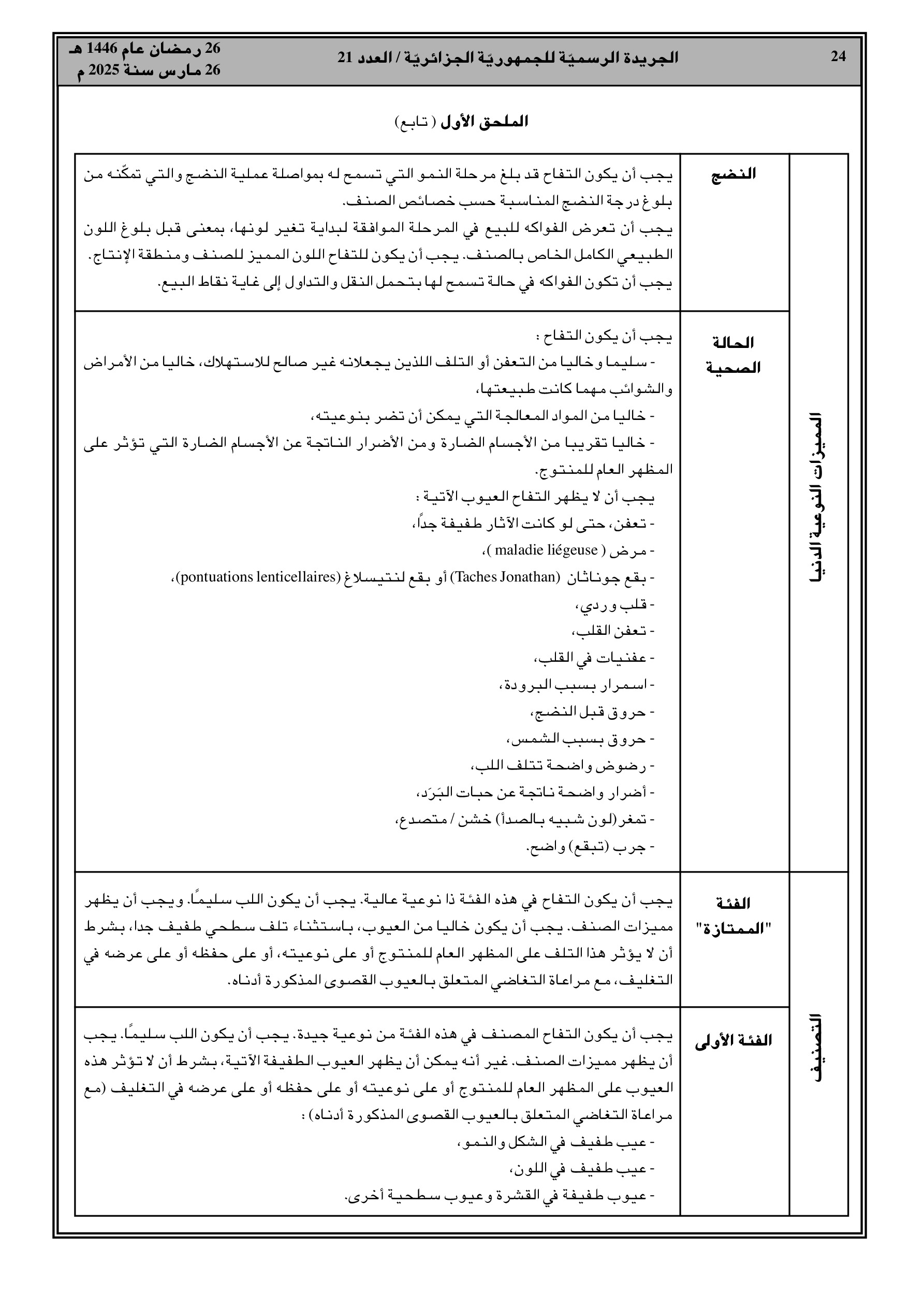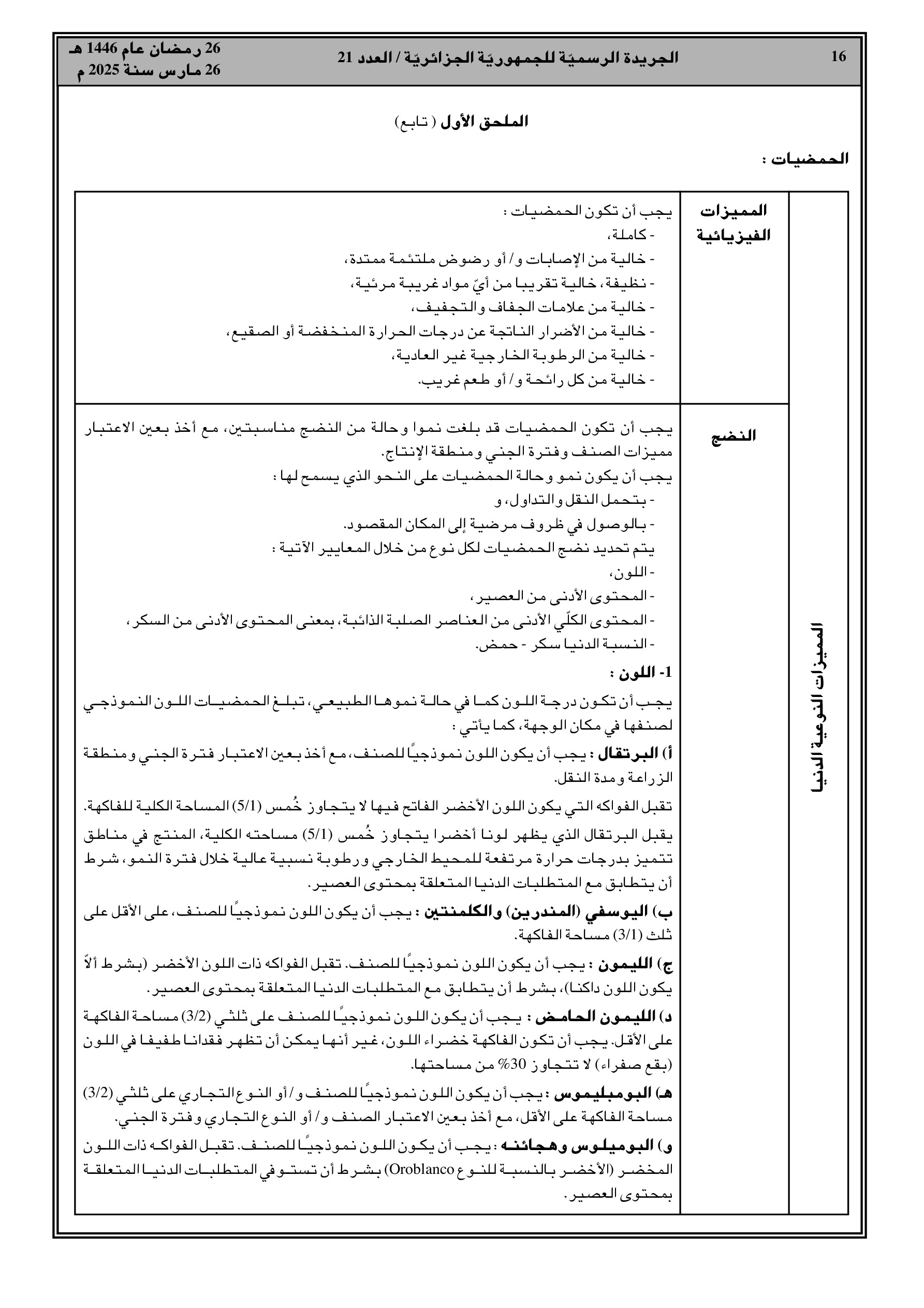 قرار وزاري مشترك يعتمد اللائحة الفنية التي تحدد المواصفات وشروط عرض الفواكه والخضر الطازجة الموجهة للاستهلاك البشري. يحدد المصطلحات الأساسية، متطلبات الجودة والنضج الدنيا، وشروط النقل، النظافة، والعرض. يحظر القرار المعالجات غير المصرح بها والتلوين الاصطناعي، ويحدد متطلبات التعبئة والتغليف والوسم. يلغي القرار المؤرخ في 8 يناير 1994، ويمنح مهلة امتثال لمدة عام واحد. الملحق الأول يפרّق الخصائص التفصيلية لعدة فواكه (مثل المشمش، الحمضيات، الخوخ، التفاح، العنب، الطماطم). الملحق الثاني يפרّق خصائص مختلف الخضروات (مثل الخرشوف، الجزر، القرنبيط، الباذنجان، الكوسة، البطاطس).