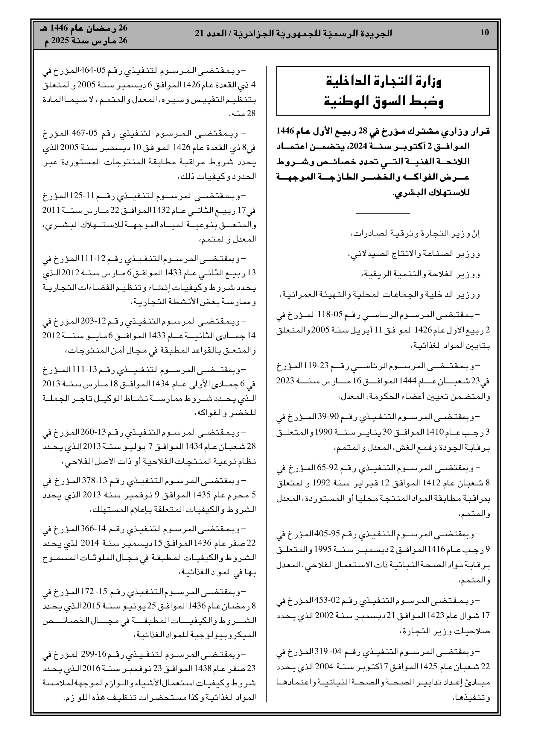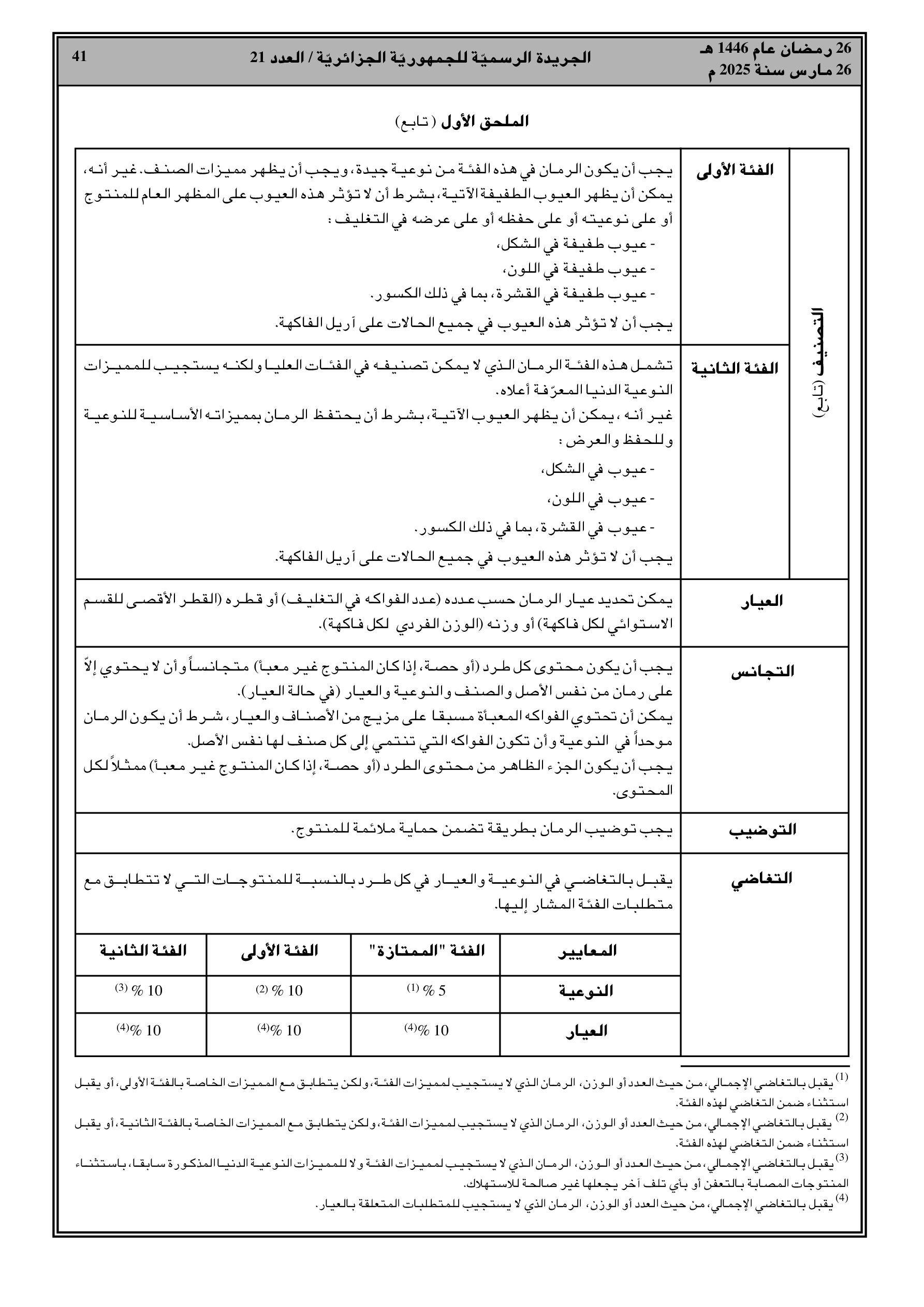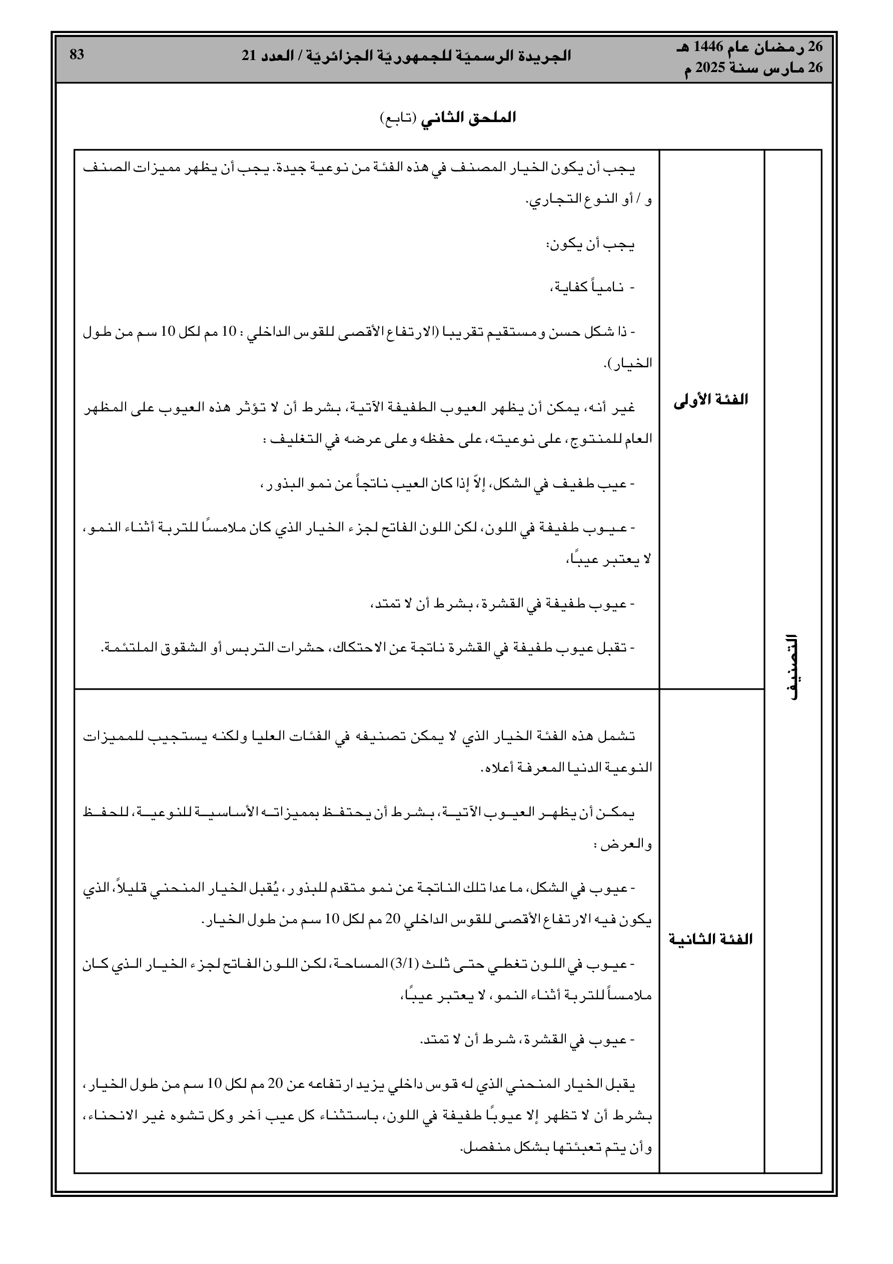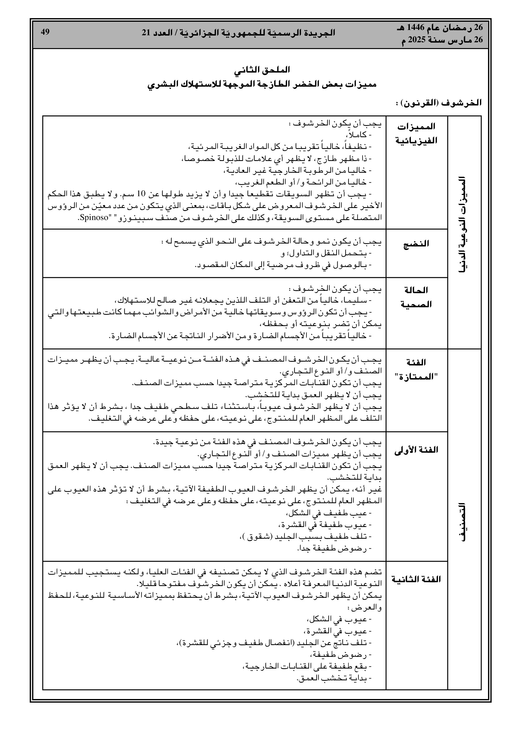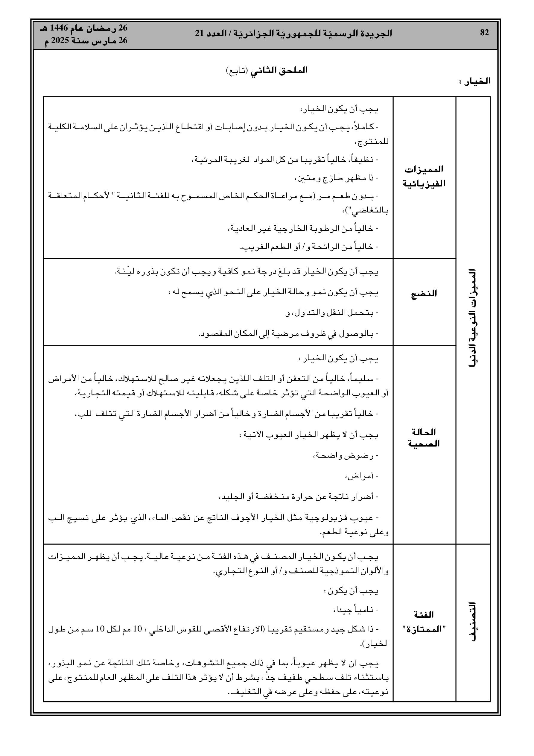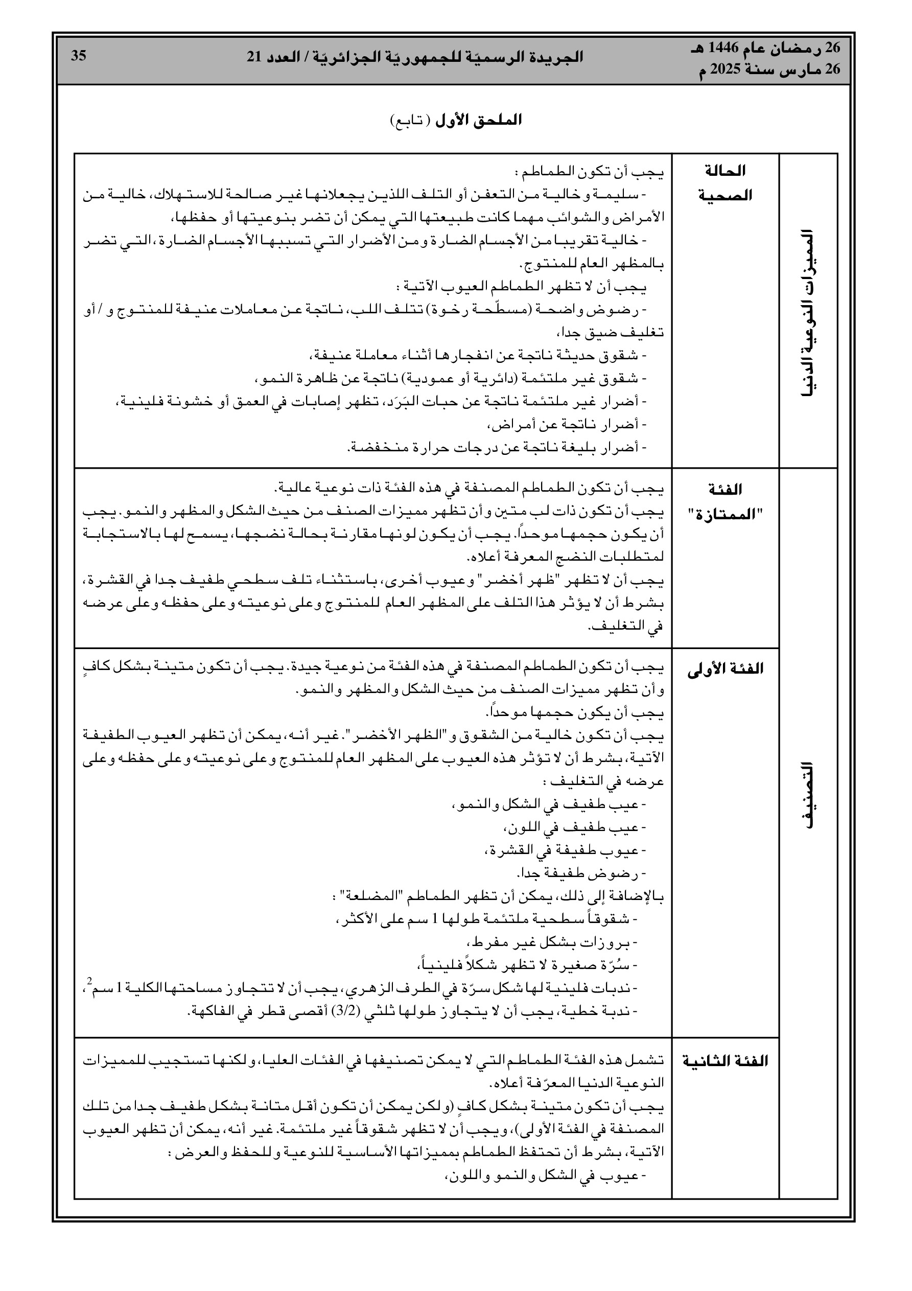 قرار وزاري مشترك يعتمد اللائحة الفنية التي تحدد المواصفات وشروط عرض الفواكه والخضر الطازجة الموجهة للاستهلاك البشري. يحدد المصطلحات الأساسية، متطلبات الجودة والنضج الدنيا، وشروط النقل، النظافة، والعرض. يحظر القرار المعالجات غير المصرح بها والتلوين الاصطناعي، ويحدد متطلبات التعبئة والتغليف والوسم. يلغي القرار المؤرخ في 8 يناير 1994، ويمنح مهلة امتثال لمدة عام واحد. الملحق الأول يפרّق الخصائص التفصيلية لعدة فواكه (مثل المشمش، الحمضيات، الخوخ، التفاح، العنب، الطماطم). الملحق الثاني يפרّق خصائص مختلف الخضروات (مثل الخرشوف، الجزر، القرنبيط، الباذنجان، الكوسة، البطاطس).