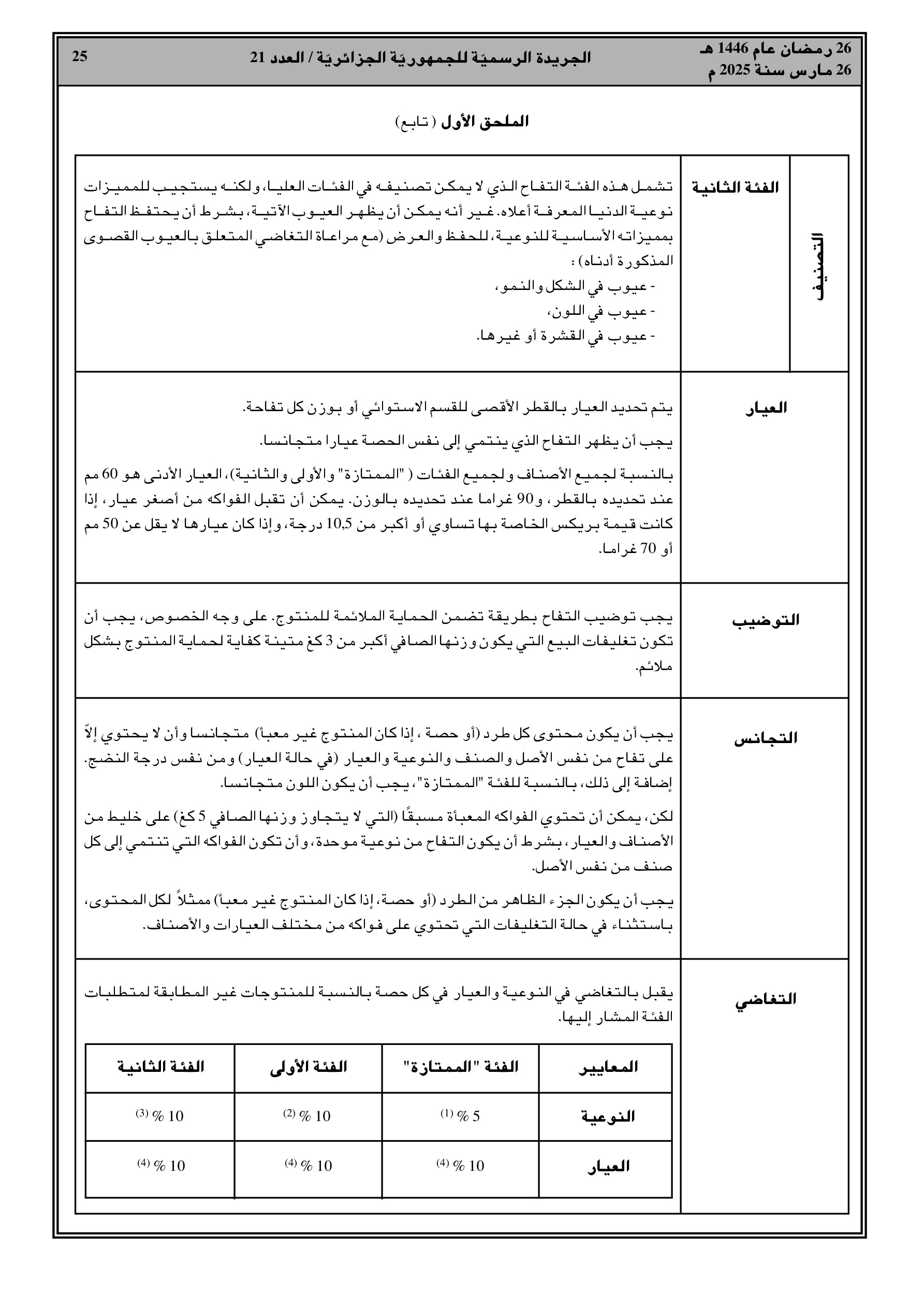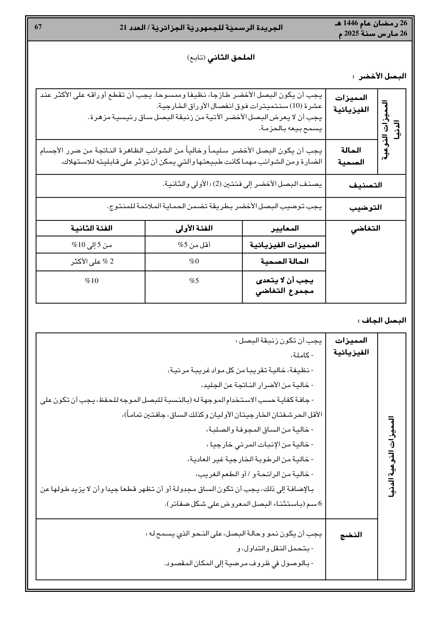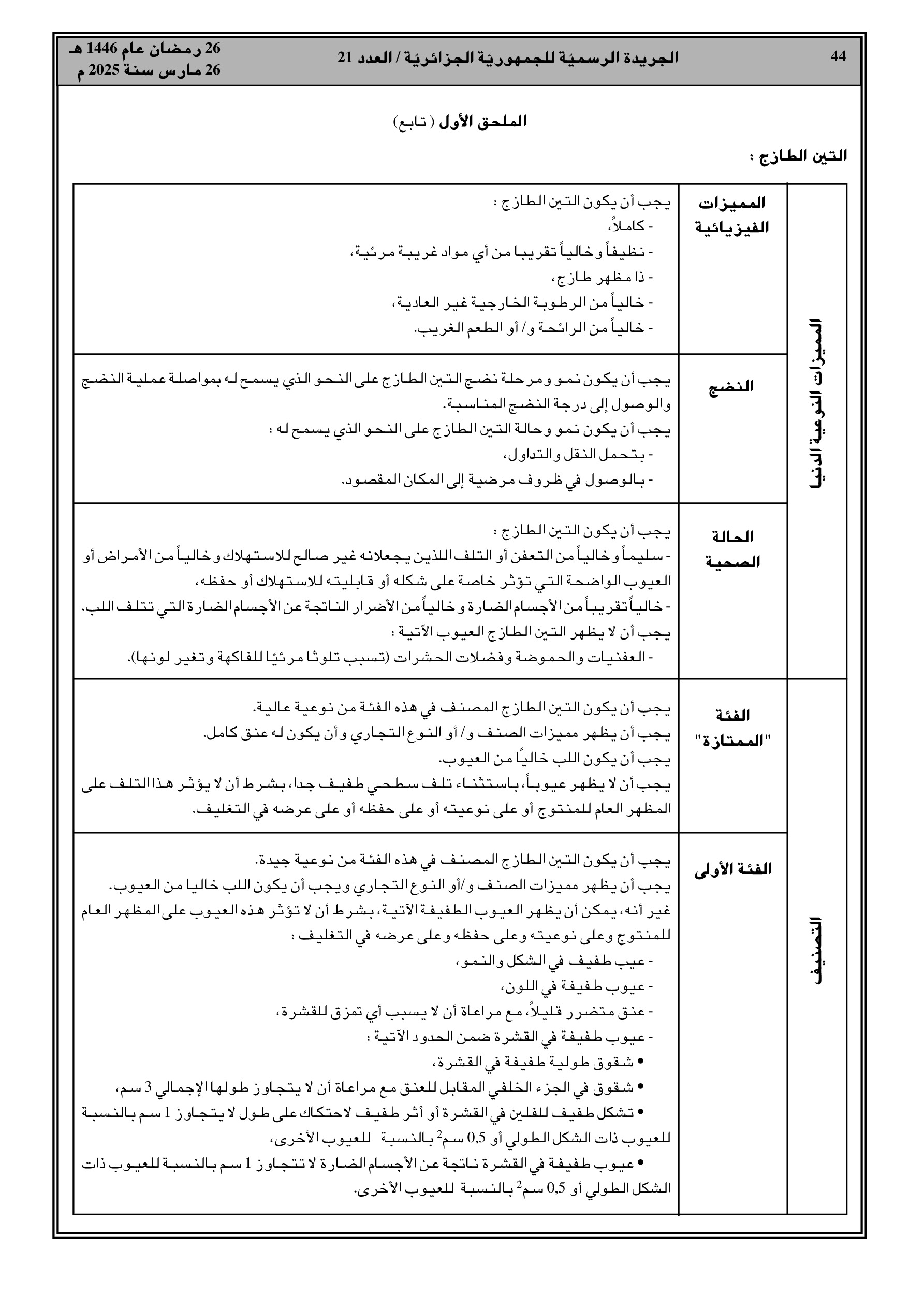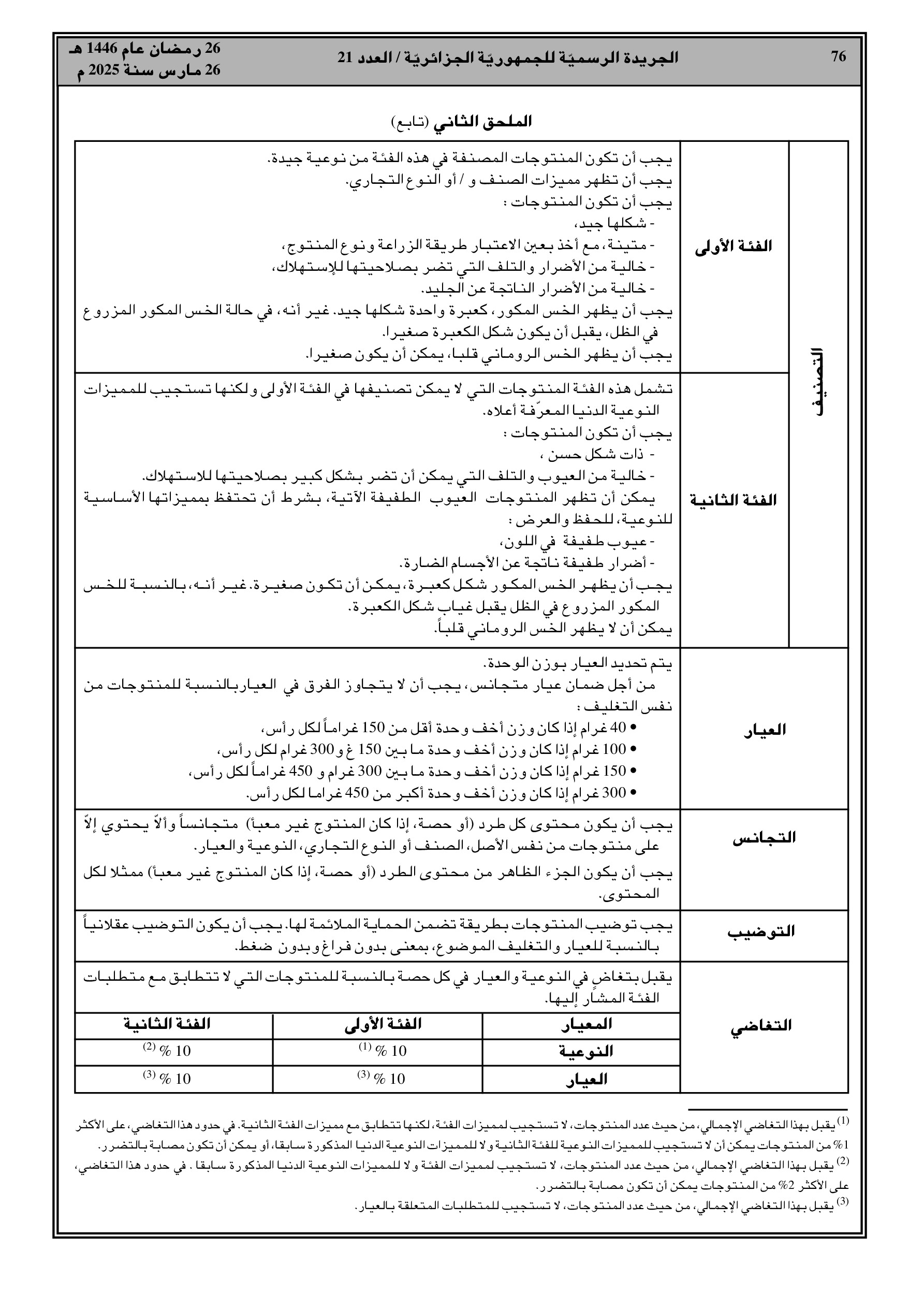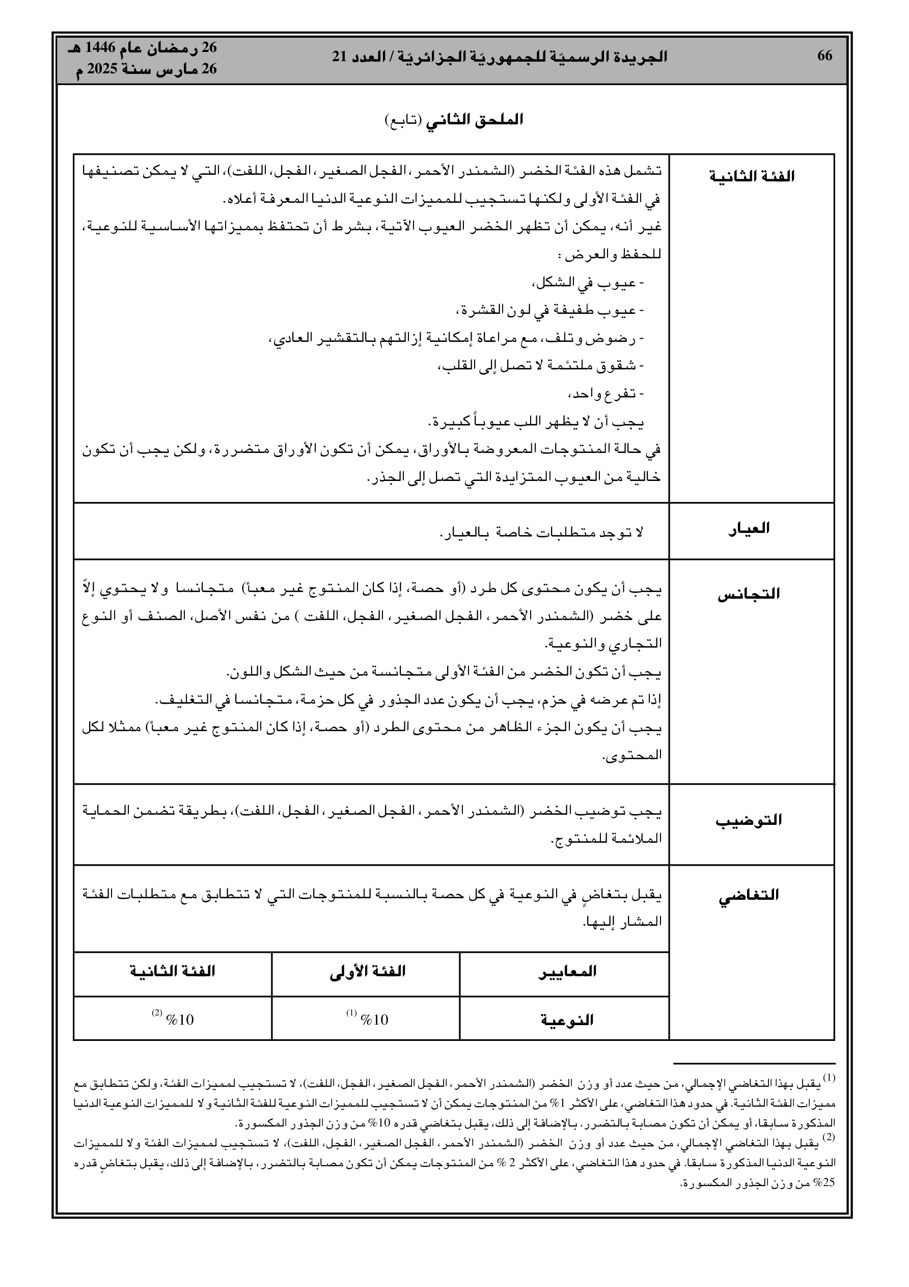 قرار وزاري مشترك يعتمد اللائحة الفنية التي تحدد المواصفات وشروط عرض الفواكه والخضر الطازجة الموجهة للاستهلاك البشري. يحدد المصطلحات الأساسية، متطلبات الجودة والنضج الدنيا، وشروط النقل، النظافة، والعرض. يحظر القرار المعالجات غير المصرح بها والتلوين الاصطناعي، ويحدد متطلبات التعبئة والتغليف والوسم. يلغي القرار المؤرخ في 8 يناير 1994، ويمنح مهلة امتثال لمدة عام واحد. الملحق الأول يפרّق الخصائص التفصيلية لعدة فواكه (مثل المشمش، الحمضيات، الخوخ، التفاح، العنب، الطماطم). الملحق الثاني يפרّق خصائص مختلف الخضروات (مثل الخرشوف، الجزر، القرنبيط، الباذنجان، الكوسة، البطاطس).