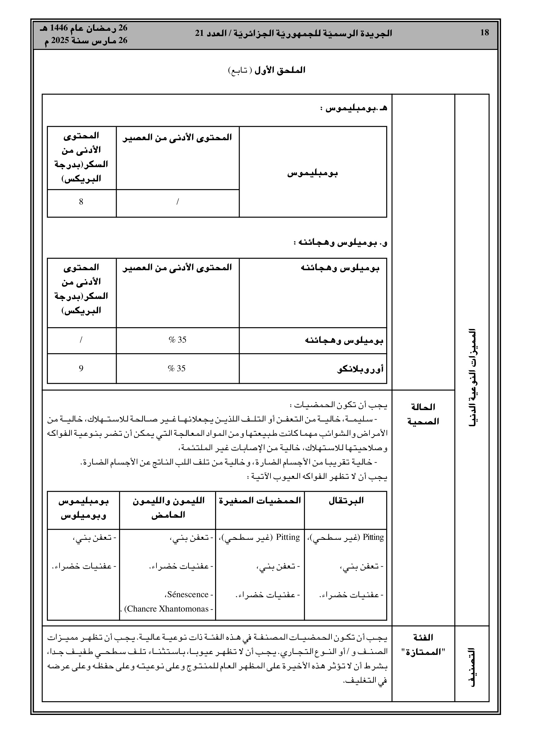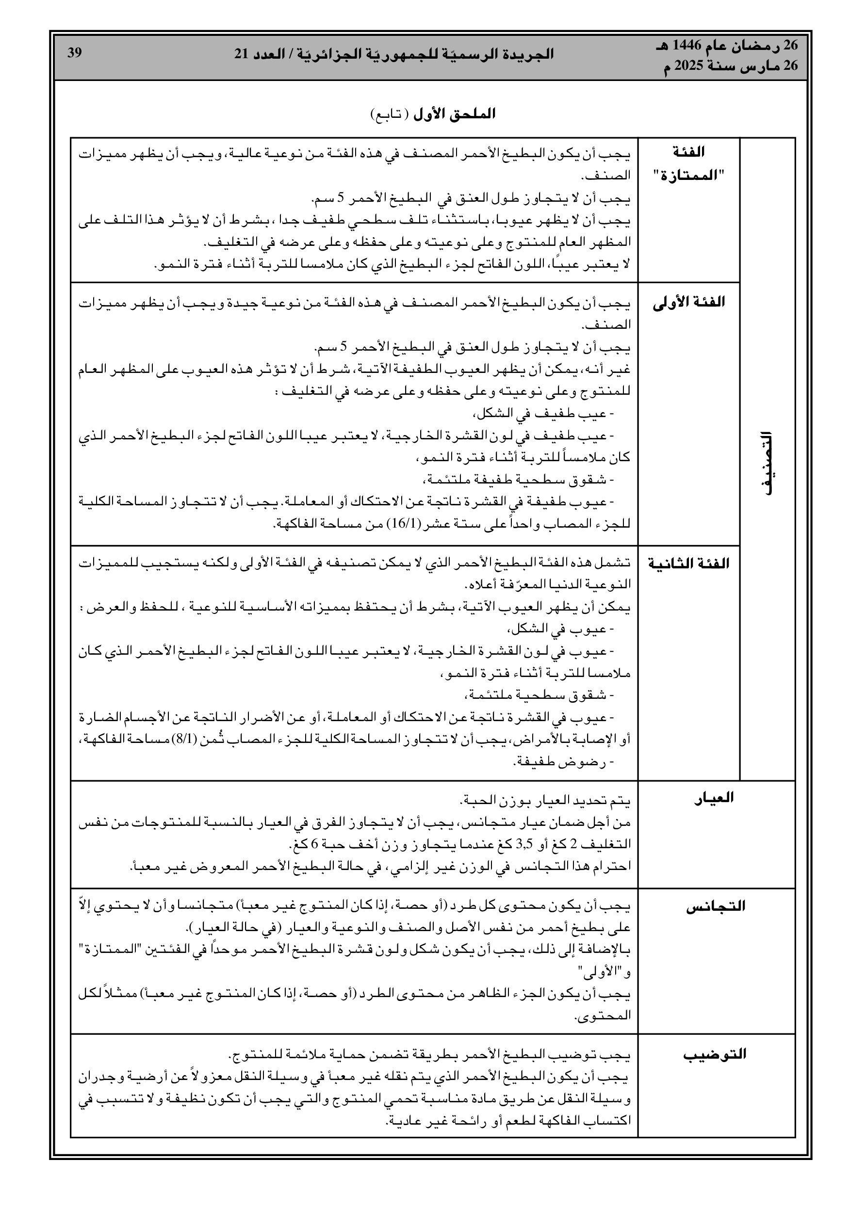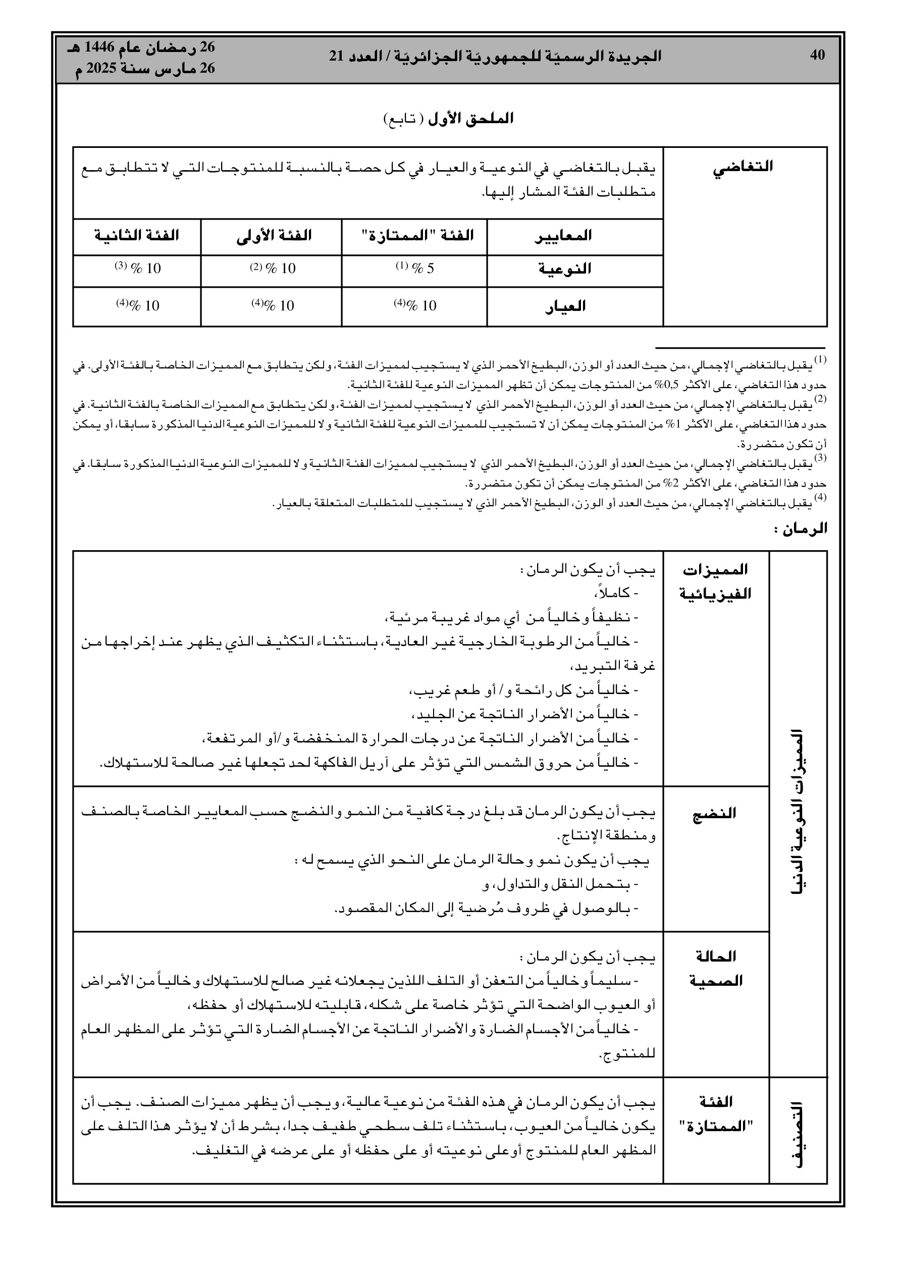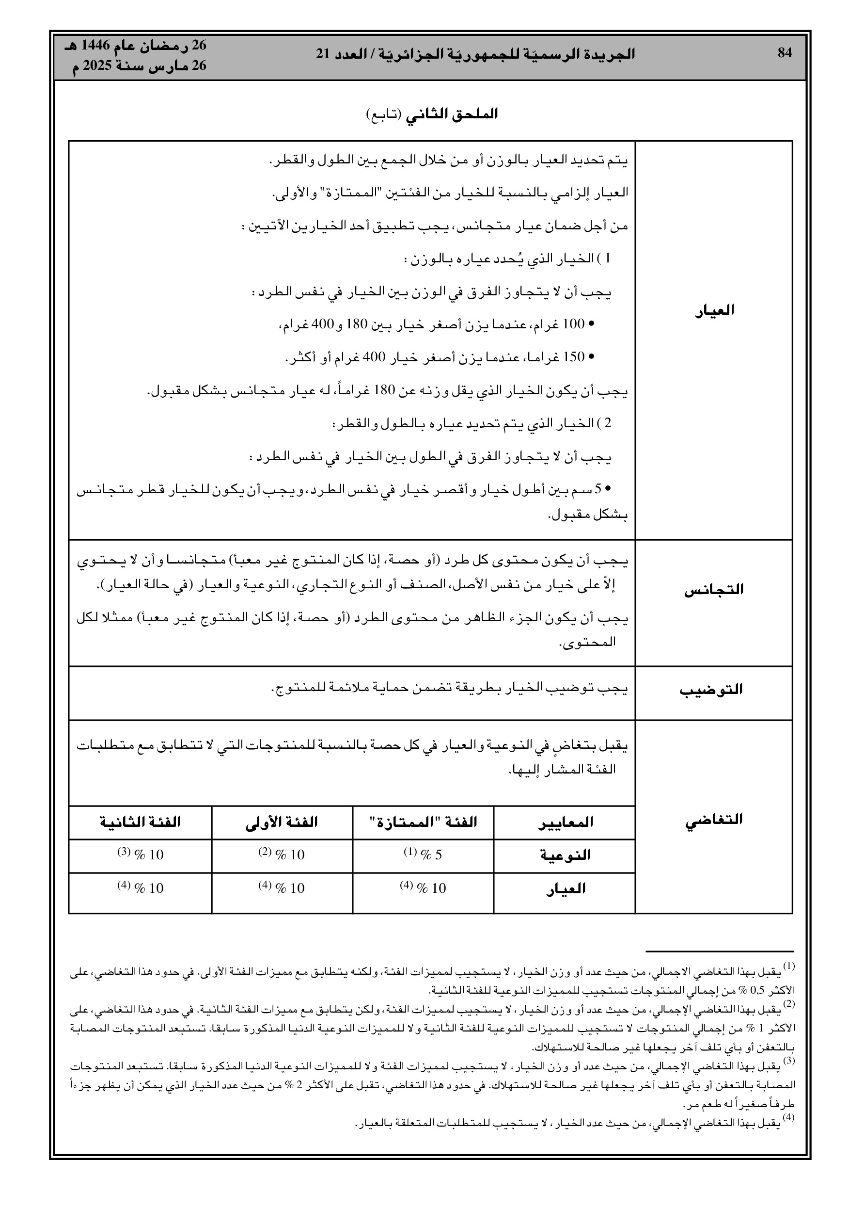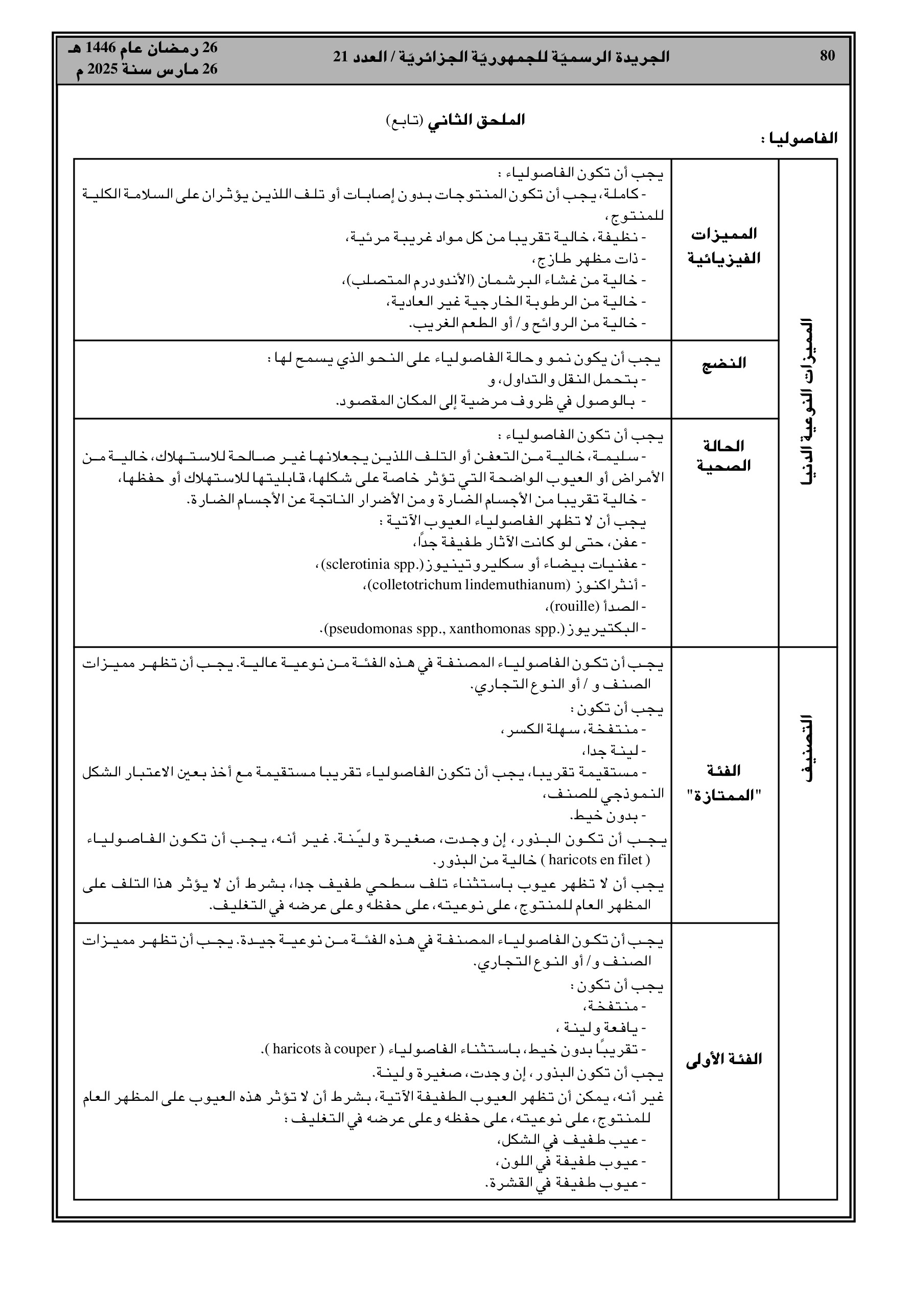 قرار وزاري مشترك يعتمد اللائحة الفنية التي تحدد المواصفات وشروط عرض الفواكه والخضر الطازجة الموجهة للاستهلاك البشري. يحدد المصطلحات الأساسية، متطلبات الجودة والنضج الدنيا، وشروط النقل، النظافة، والعرض. يحظر القرار المعالجات غير المصرح بها والتلوين الاصطناعي، ويحدد متطلبات التعبئة والتغليف والوسم. يلغي القرار المؤرخ في 8 يناير 1994، ويمنح مهلة امتثال لمدة عام واحد. الملحق الأول يפרّق الخصائص التفصيلية لعدة فواكه (مثل المشمش، الحمضيات، الخوخ، التفاح، العنب، الطماطم). الملحق الثاني يפרّق خصائص مختلف الخضروات (مثل الخرشوف، الجزر، القرنبيط، الباذنجان، الكوسة، البطاطس).