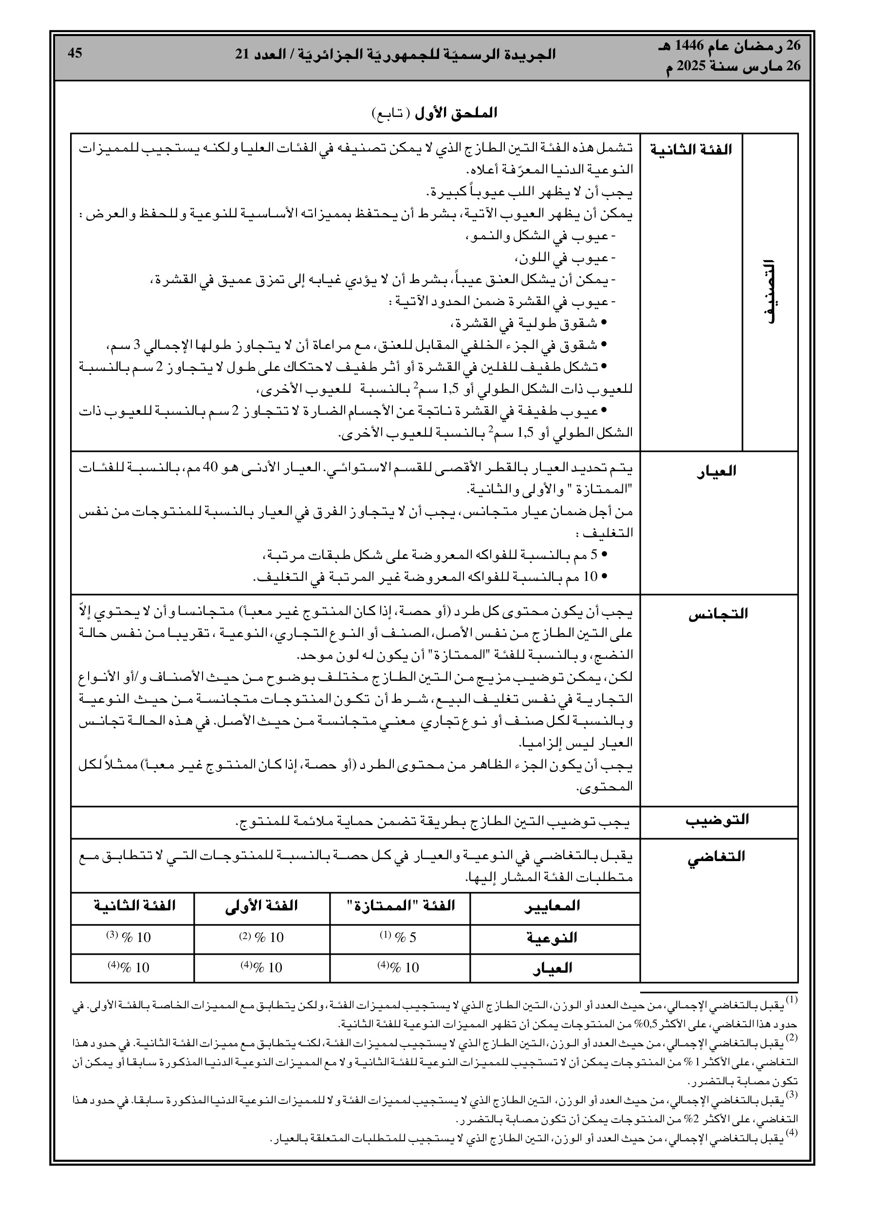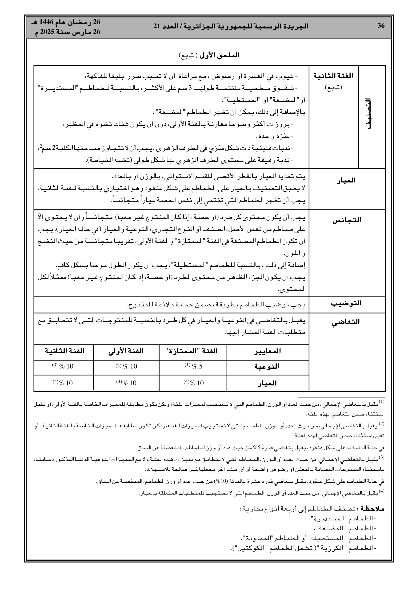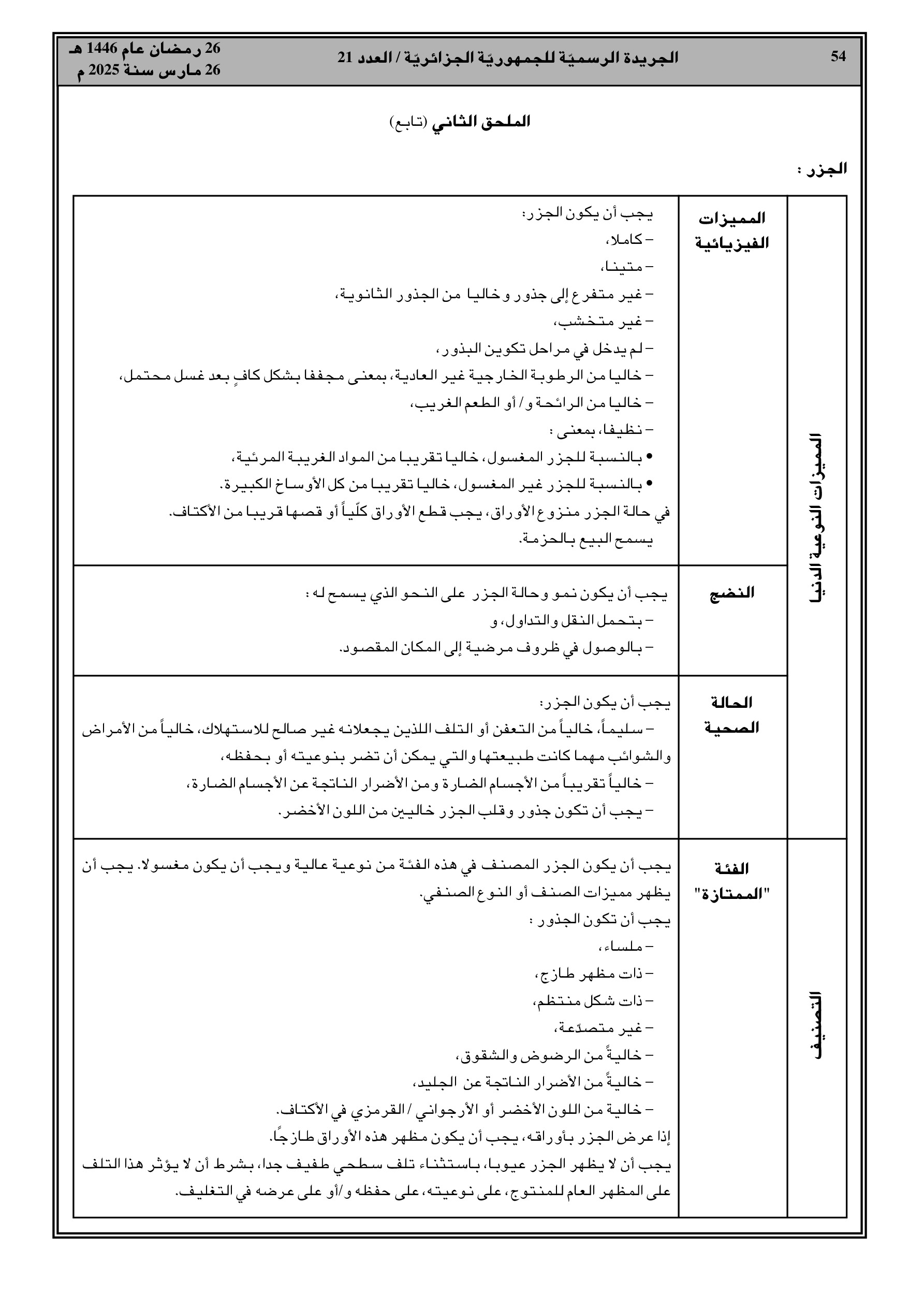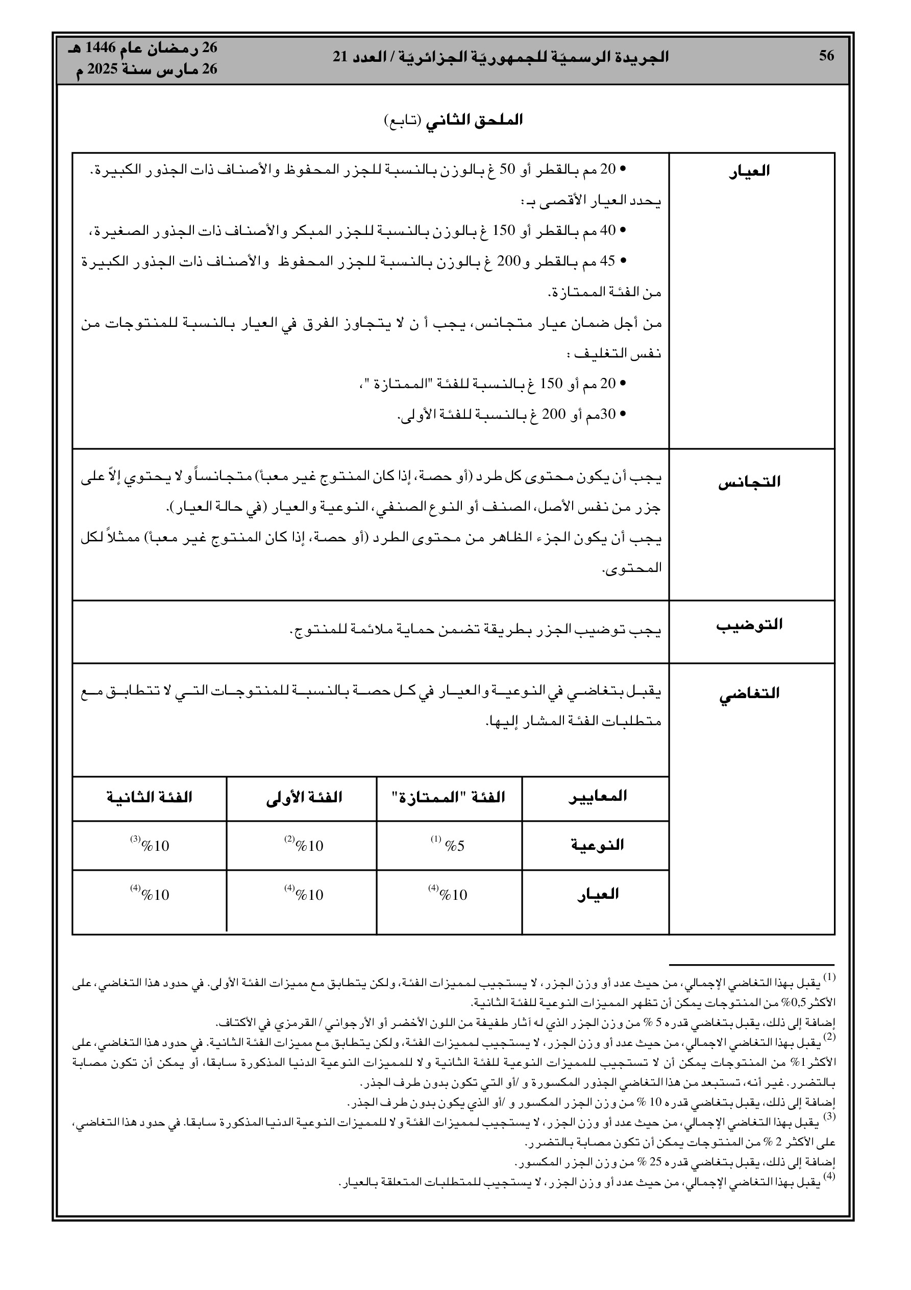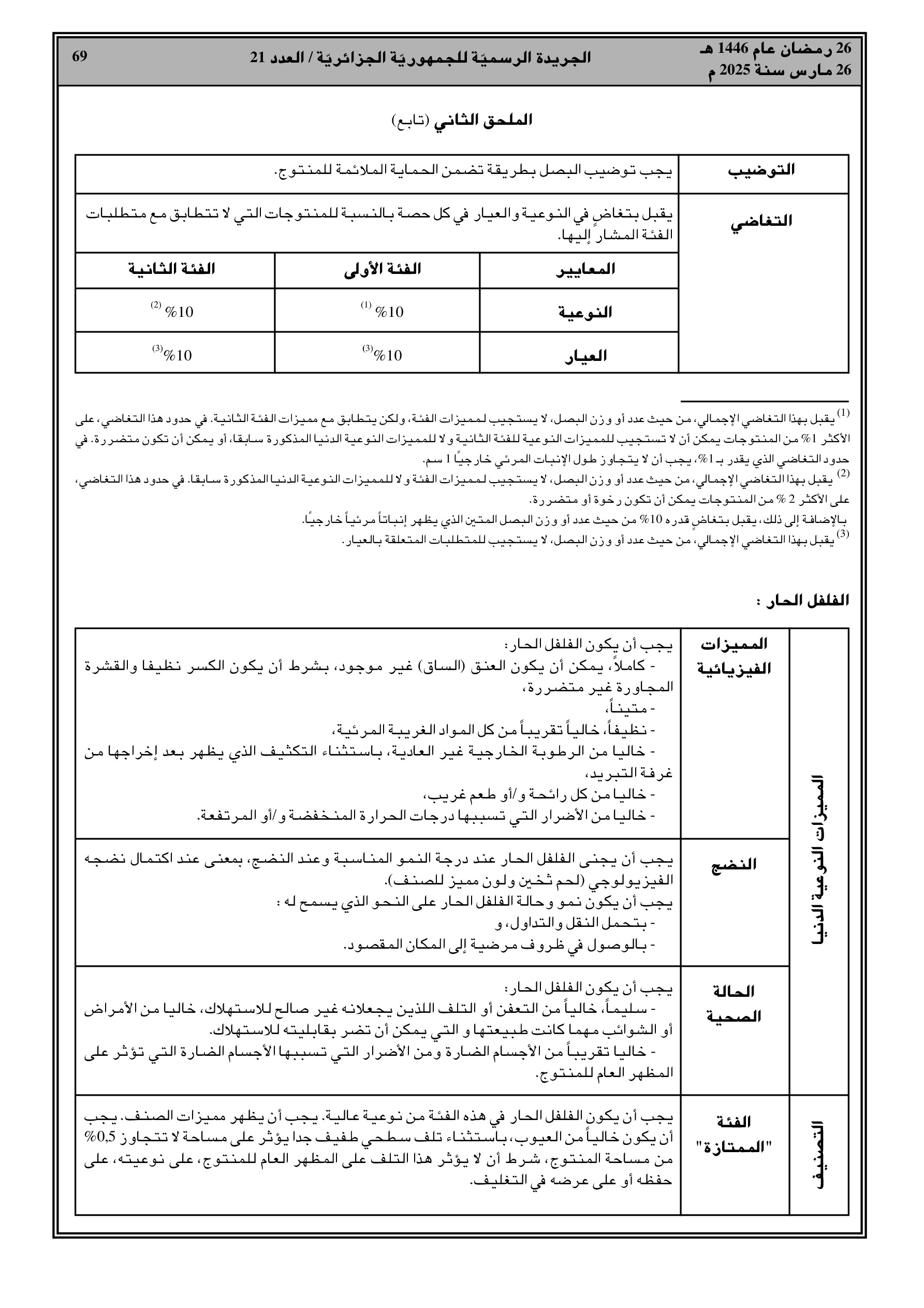قرار وزاري مشترك يعتمد اللائحة الفنية التي تحدد المواصفات وشروط عرض الفواكه والخضر الطازجة الموجهة للاستهلاك البشري. يحدد المصطلحات الأساسية، متطلبات الجودة والنضج الدنيا، وشروط النقل، النظافة، والعرض. يحظر القرار المعالجات غير المصرح بها والتلوين الاصطناعي، ويحدد متطلبات التعبئة والتغليف والوسم. يلغي القرار المؤرخ في 8 يناير 1994، ويمنح مهلة امتثال لمدة عام واحد. الملحق الأول يפרّق الخصائص التفصيلية لعدة فواكه (مثل المشمش، الحمضيات، الخوخ، التفاح، العنب، الطماطم). الملحق الثاني يפרّق خصائص مختلف الخضروات (مثل الخرشوف، الجزر، القرنبيط، الباذنجان، الكوسة، البطاطس).