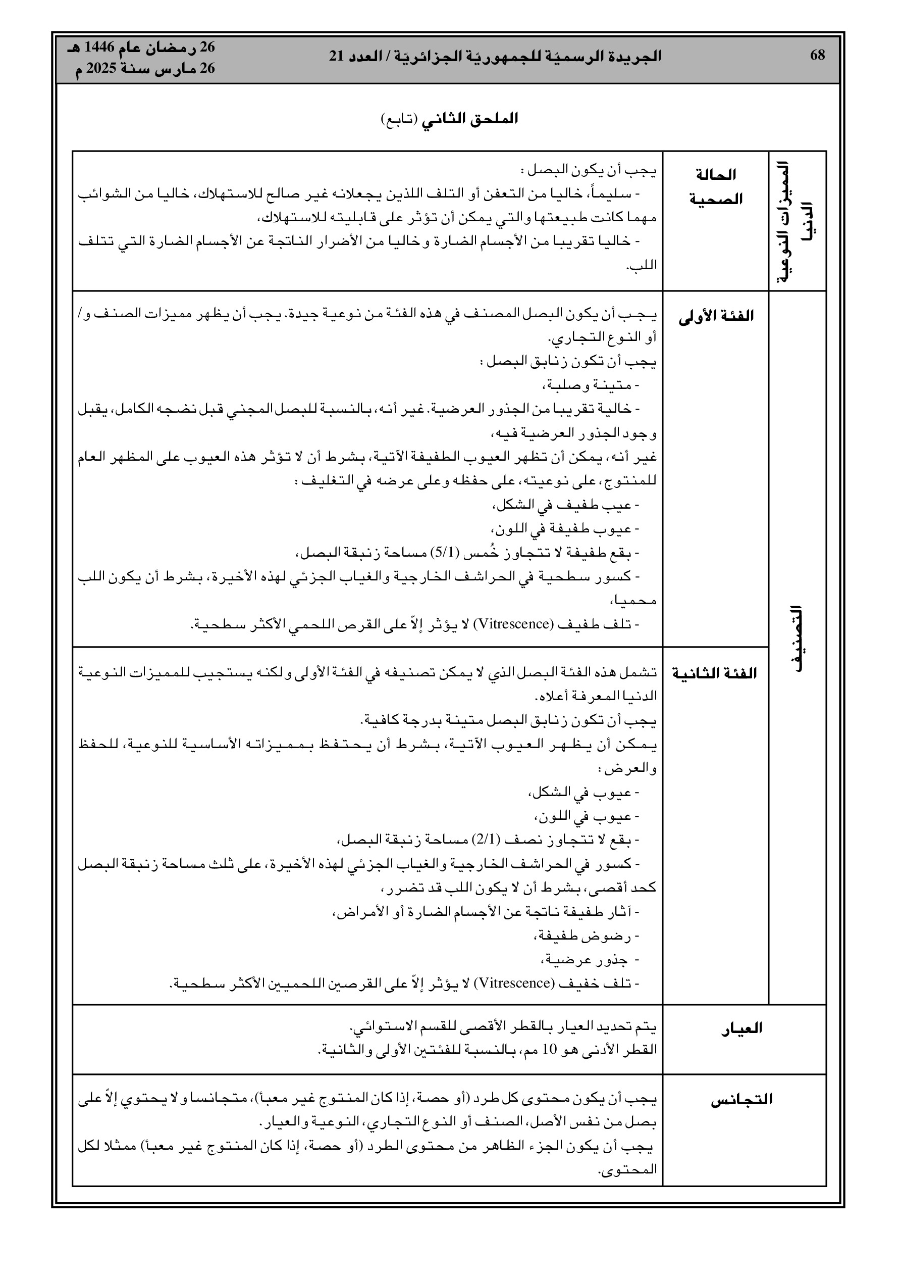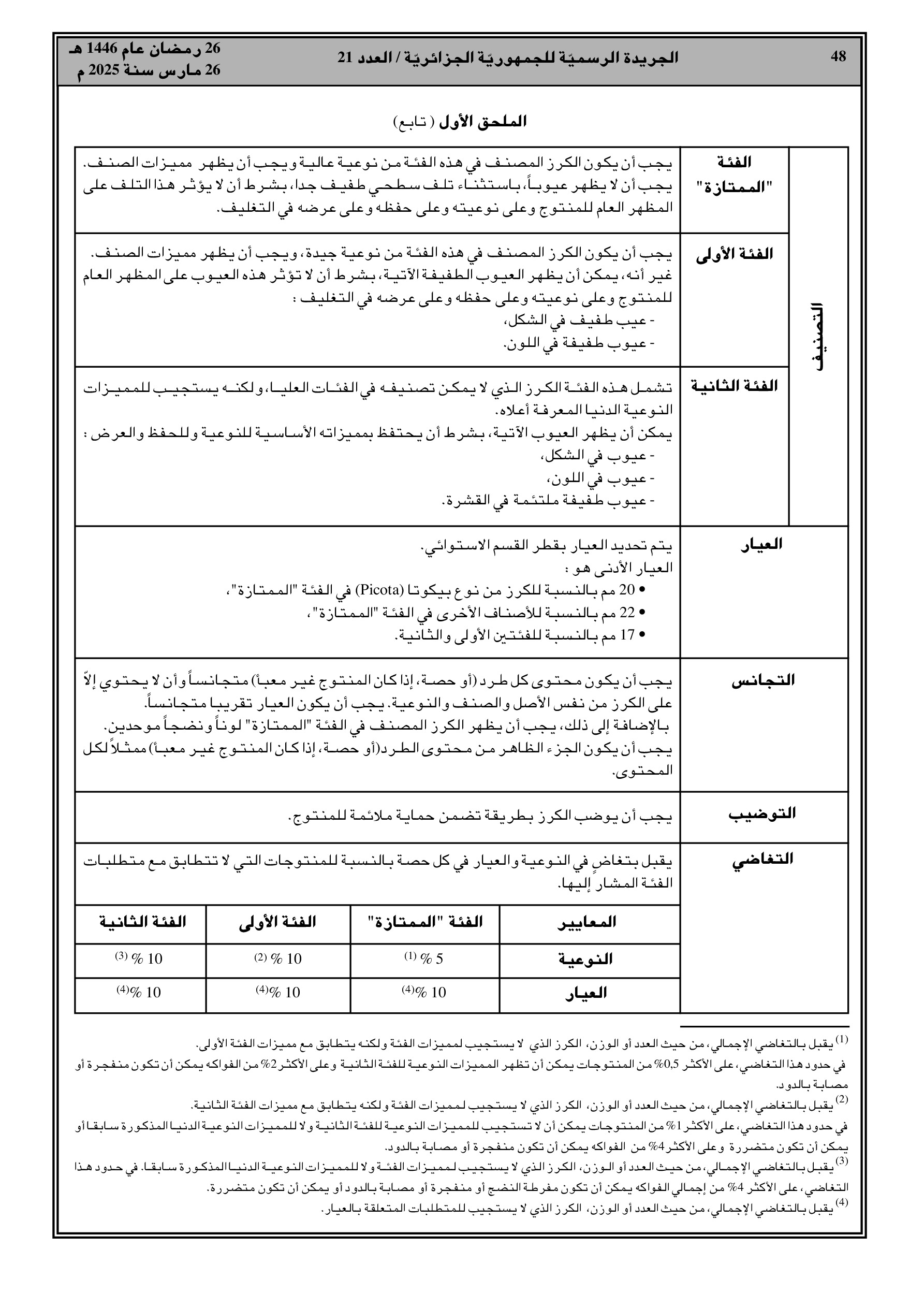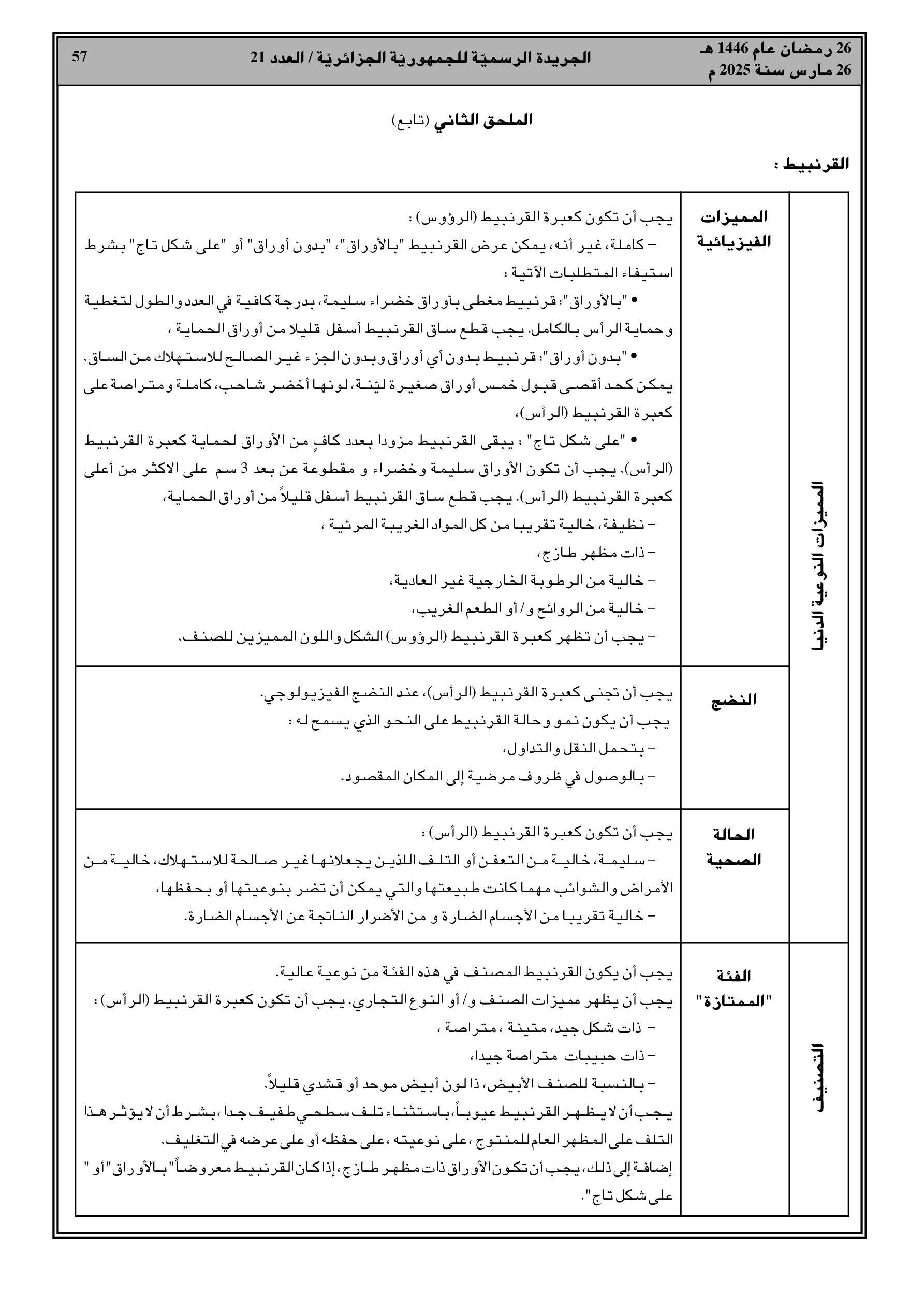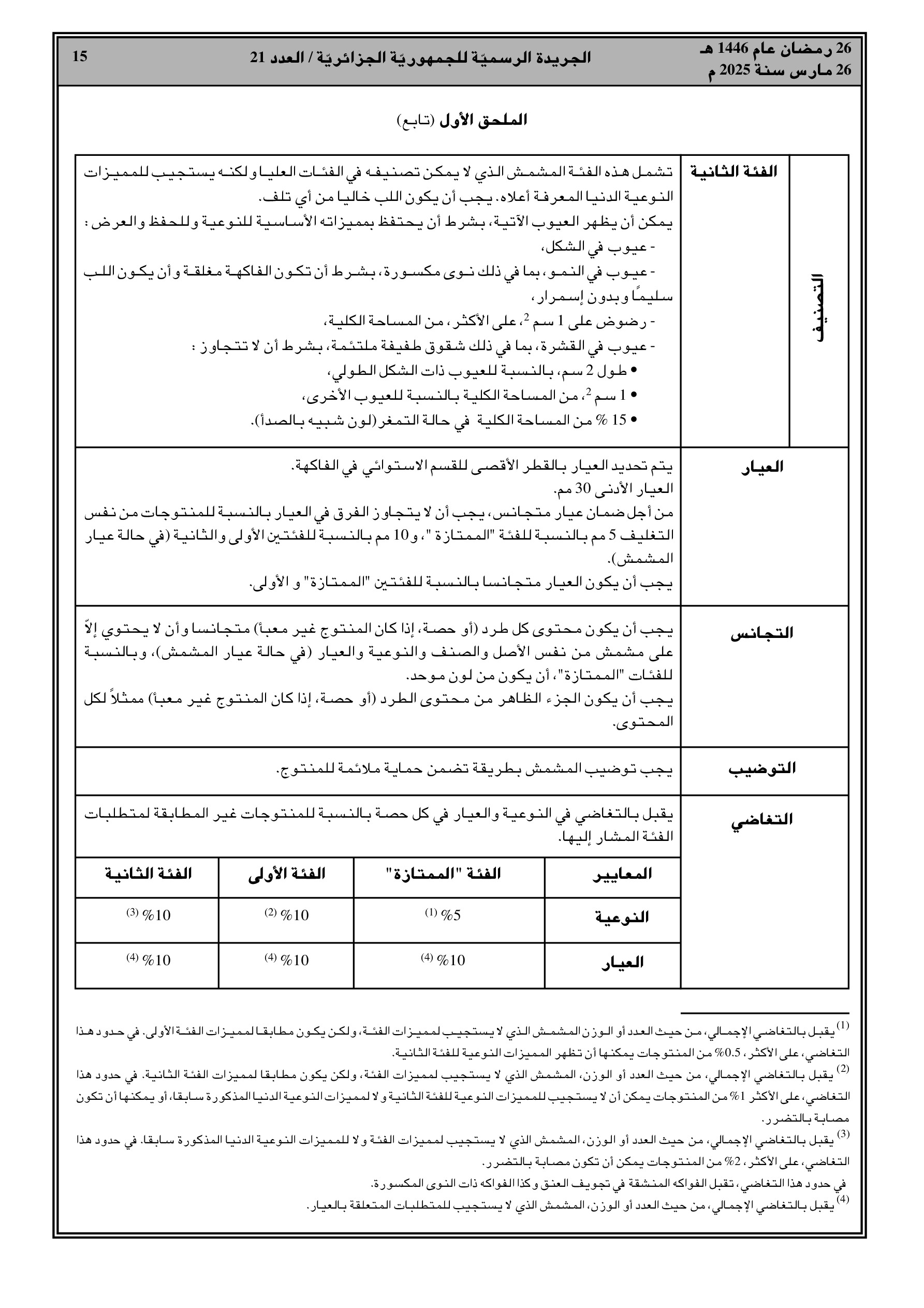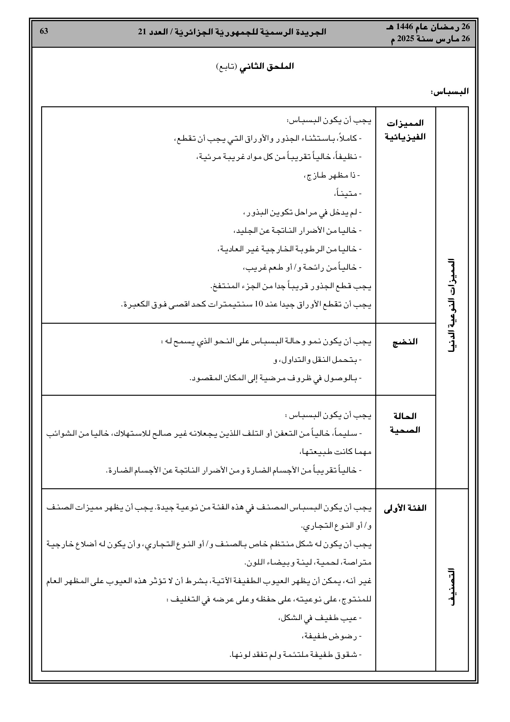 قرار وزاري مشترك يعتمد اللائحة الفنية التي تحدد المواصفات وشروط عرض الفواكه والخضر الطازجة الموجهة للاستهلاك البشري. يحدد المصطلحات الأساسية، متطلبات الجودة والنضج الدنيا، وشروط النقل، النظافة، والعرض. يحظر القرار المعالجات غير المصرح بها والتلوين الاصطناعي، ويحدد متطلبات التعبئة والتغليف والوسم. يلغي القرار المؤرخ في 8 يناير 1994، ويمنح مهلة امتثال لمدة عام واحد. الملحق الأول يפרّق الخصائص التفصيلية لعدة فواكه (مثل المشمش، الحمضيات، الخوخ، التفاح، العنب، الطماطم). الملحق الثاني يפרّق خصائص مختلف الخضروات (مثل الخرشوف، الجزر، القرنبيط، الباذنجان، الكوسة، البطاطس).