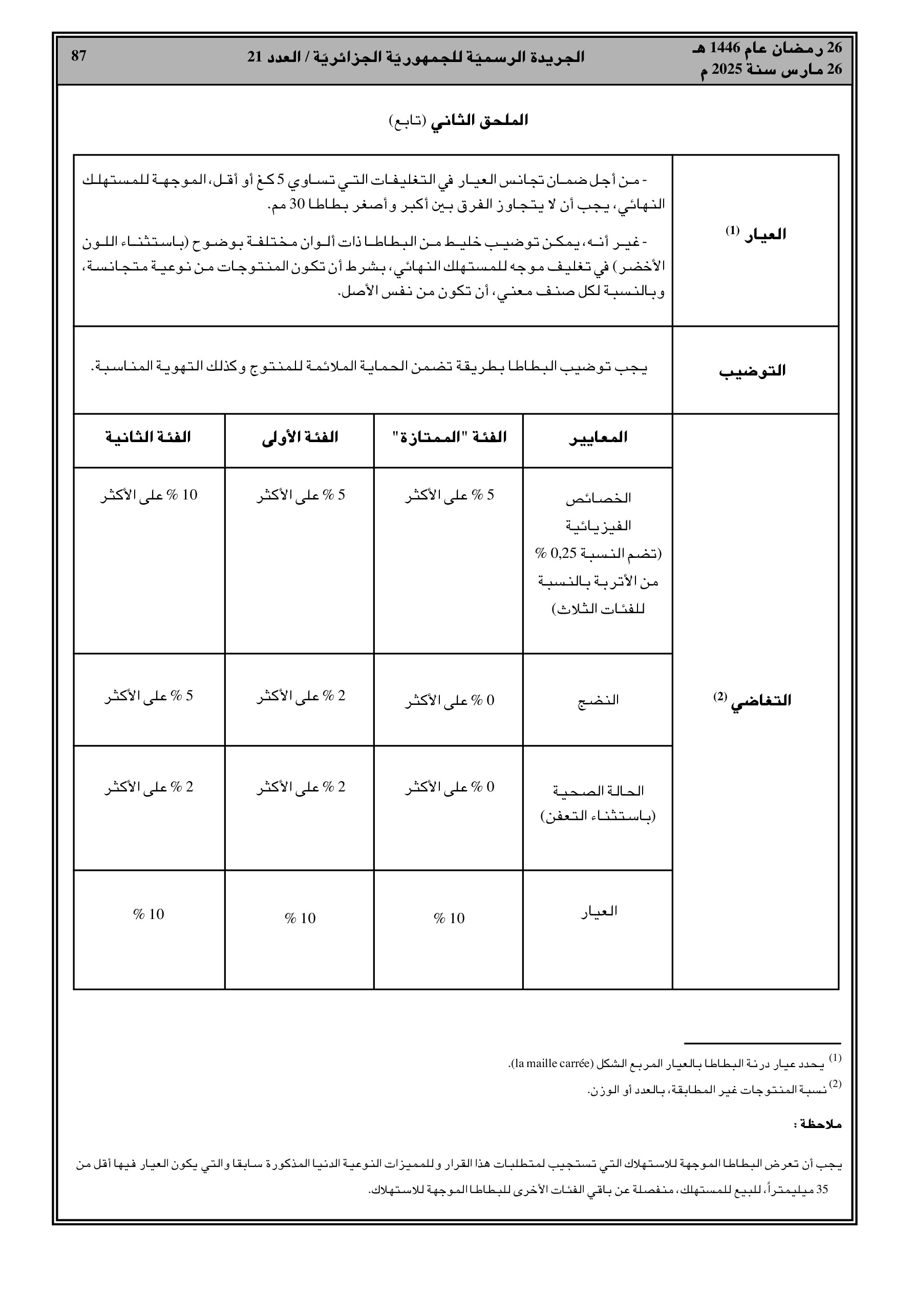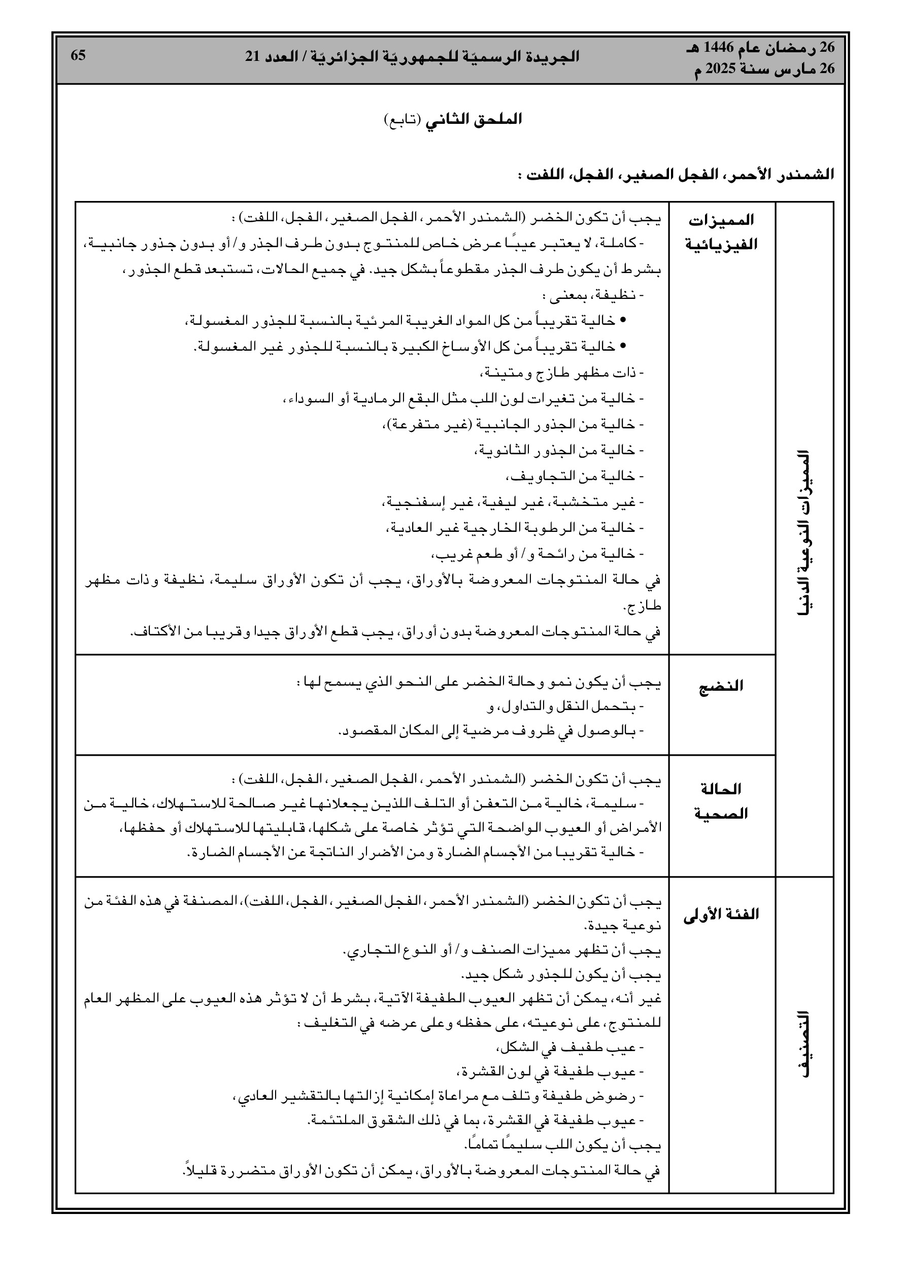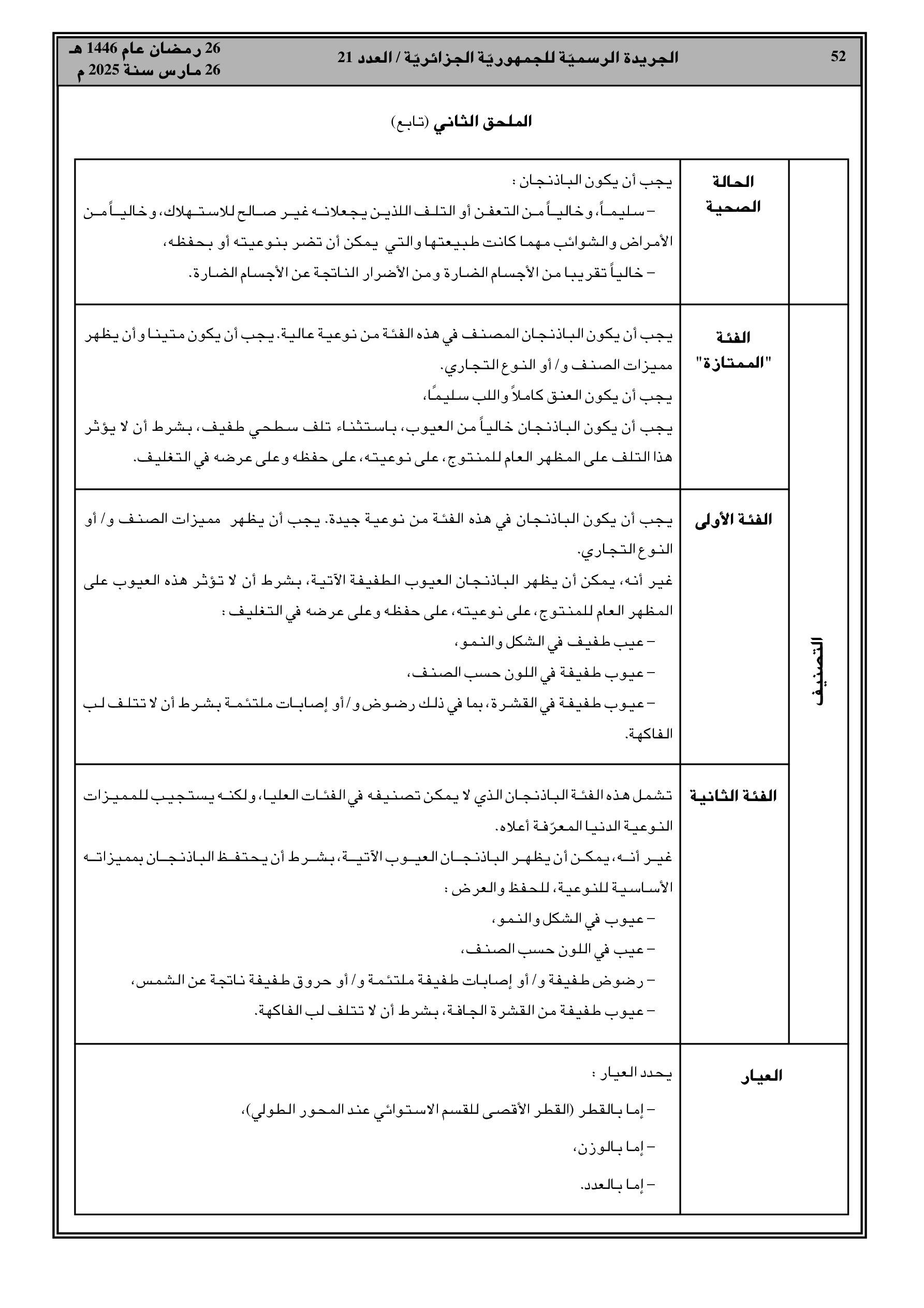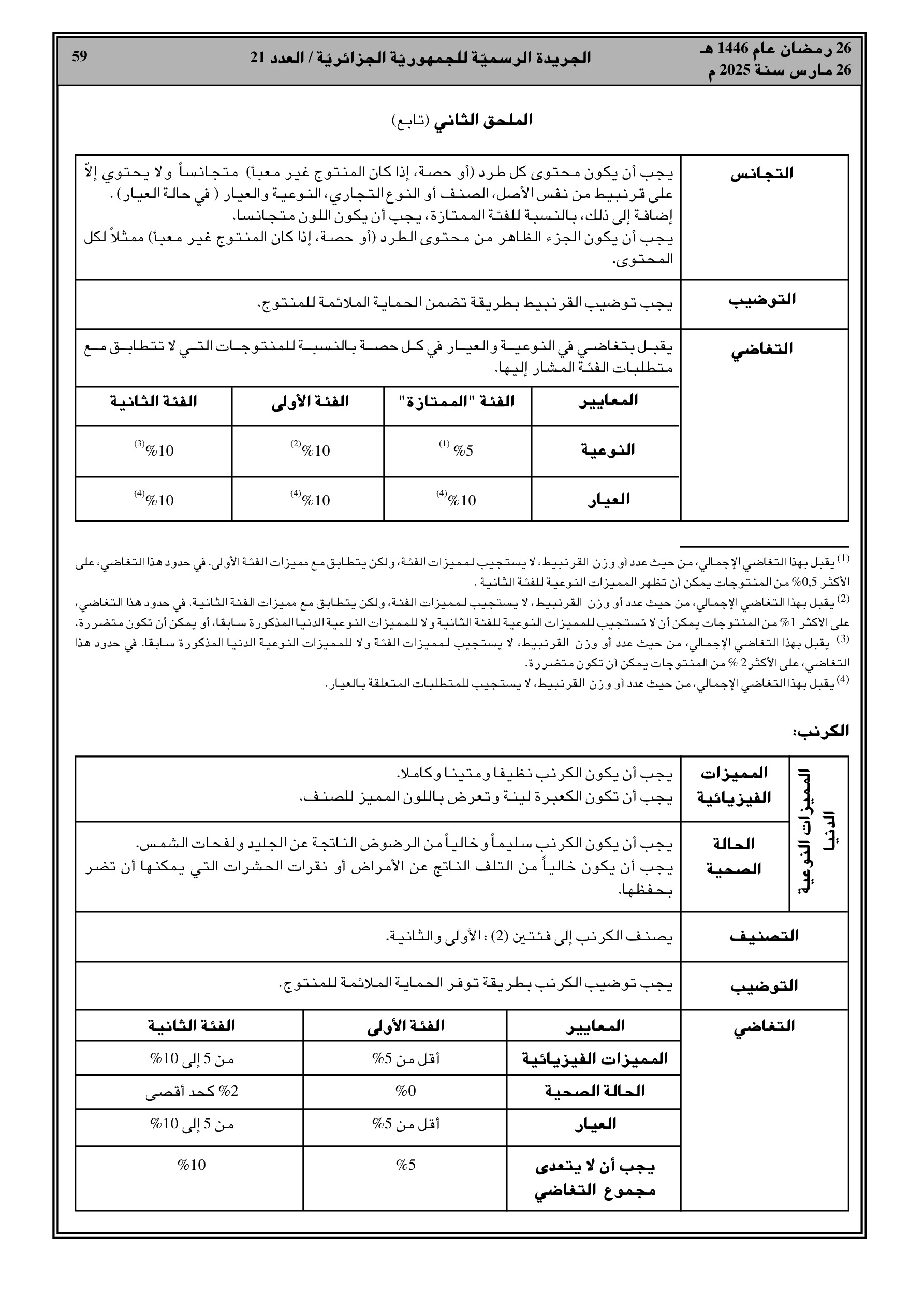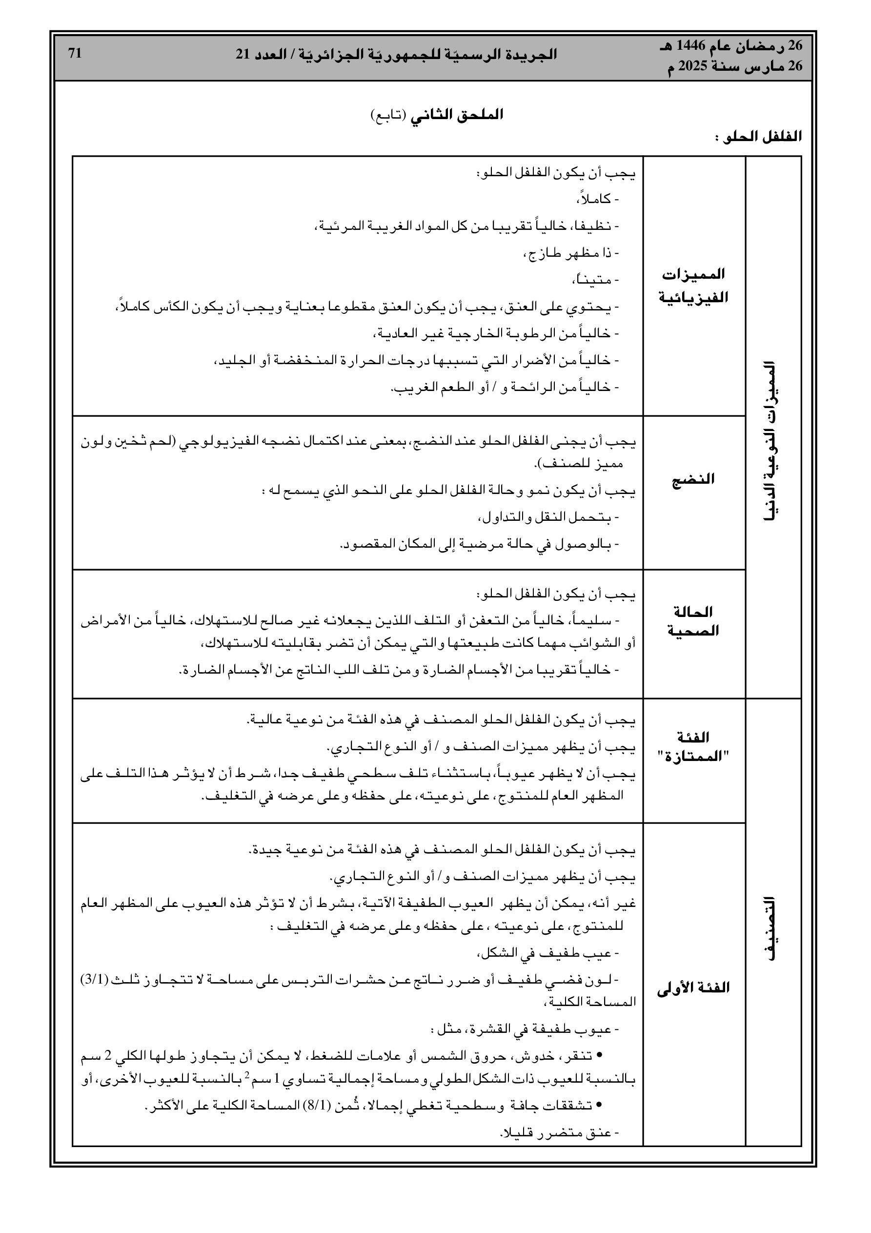 قرار وزاري مشترك يعتمد اللائحة الفنية التي تحدد المواصفات وشروط عرض الفواكه والخضر الطازجة الموجهة للاستهلاك البشري. يحدد المصطلحات الأساسية، متطلبات الجودة والنضج الدنيا، وشروط النقل، النظافة، والعرض. يحظر القرار المعالجات غير المصرح بها والتلوين الاصطناعي، ويحدد متطلبات التعبئة والتغليف والوسم. يلغي القرار المؤرخ في 8 يناير 1994، ويمنح مهلة امتثال لمدة عام واحد. الملحق الأول يפרّق الخصائص التفصيلية لعدة فواكه (مثل المشمش، الحمضيات، الخوخ، التفاح، العنب، الطماطم). الملحق الثاني يפרّق خصائص مختلف الخضروات (مثل الخرشوف، الجزر، القرنبيط، الباذنجان، الكوسة، البطاطس).
