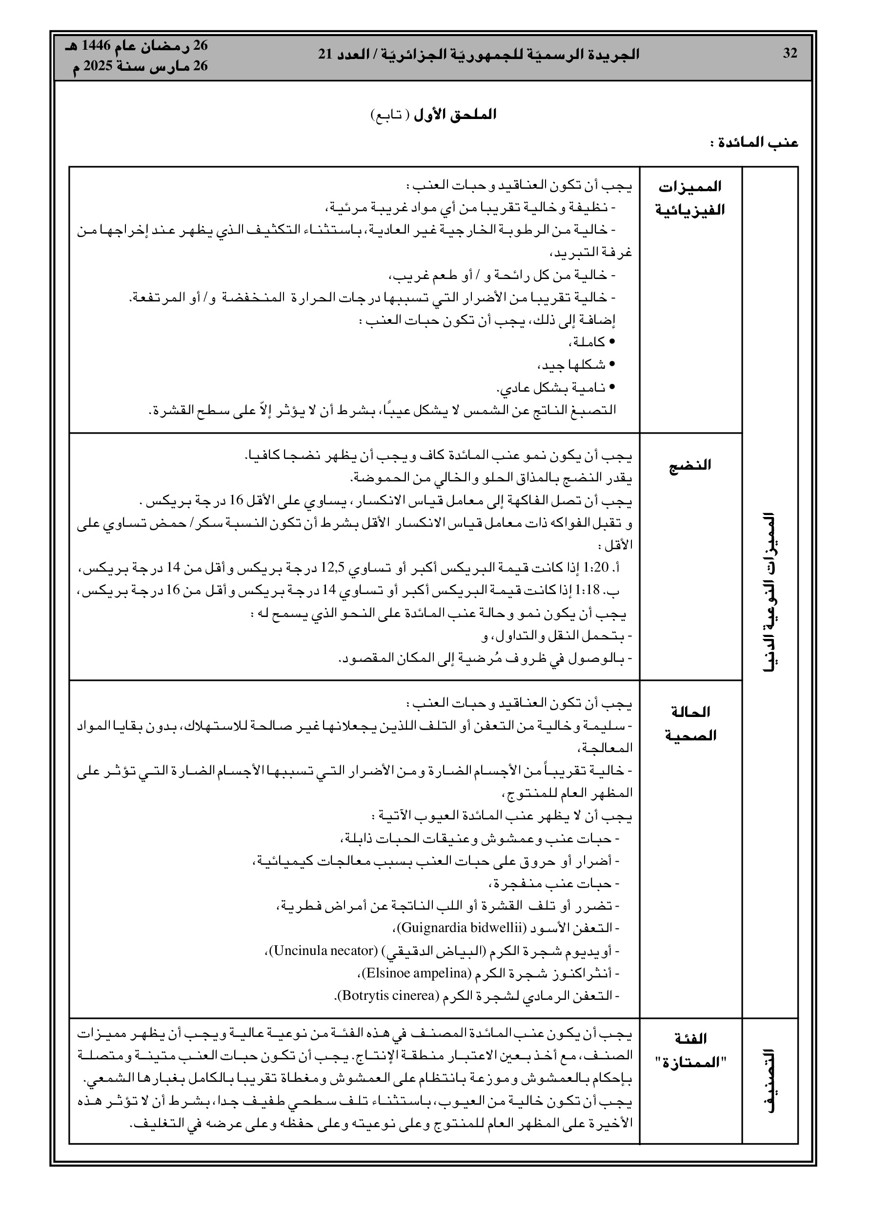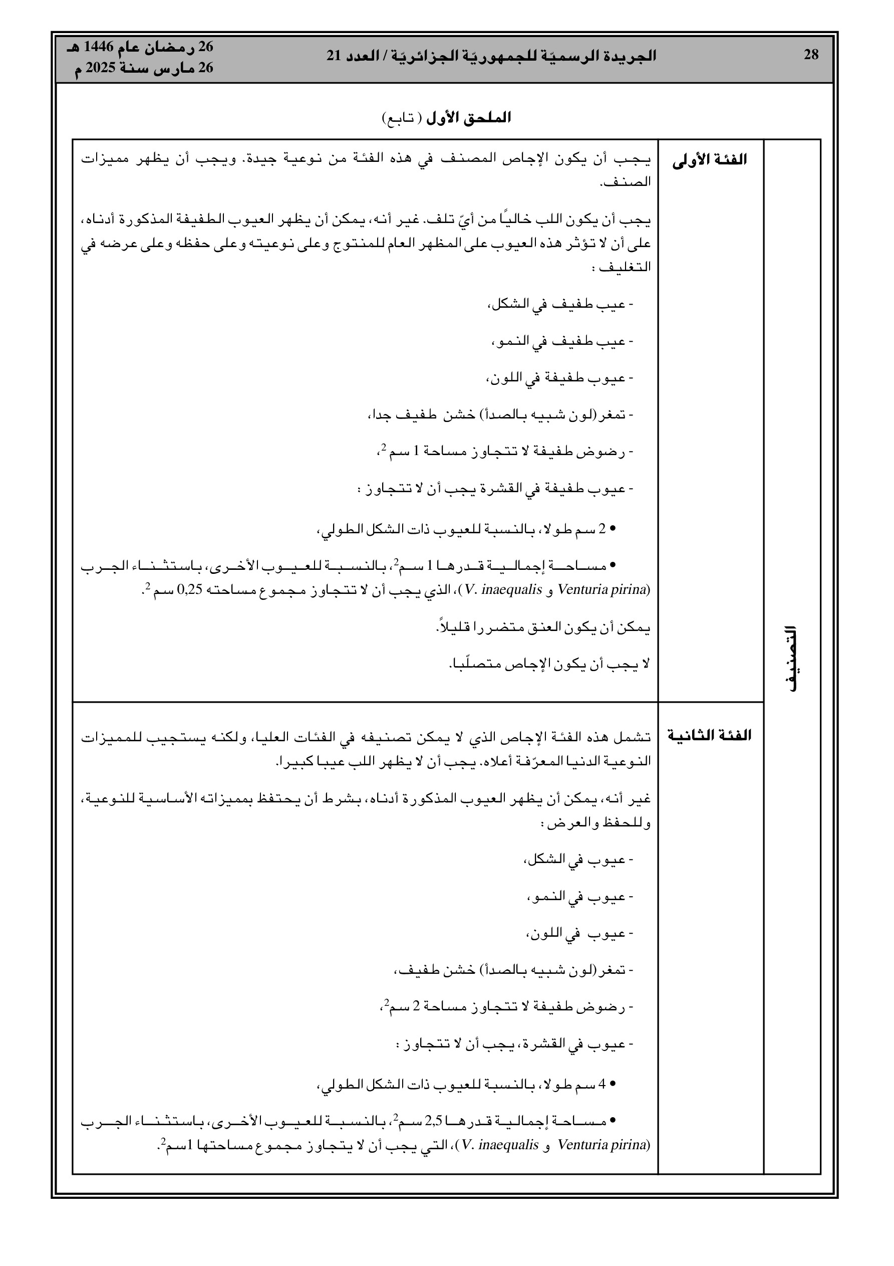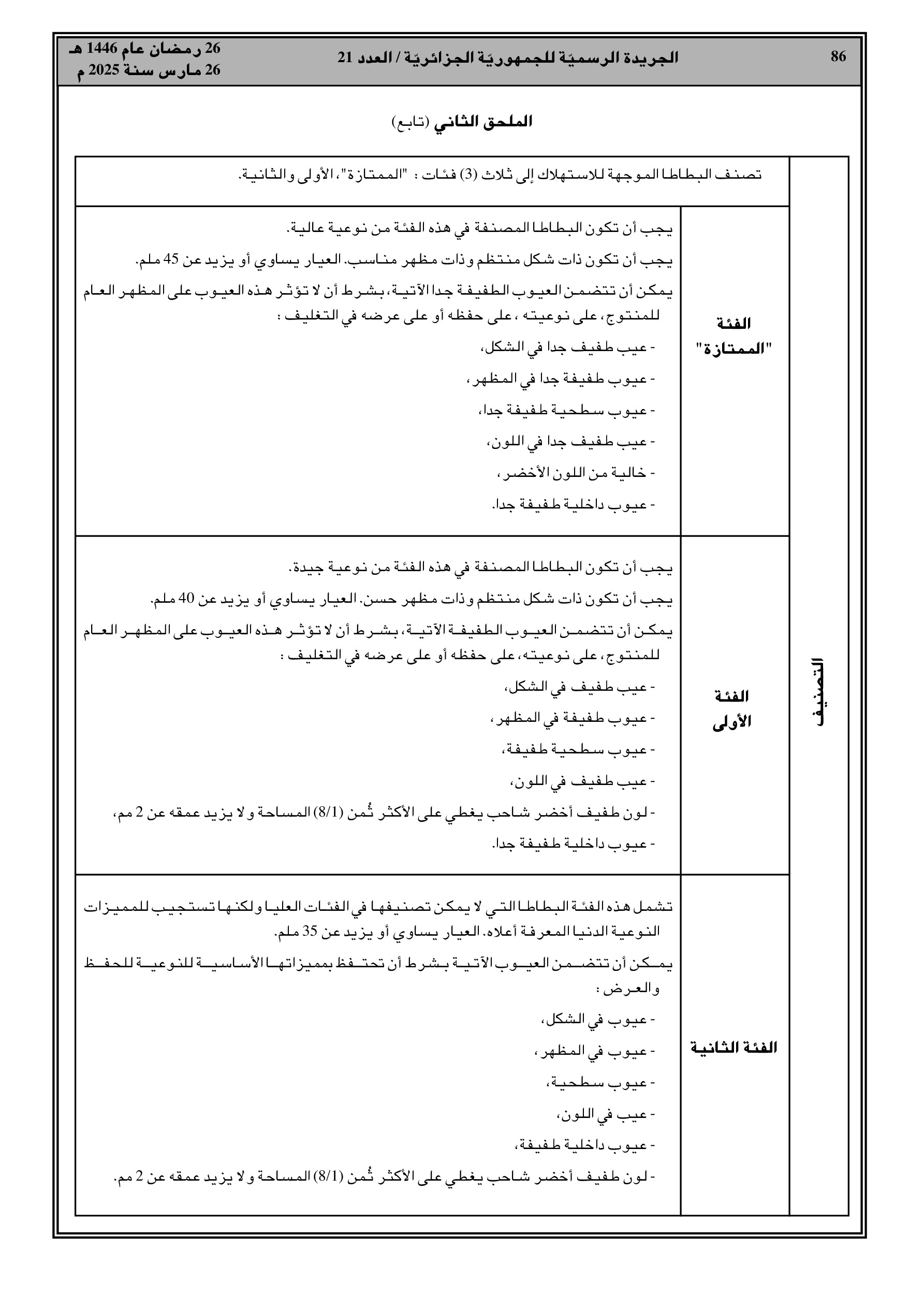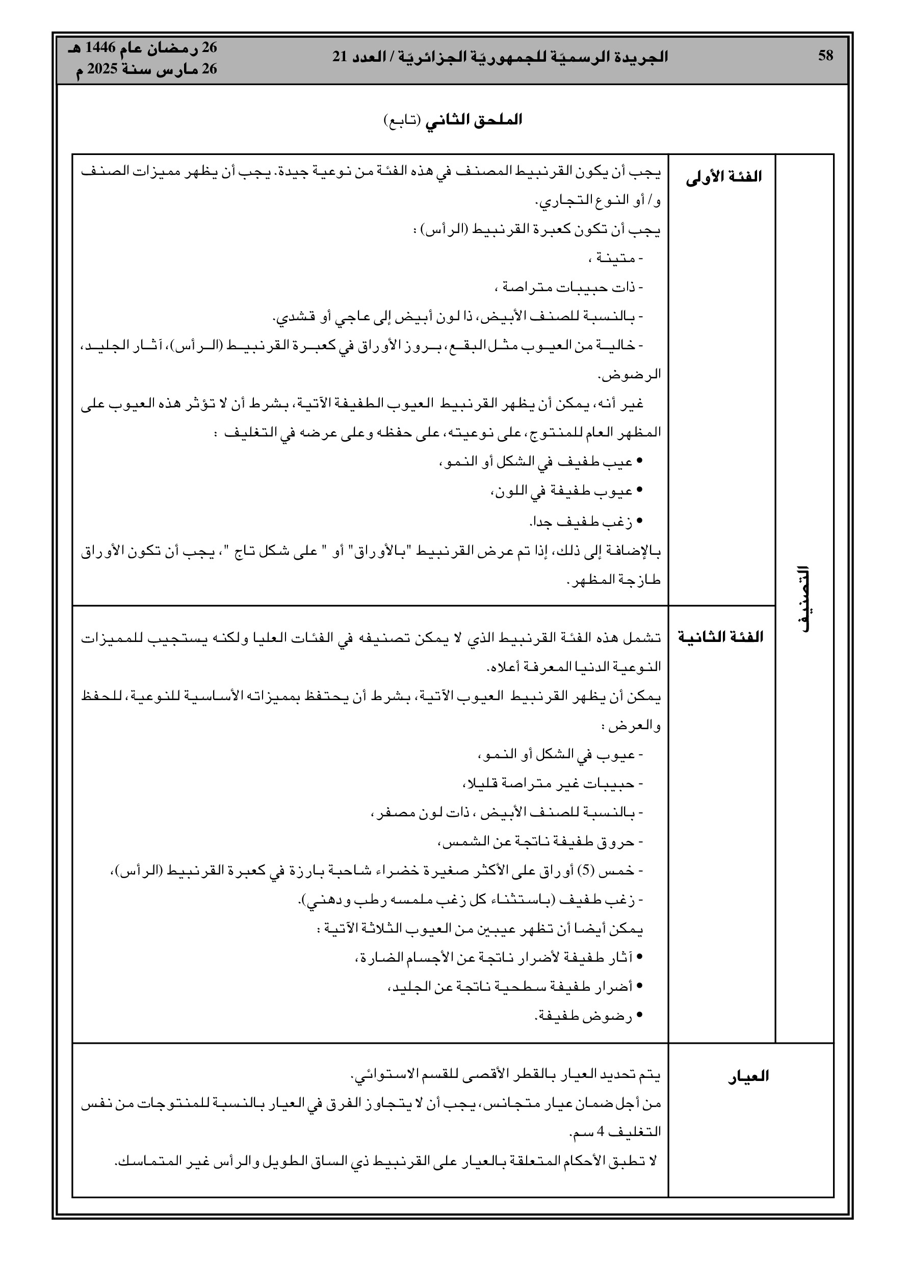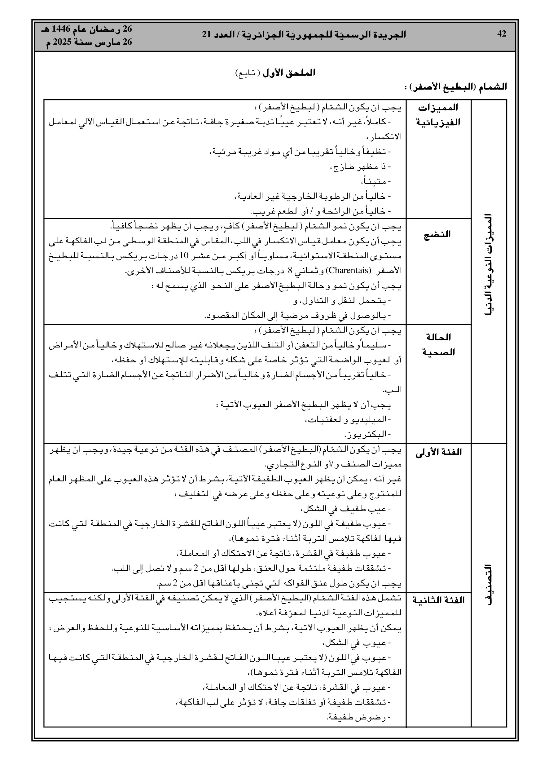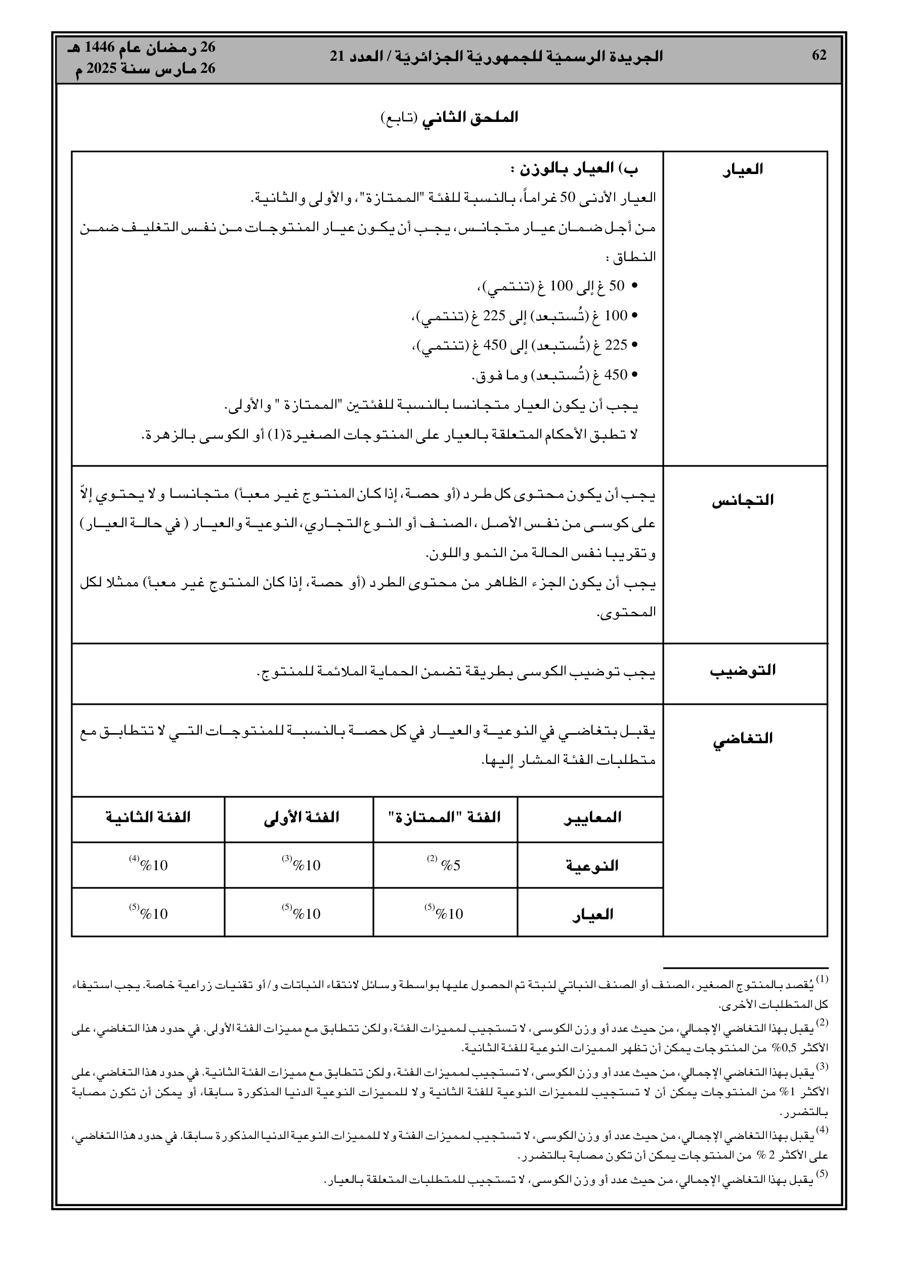 قرار وزاري مشترك يعتمد اللائحة الفنية التي تحدد المواصفات وشروط عرض الفواكه والخضر الطازجة الموجهة للاستهلاك البشري. يحدد المصطلحات الأساسية، متطلبات الجودة والنضج الدنيا، وشروط النقل، النظافة، والعرض. يحظر القرار المعالجات غير المصرح بها والتلوين الاصطناعي، ويحدد متطلبات التعبئة والتغليف والوسم. يلغي القرار المؤرخ في 8 يناير 1994، ويمنح مهلة امتثال لمدة عام واحد. الملحق الأول يפרّق الخصائص التفصيلية لعدة فواكه (مثل المشمش، الحمضيات، الخوخ، التفاح، العنب، الطماطم). الملحق الثاني يפרّق خصائص مختلف الخضروات (مثل الخرشوف، الجزر، القرنبيط، الباذنجان، الكوسة، البطاطس).
