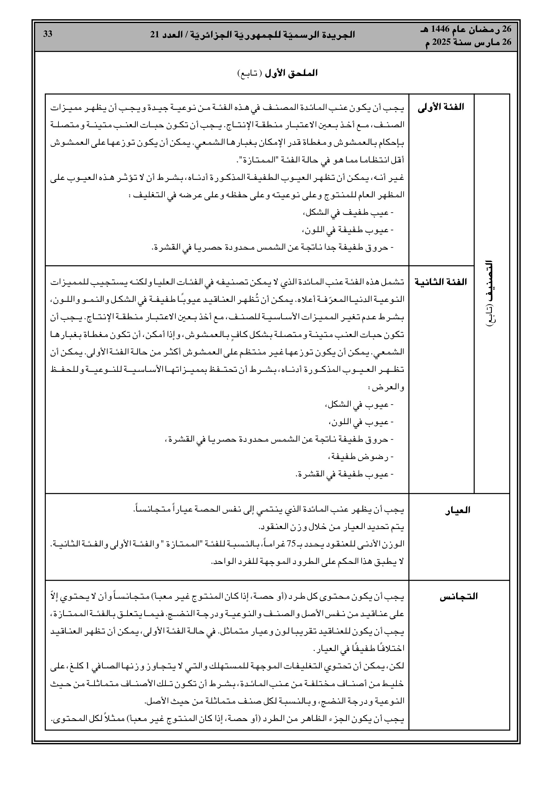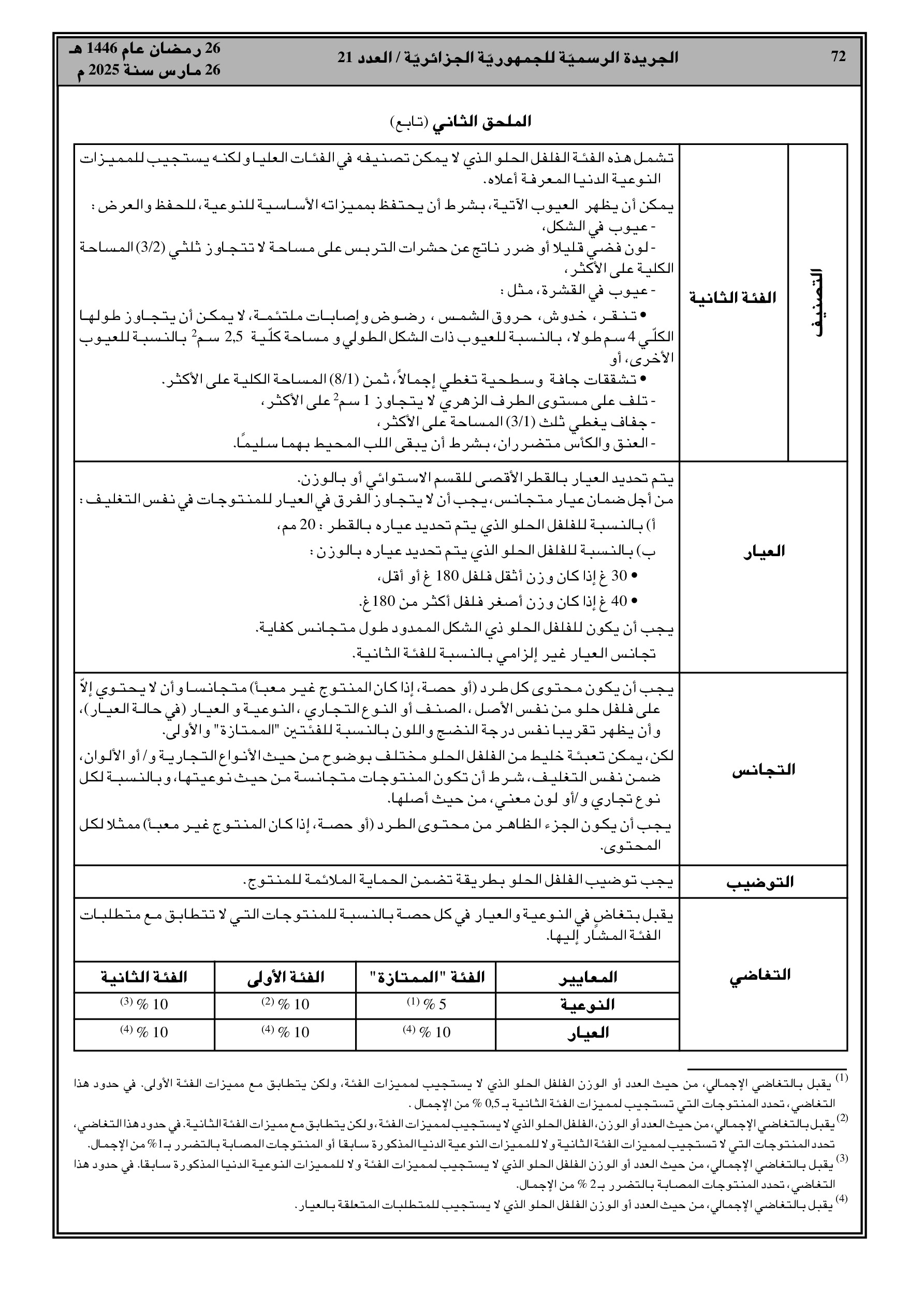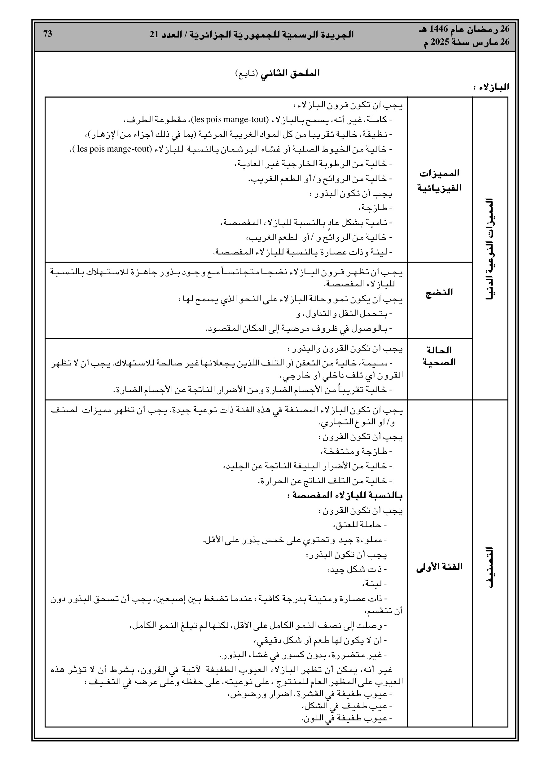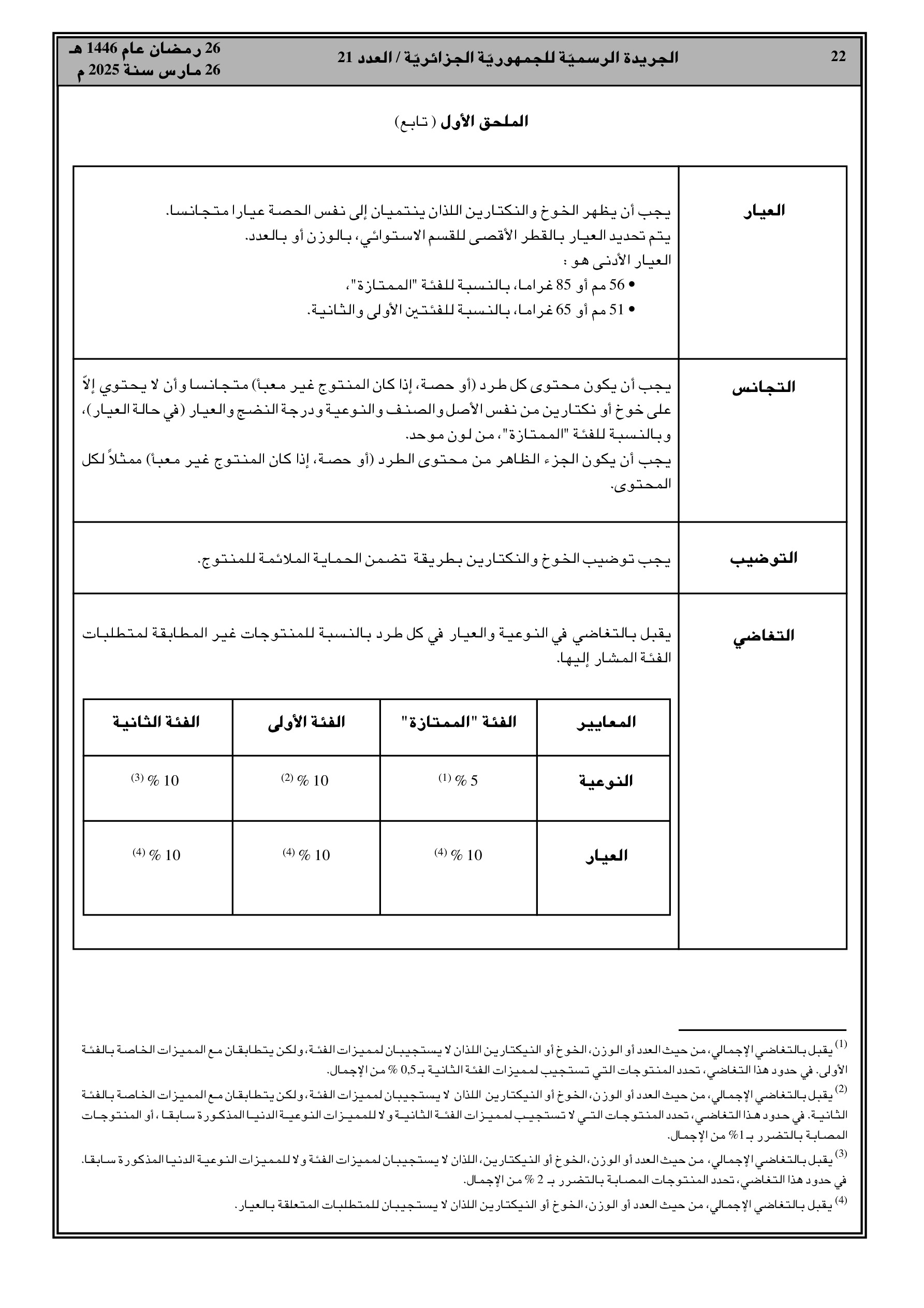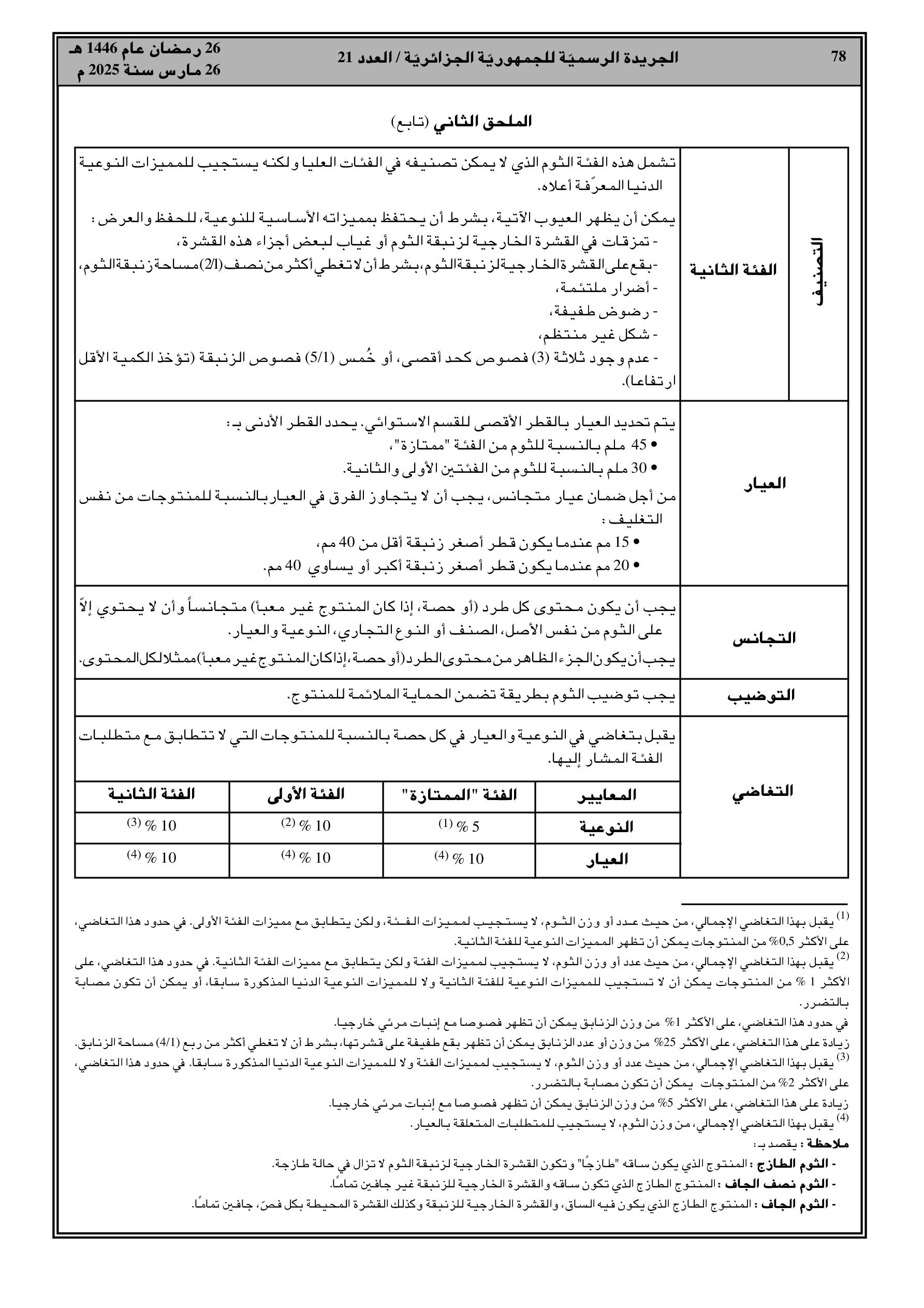 قرار وزاري مشترك يعتمد اللائحة الفنية التي تحدد المواصفات وشروط عرض الفواكه والخضر الطازجة الموجهة للاستهلاك البشري. يحدد المصطلحات الأساسية، متطلبات الجودة والنضج الدنيا، وشروط النقل، النظافة، والعرض. يحظر القرار المعالجات غير المصرح بها والتلوين الاصطناعي، ويحدد متطلبات التعبئة والتغليف والوسم. يلغي القرار المؤرخ في 8 يناير 1994، ويمنح مهلة امتثال لمدة عام واحد. الملحق الأول يפרّق الخصائص التفصيلية لعدة فواكه (مثل المشمش، الحمضيات، الخوخ، التفاح، العنب، الطماطم). الملحق الثاني يפרّق خصائص مختلف الخضروات (مثل الخرشوف، الجزر، القرنبيط، الباذنجان، الكوسة، البطاطس).